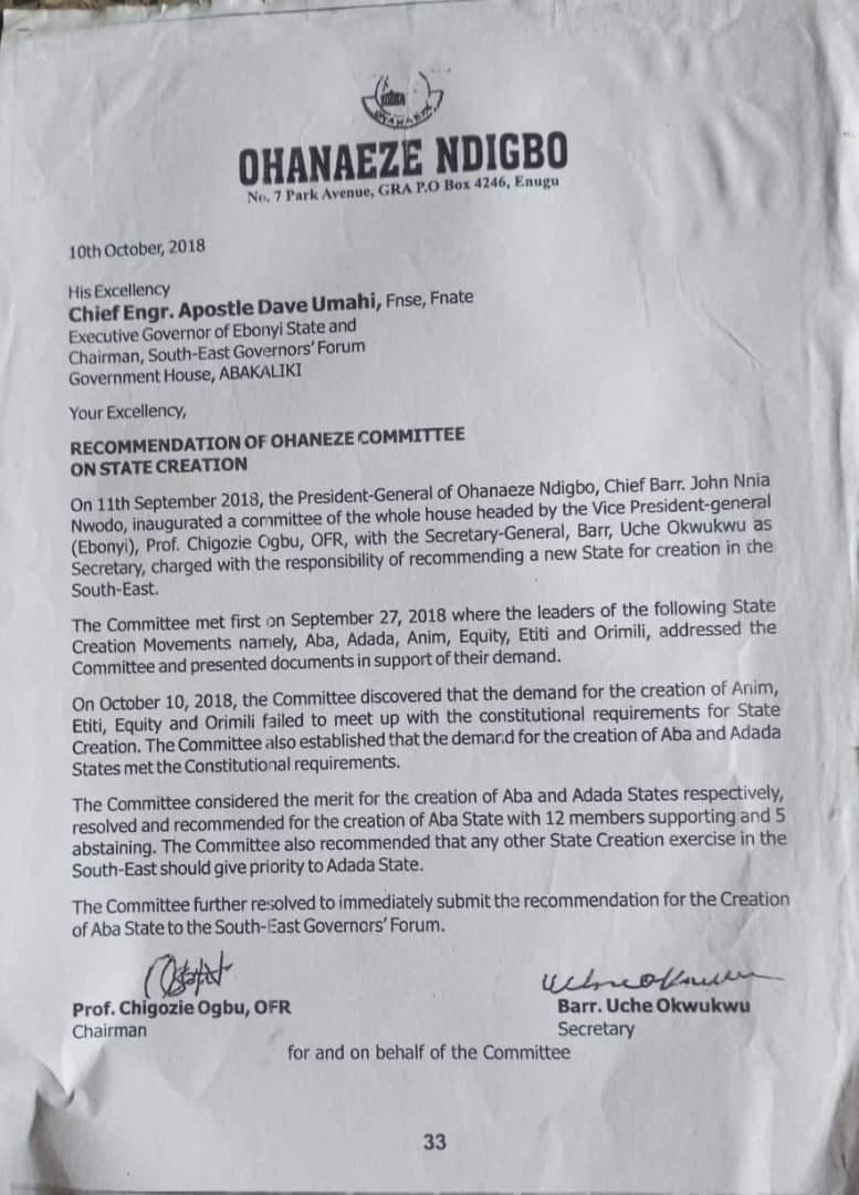 · 2018: Ohanaeze Ndigbo set up a similar Committee for the same purpose. Prof. Chigozie Ogbu, OFR, chaired the Committee. The Committee also recommended Aba State.