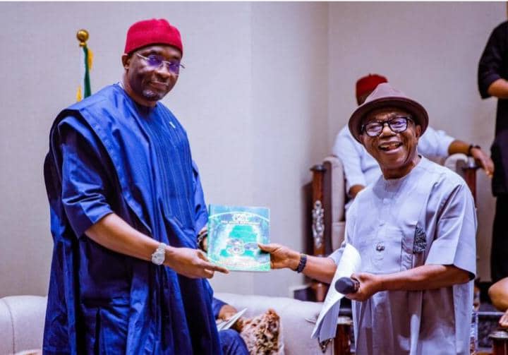 Chief Theo Nkire presenting the proposed Aba State documents to Distinguished Sen Barau Jibrin, Deputy Senate President. Seated is Sen Enyinnaya Abaribe.