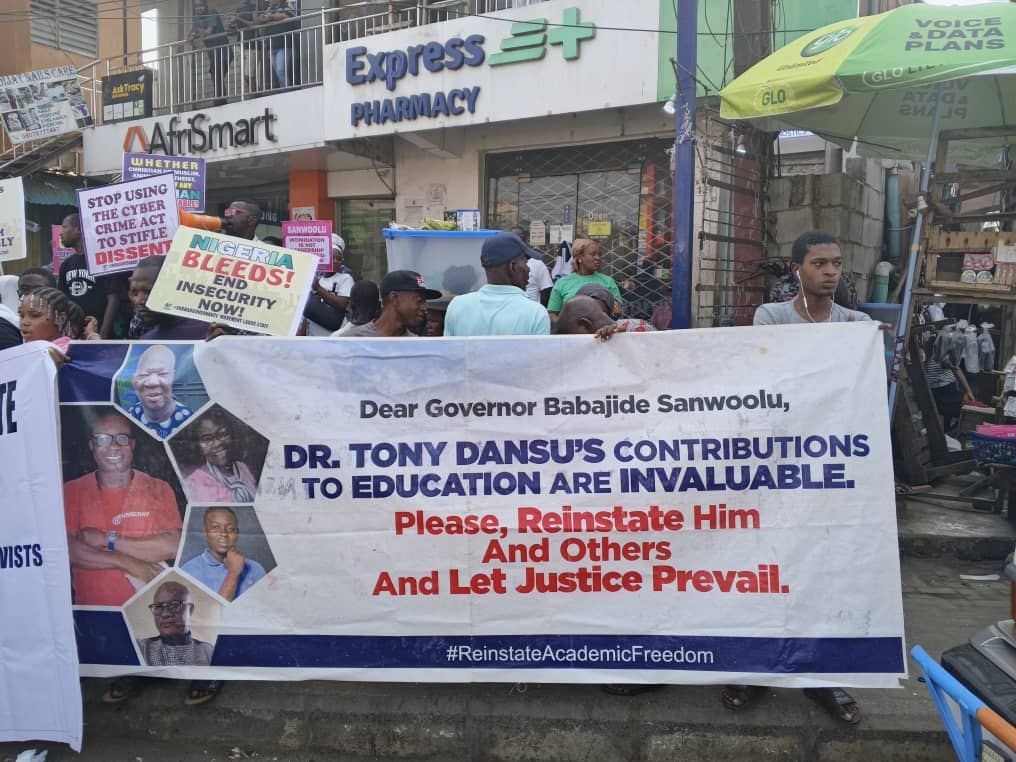 The demonstrators called on Babajide Sanwo-Olu, governor of Lagos, to reinstate the lecturers and put an end to their suffering.