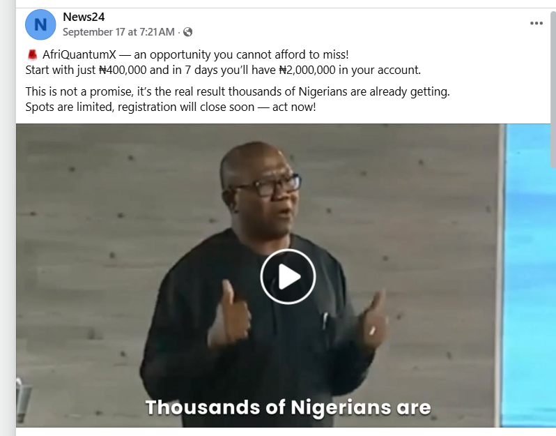 In September, a video showing Peter Obi, presidential candidate of the Labour Party (LP) in the 2023 elections, purportedly advertising an investment platform called “AfriQuantumX”, trended online.
