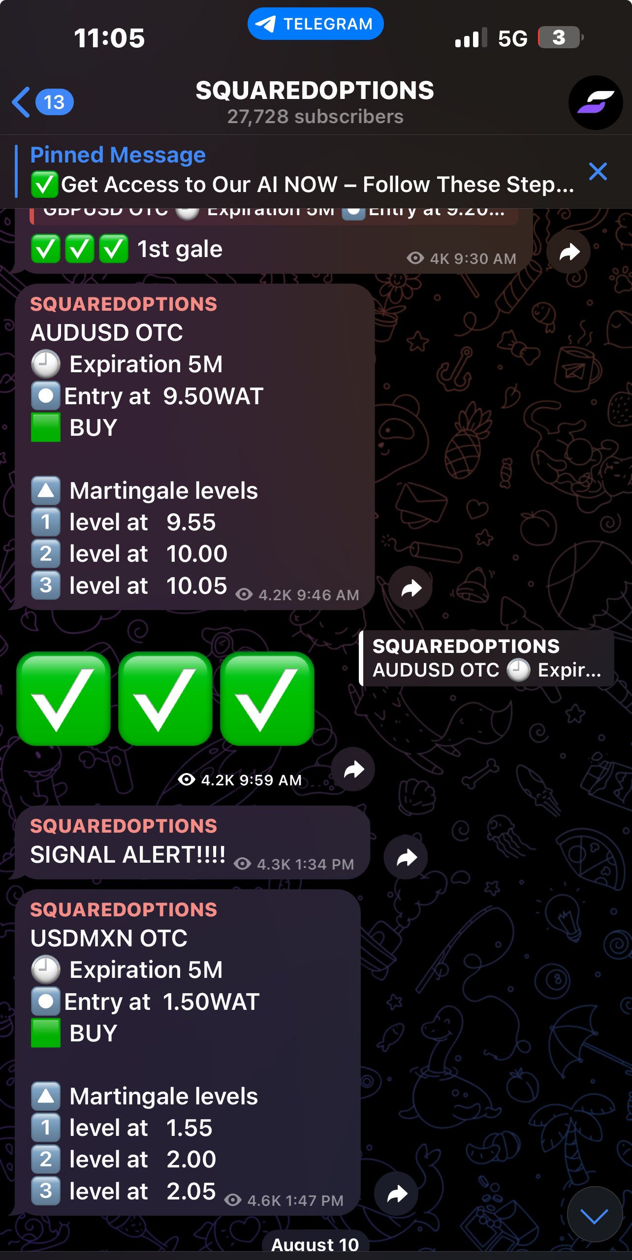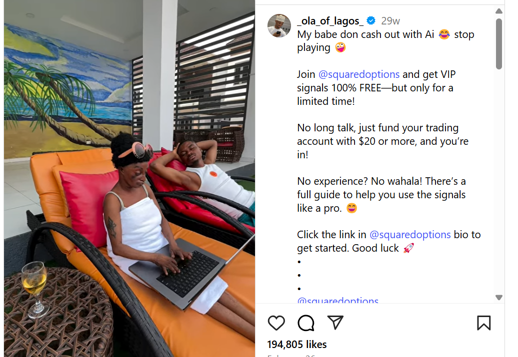 “Join @squaredoptions and get VIP signals 100% FREE—but only for a limited time!,” he posted, asking interested users to follow a Telegram group. “No experience? No wahala! There’s a full guide to help you use the signals like a pro.”