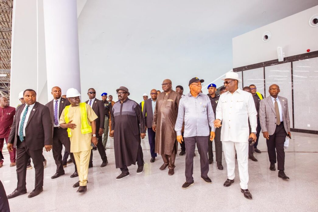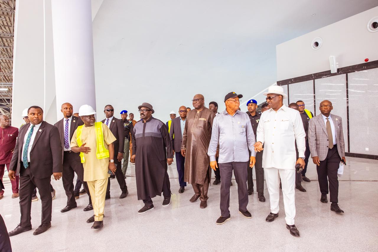 Umo Eno, governor of Akwa Ibom; Festus Keyamo, minister of aviation and aerospace development, anod other government officials on an inspection tour of the Victor Attah International Airport in Uyo on December 16, 2025