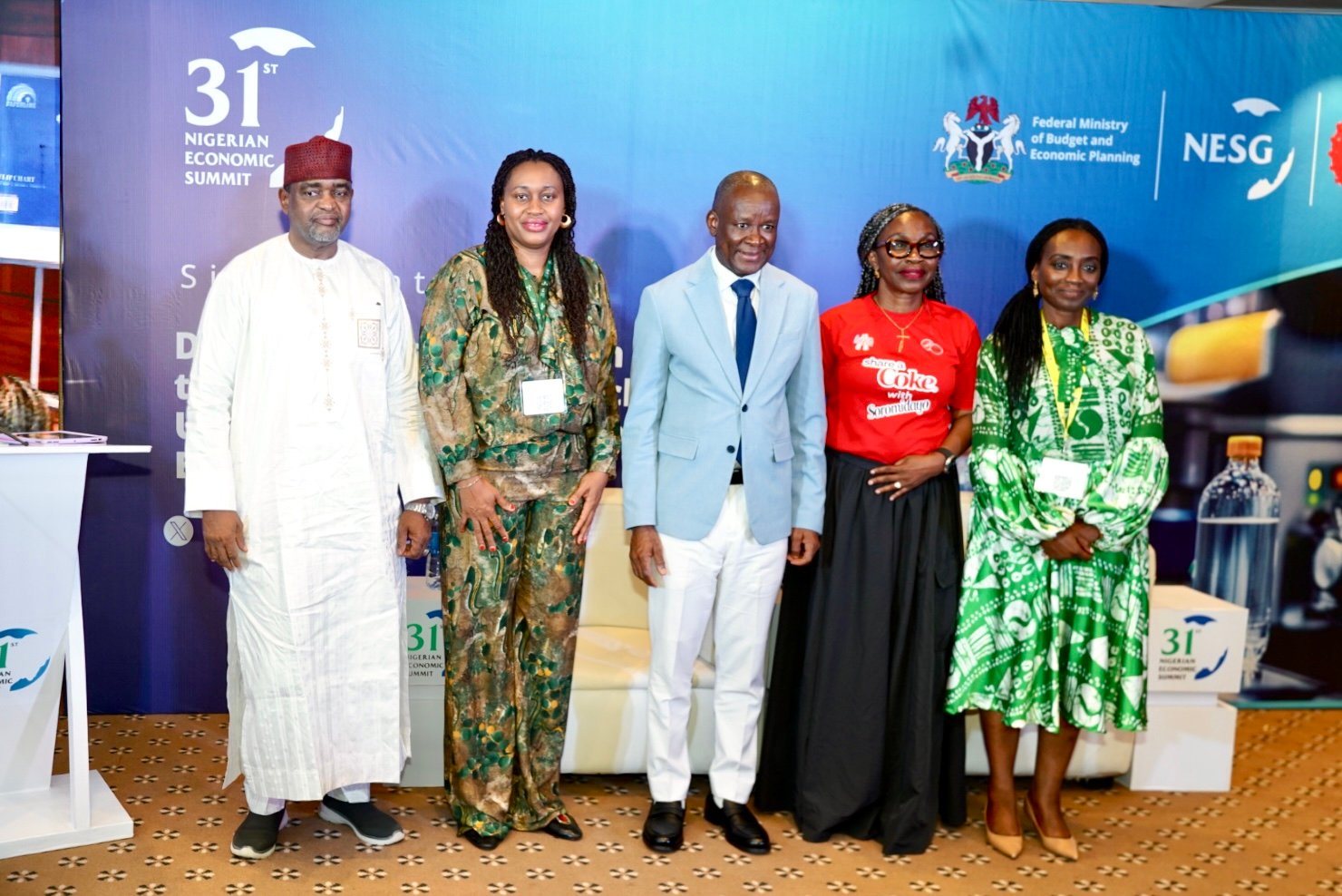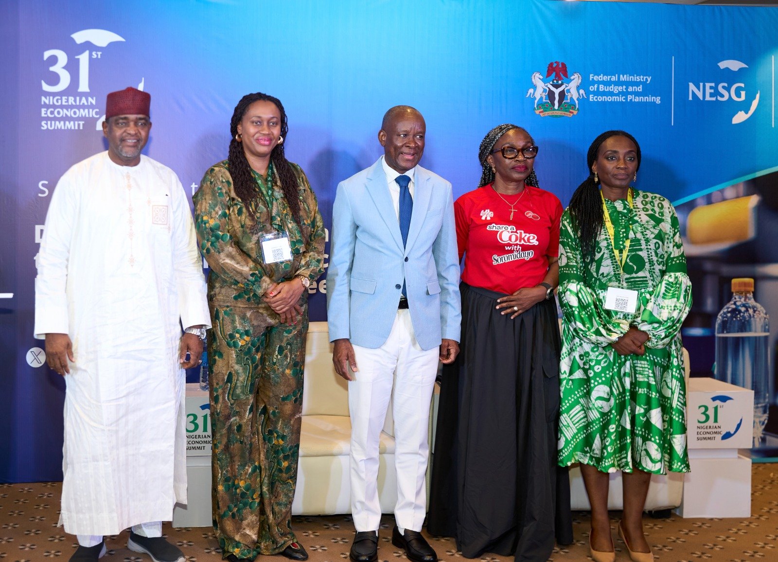 L-R: The Commissioner, Ministry for Commerce & Investment, Kano State, Hon. Shehu Wada Sagagi; the Senior Director, Public Affairs, Communications and Sustainability, Coca-Cola Nigeria, Amaka Onyemelukwe; the Minister of State for Industry, Senator John Owan Enoh; the Corporate Affairs and Sustainability Director, Nigerian Bottling Company, Soromidayo George; and CEO, RBI Perse Advisory Ltd/Co-Facilitator, Industrial Policy Commission, NESG, Amanda Lumun Feese during the NBC sponsored interactive session themed “Driving Industrialisation through circular PET packaging; Unlocking Nigeria’s Green Economy” at the ongoing 31st Nigerian Economic Summit held in Abuja today.