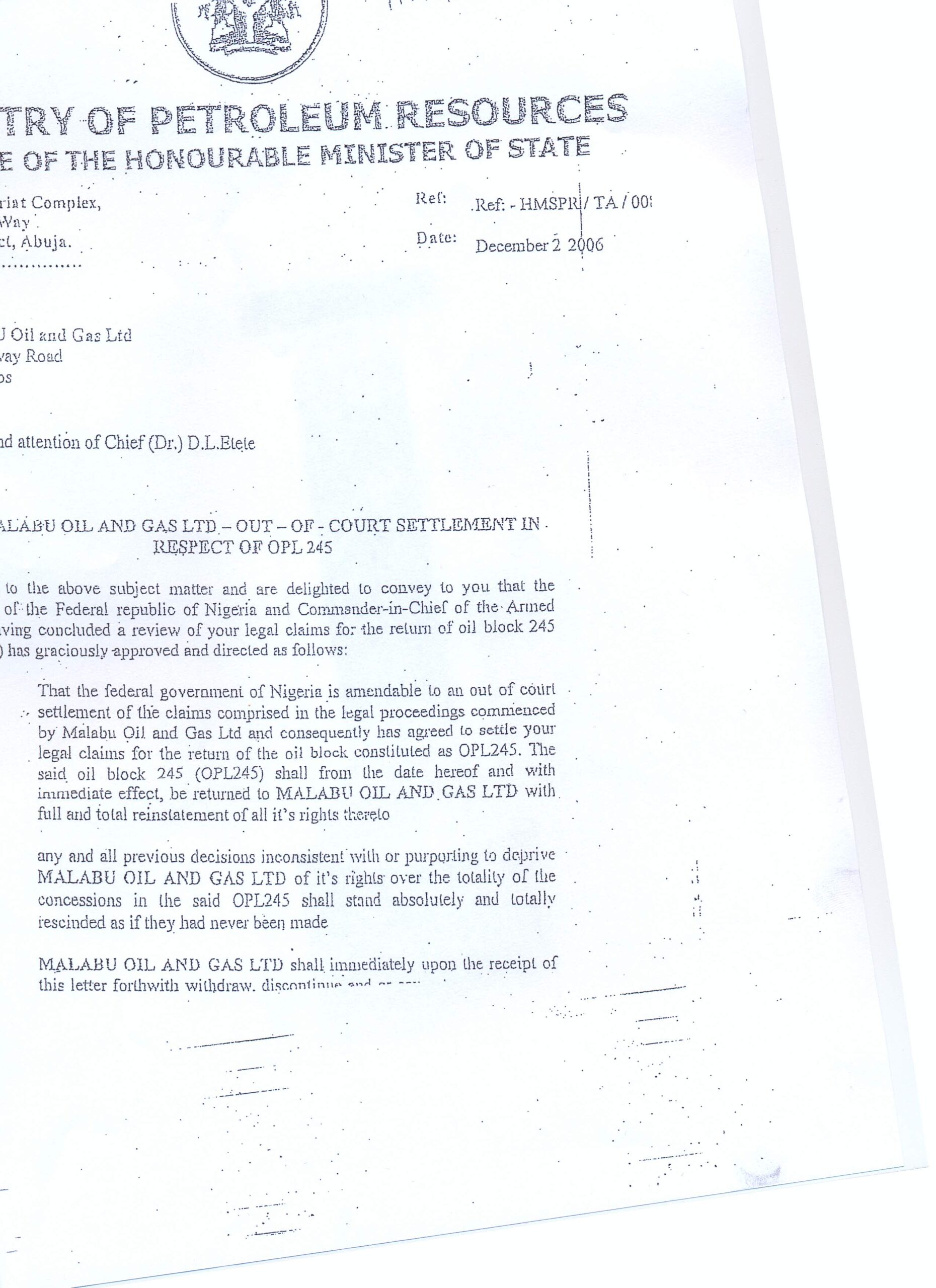 The letter, with the title “Malabu Oil and Gas Limited – out-of-court settlement in respect to OPL 245”, read: