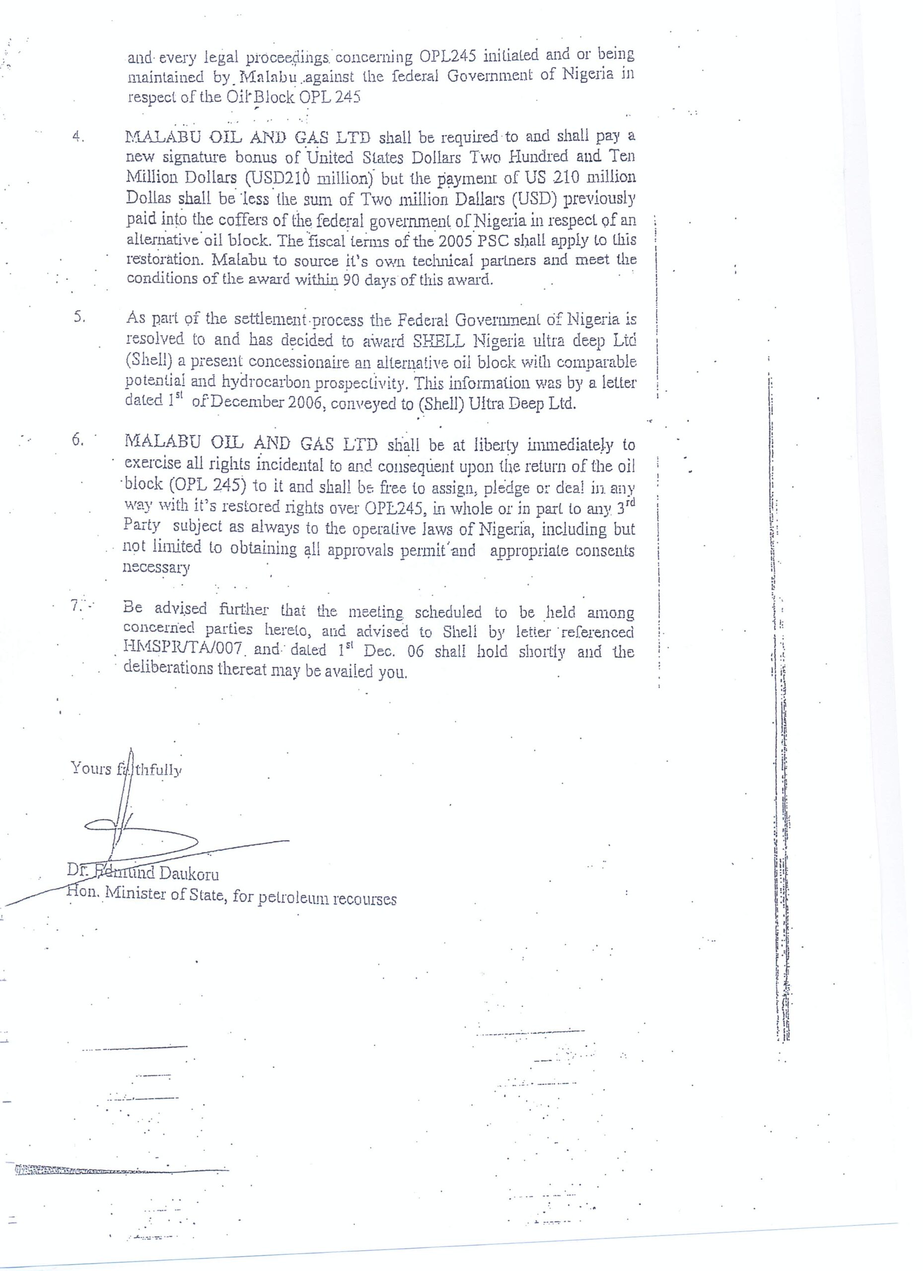 3. MALABU OIL AND GAS LTD shall immediately upon the receipt of this letter forthwith withdraw, discontinue and terminate all and every legal proceedings concerning OPL245 initiated and or being maintained by Malabu against the federal government of Nigeria in respect of Oil Block OPL 245.