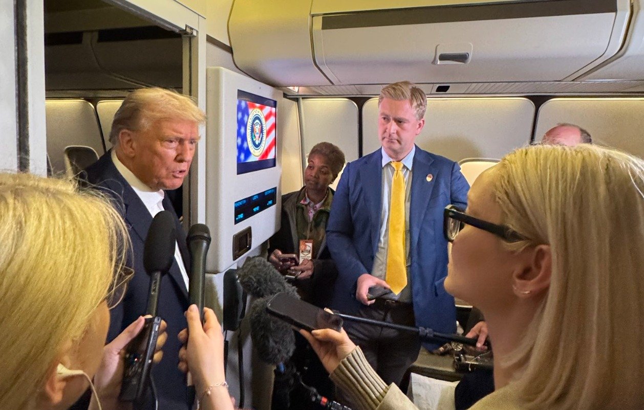 Donald Trump (2nd from left) speaking aboard Air Force One