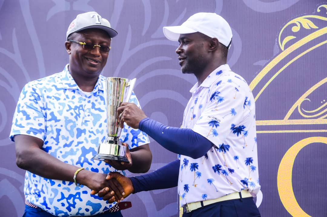 Francis Epe (right) receives his trophy as champion of CIO Golf Classic