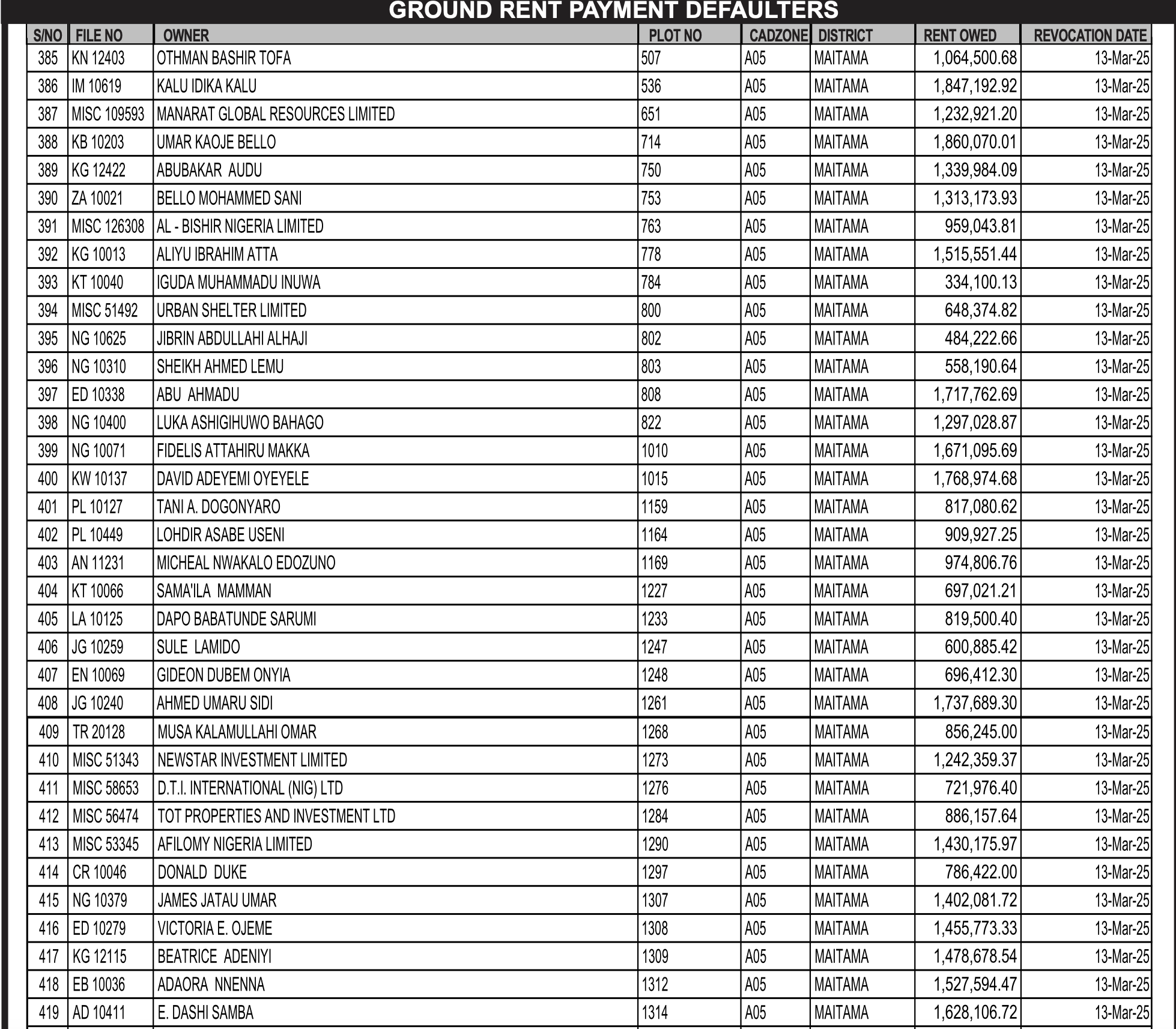 The Federal Capital Territory Administration (FCTA) has published the names of entities and individuals linked to 1,095 property titles recently revoked over the non-payment of statutory land charges.