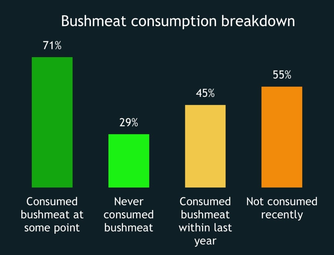 In 2020, WildAid carried out a survey of 2,000 people across Lagos, Abuja, Port Harcourt and Calabar. Results found that 71 percent of urban Nigerians have eaten bushmeat at some point in their lives, and 45 percent consumed it within the previous year.