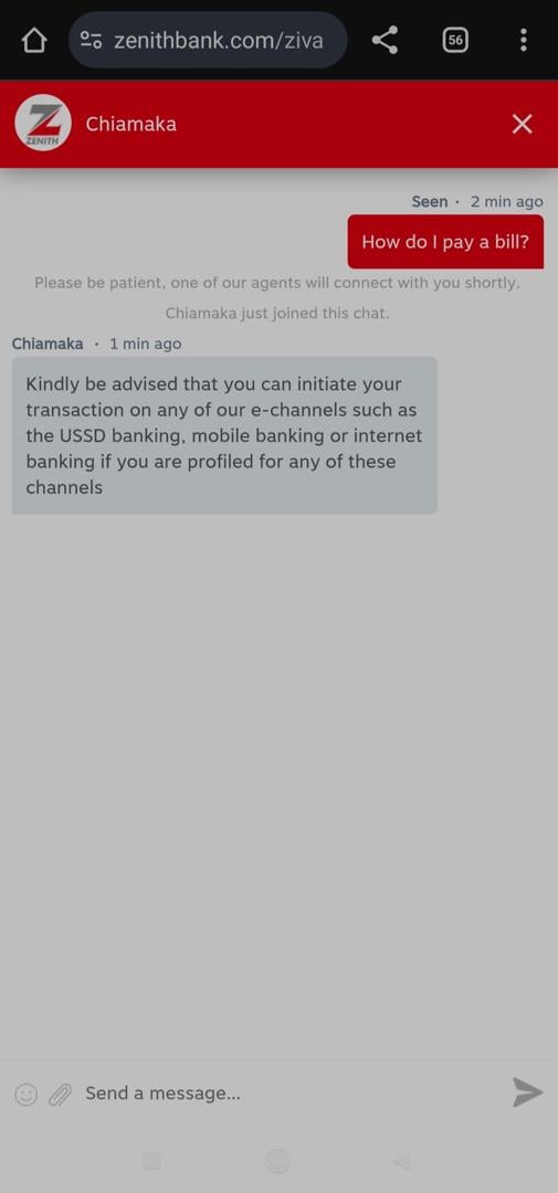 A chatbot should be able to provide instant answers to frequently asked questions and only refer customers to a human when required. However, the handoff mechanism seemed to be a first rather than a last resort for bots such as Tamada from Access Bank and Ziva from Zenith Bank. Ziva made no effort to offer guidance when a simple, everyday question like “How do I pay a bill?” was posed. Instead, its prompt and sole response was, “Please be patient; one of our agents will connect with you shortly.” This pattern points to a chatbot system lacking even a rudimentary knowledge base for essential banking operations.
