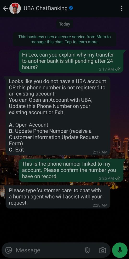 FirstBank (Fibani) | FAQ Loop | “Why is my interbank transfer still pending?” | (After FAQ prompt) “You can transfer funds 24/7 from your mobile app.” | Core issue ignored. A generic, unhelpful response was provided. |