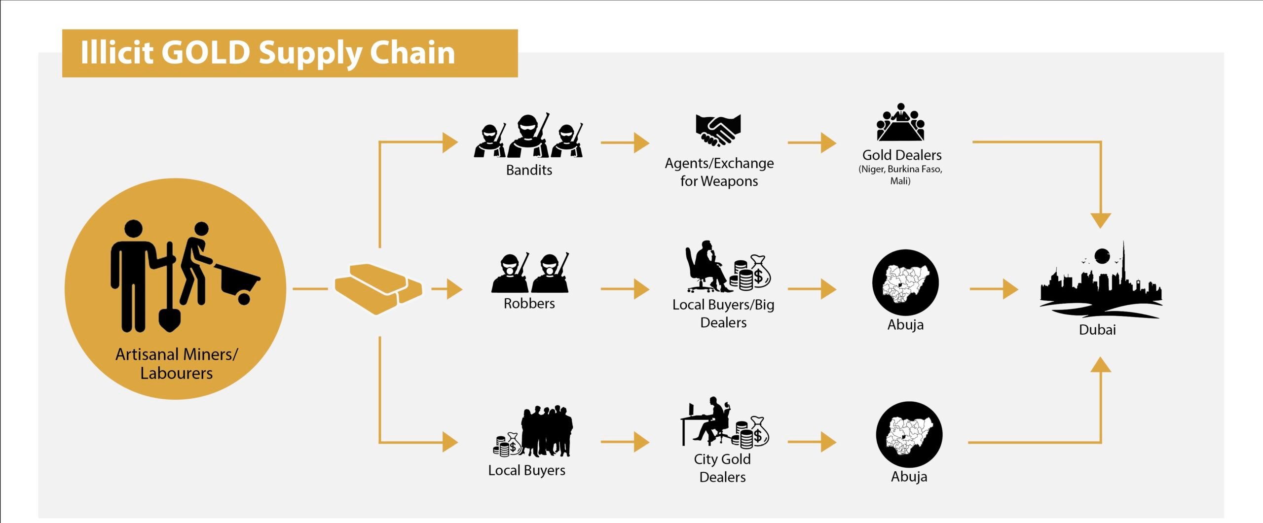Explaining their role, bandit leader Kachalla Mati said gold from his controlled mining fields in Anka is stockpiled for weeks, then smuggled through the Nigeria/Niger border into the Sahel. Through this route, the gold indirectly makes its way to Dubai.