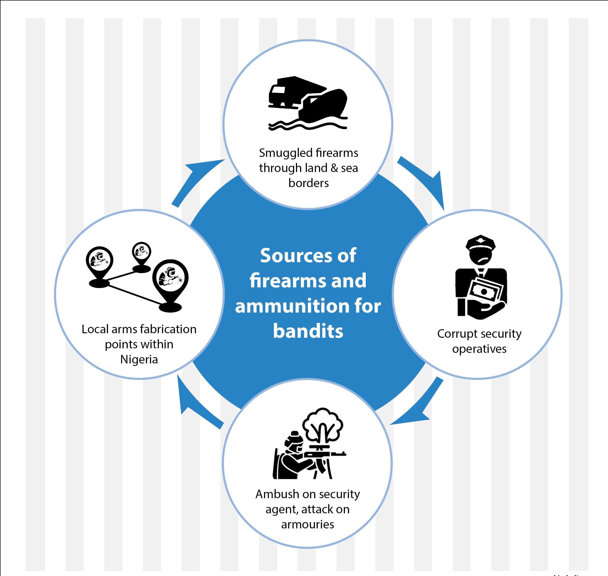 However, apart from smuggled firearms, the federal government has acknowledged that a wide range of weapons used by non-state actors, including bandits, were sold to them by corrupt security agents. Speaking on this, Adamu said that though a bulk of the weaponry is smuggled through the land and sea borders, other sources include local manufacturing points where weapons such as the AK-47 are fabricated, as well as those sold by corrupt security officials.
