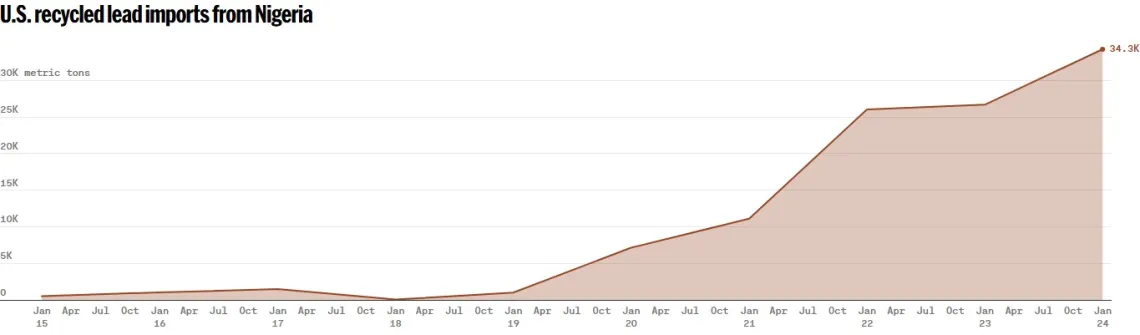 According to United Nations data, Nigeria led Africa in recycled lead exports between 2019 and 2023. The same data show that the United States imported the largest net weight of recycled lead from Nigeria during this period.