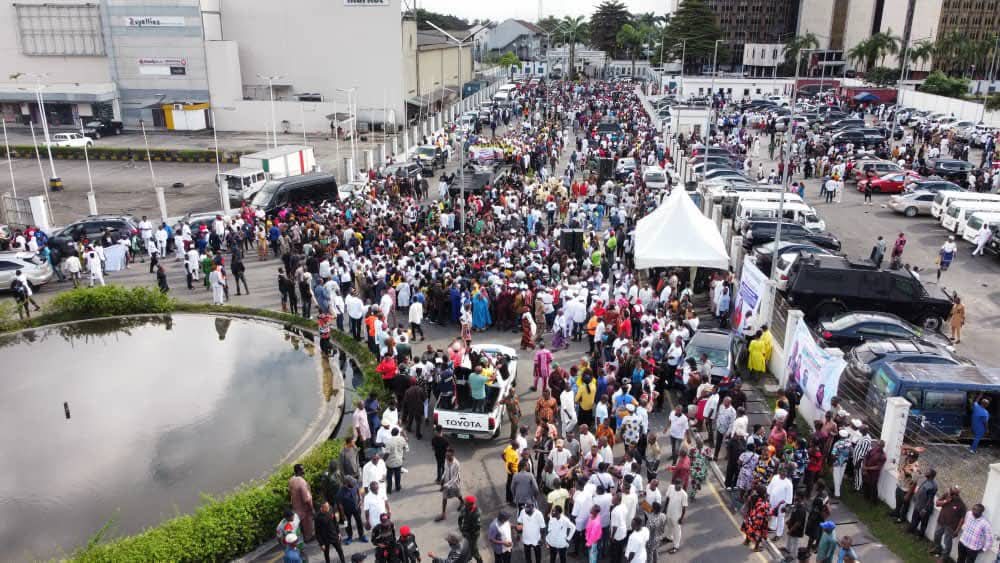A large crowd has gathered in front of the Rivers state government house in Port Harcourt to welcome back Siminalayi Fubara as governor of the state.