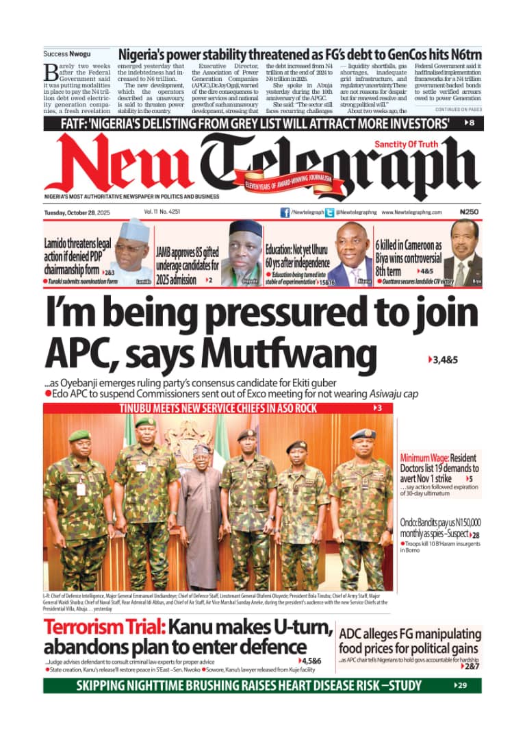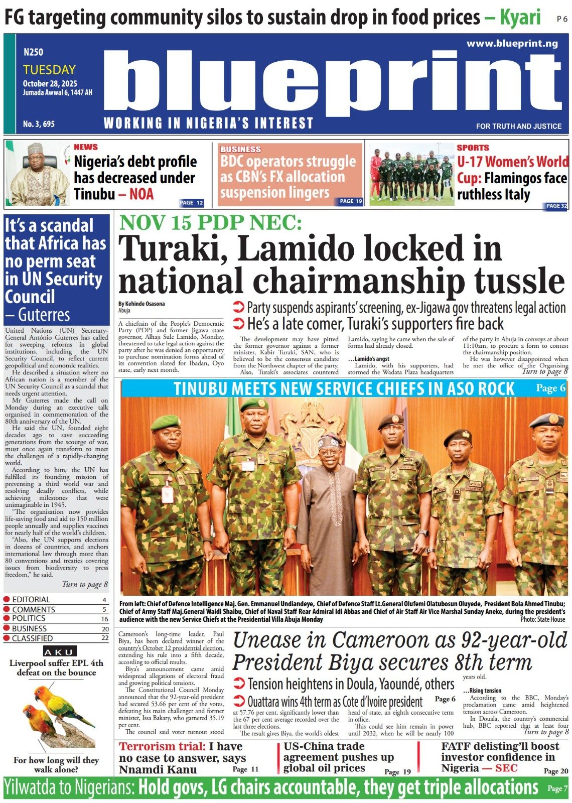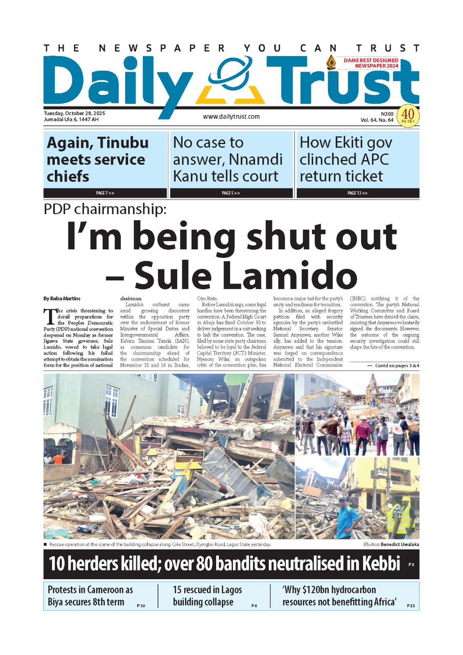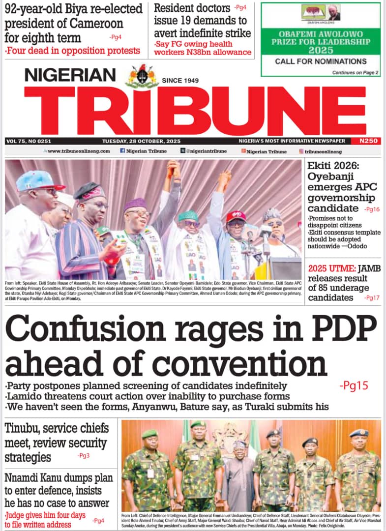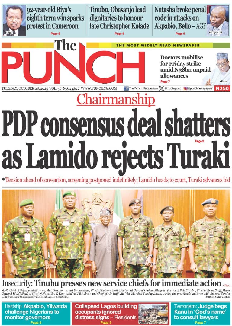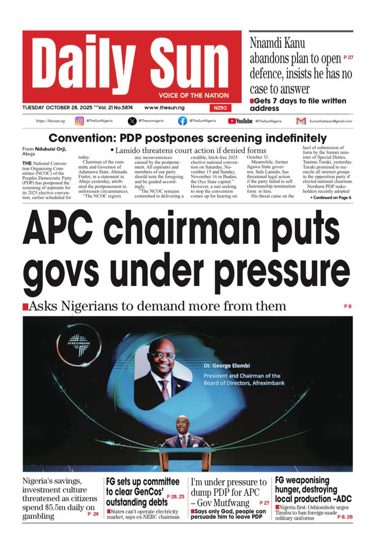 Reports on the lingering crisis in the Peoples Democratic Party (PDP) ahead of its national convention dominate the frontpages of today’s newspapers.
