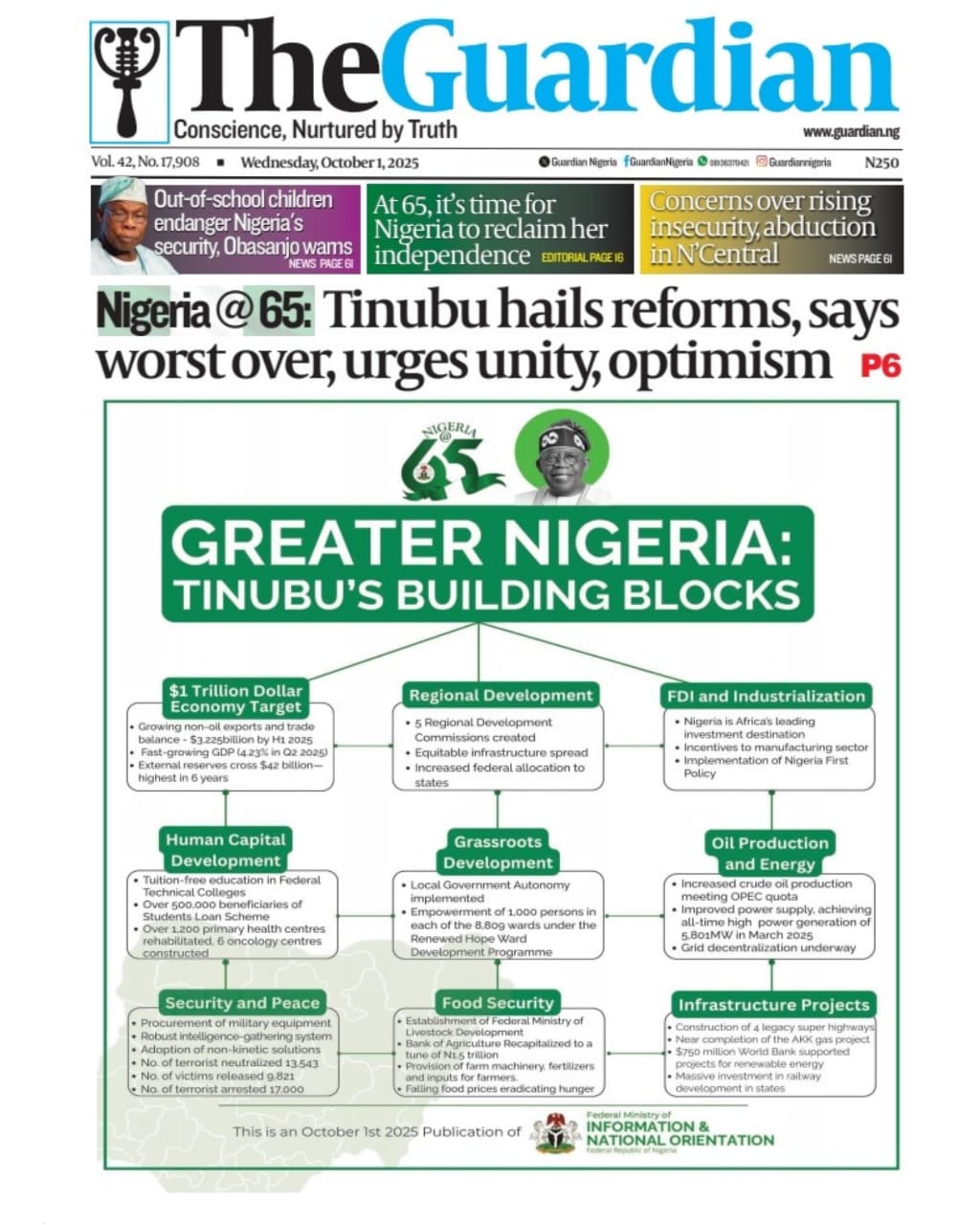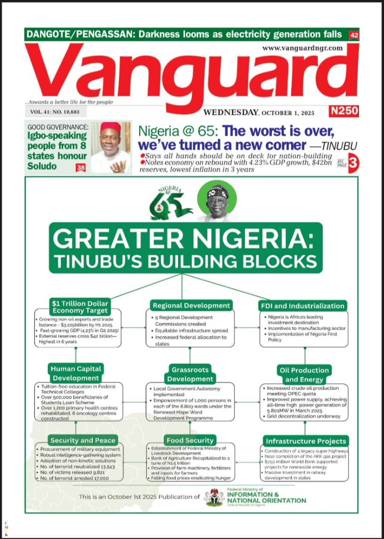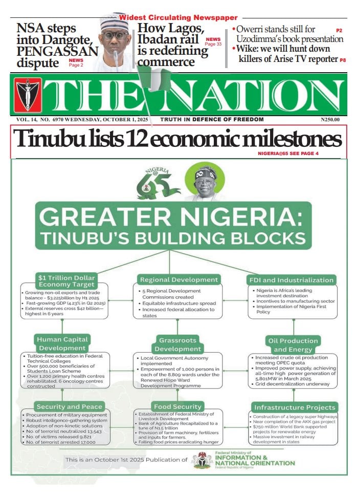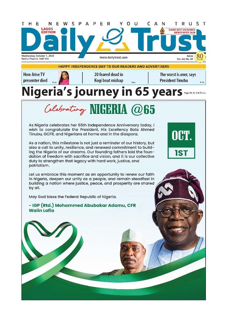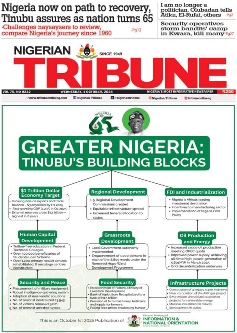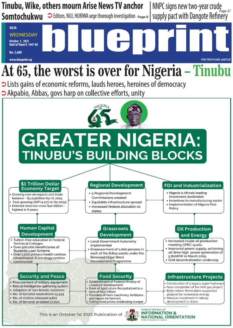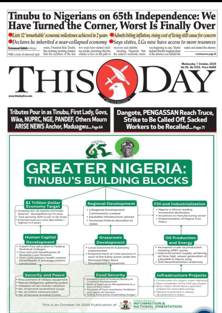 The commemoration of Nigeria’s 65th independence anniversary, alongside President Bola Tinubu’s reel out of his administration’s milestones, permeate the front pages today.