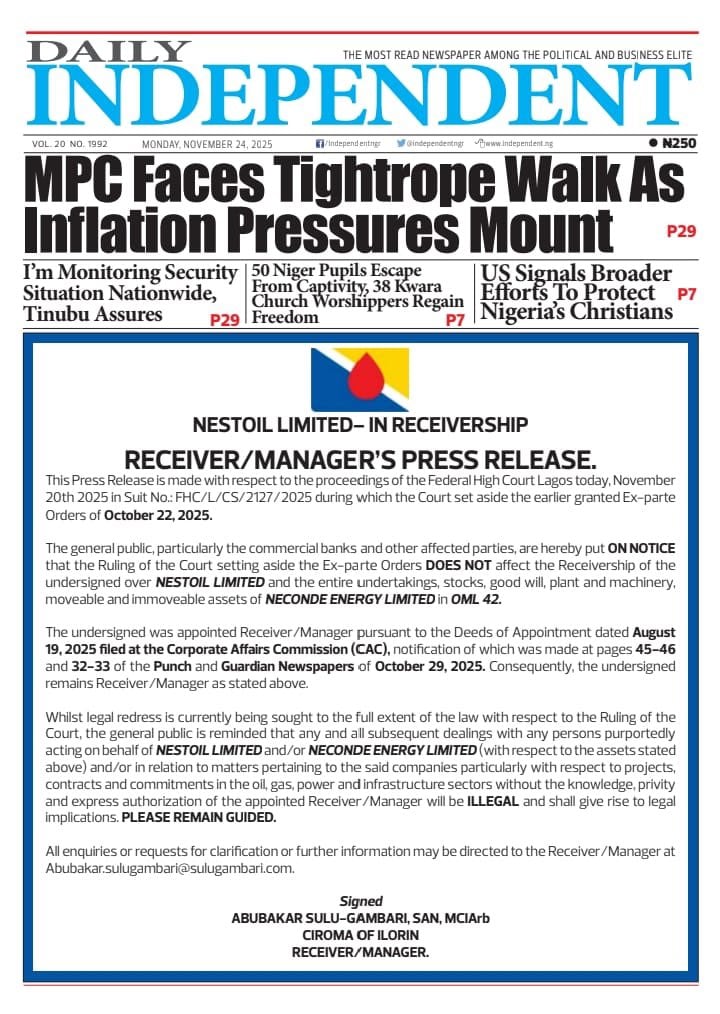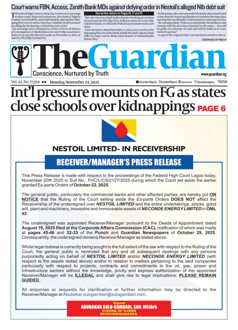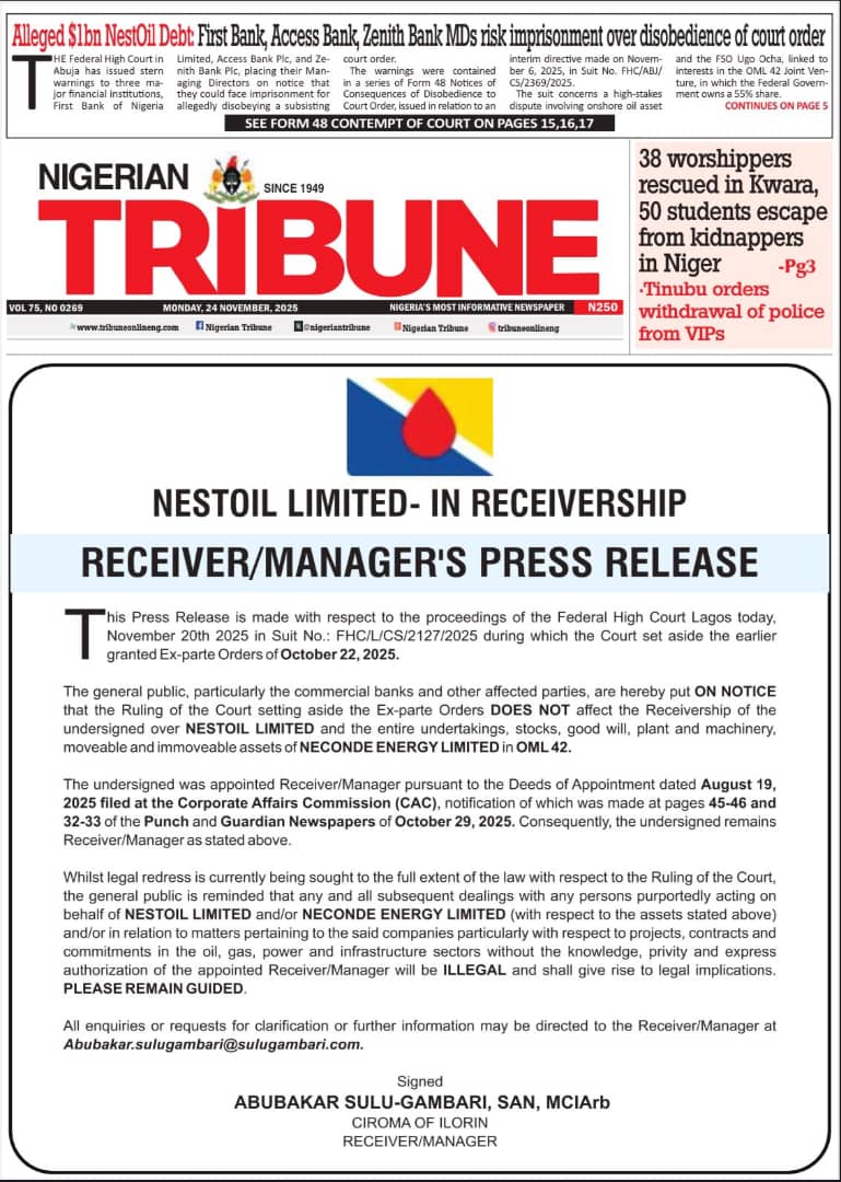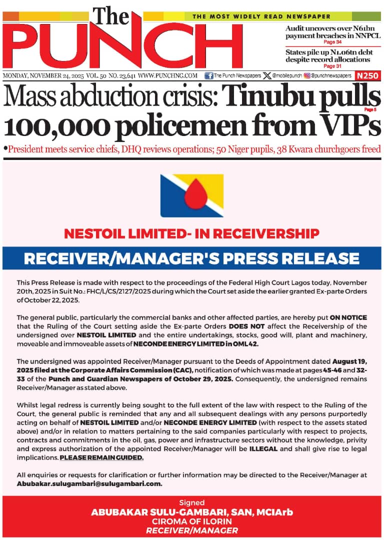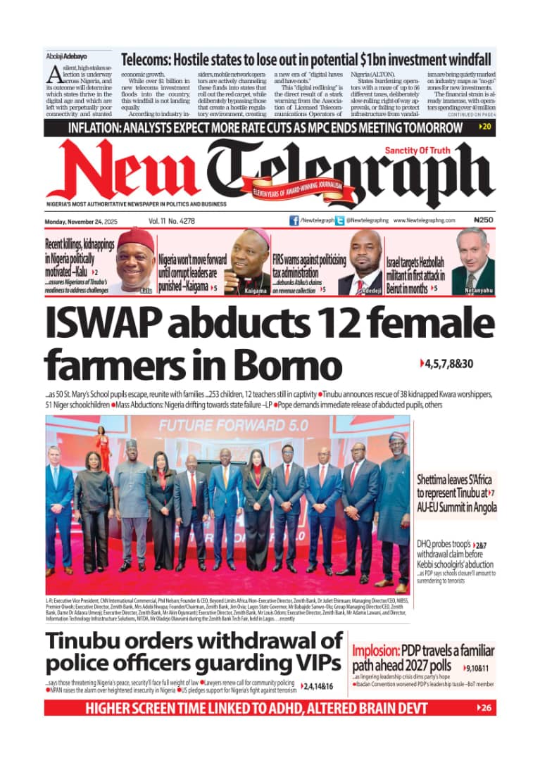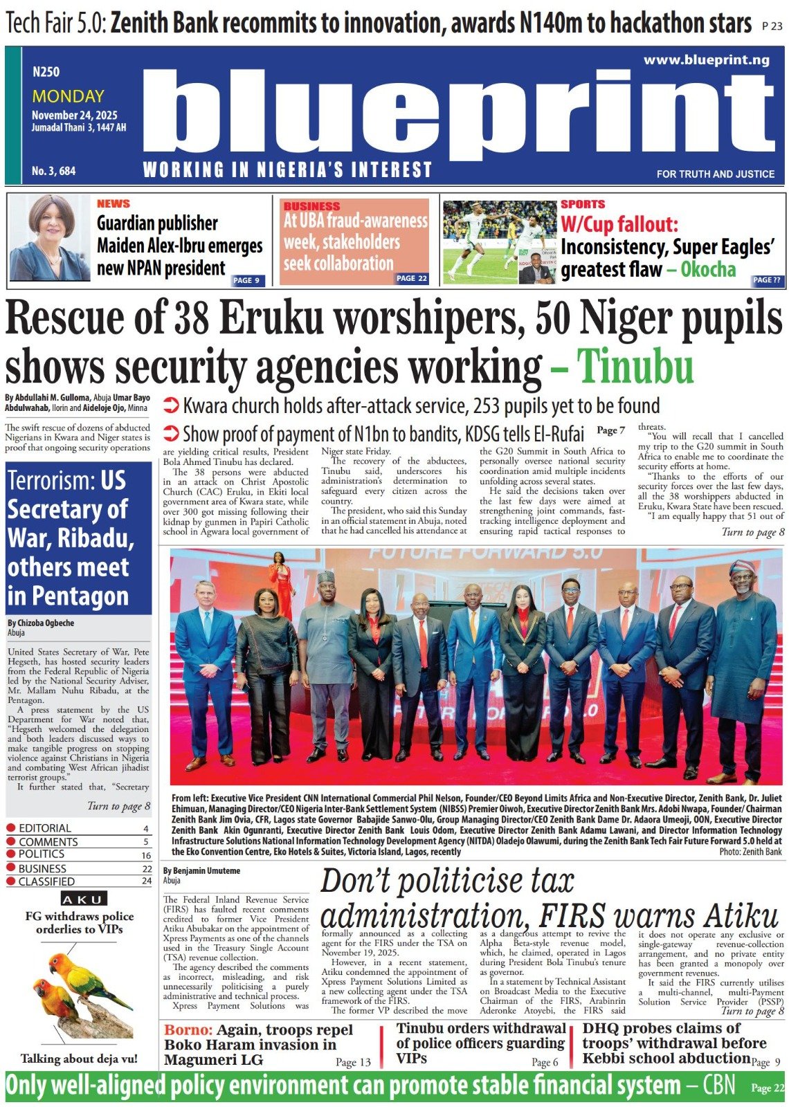 Blueprint reports that the Federal Inland Revenue Service (FIRS) has dismissed former vice-president Atiku Abubakar’s recent claims regarding the appointment of Xpress Payments Solutions Limited as a channel for the treasury single account (TSA) revenue collection. The paper says the Defence Headquarters (DHQ) has opened a probe into Nasir Idris’ claim that troops withdrew before the 25 schoolgirls were abducted.Nigerian Tribune reports that President Bola Tinubu says all the 38 worshippers abducted in Eruku, Kwara state, have been rescued. The paper adds that Tinubu has ordered the immediate withdrawal of police officers attached to VIPs across the country.Daily Trust reports that suspected Boko Haram members abducted 13 people in Mussa, Askira/Uba LGA of Borno, on Saturday.New Telegraph reports that Ignatius Kaigama, the Archbishop of the Catholic Archdiocese of Abuja, says things would not move forward in the country until corrupt leaders are punished. The paper adds that Vice-President Kashim Shettima has departed Johannesburg for Luanda to represent Tinubu at the AU-EU Summit in Angola.PUNCH reports that the Office of the auditor-general of the federation (AGF) has uncovered 28 major financial irregularities linked to the Nigerian National Petroleum Company (NNPC) Limited, including N30.1 billion, $51.6 million, £14.3 million, and €5.17 million in questionable payments, undocumented expenditures, and breaches of financial regulations. The paper says states across the country owe contractors and retirees a combined N1.06 trillion in outstanding obligations despite receiving record revenue inflows in 2024, according to new data from BudgIT’s 2025 State of States report.Nigerian Tribune reports that Tinubu has ordered the immediate withdrawal of police officers attached to VIPs across the country.Daily Independent reports that the United States has affirmed its commitment to partnering with Nigeria in the fight against terrorism, after a high-level security meeting at the Pentagon on November 20.Guardian reports that the federal high court in Abuja has issued stern warnings to three major financial institutions — First Bank, Access Bank, and Zenith Bank — placing their managing directors on notice that they could face imprisonment for allegedly disobeying a subsisting court order.