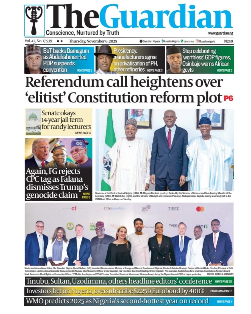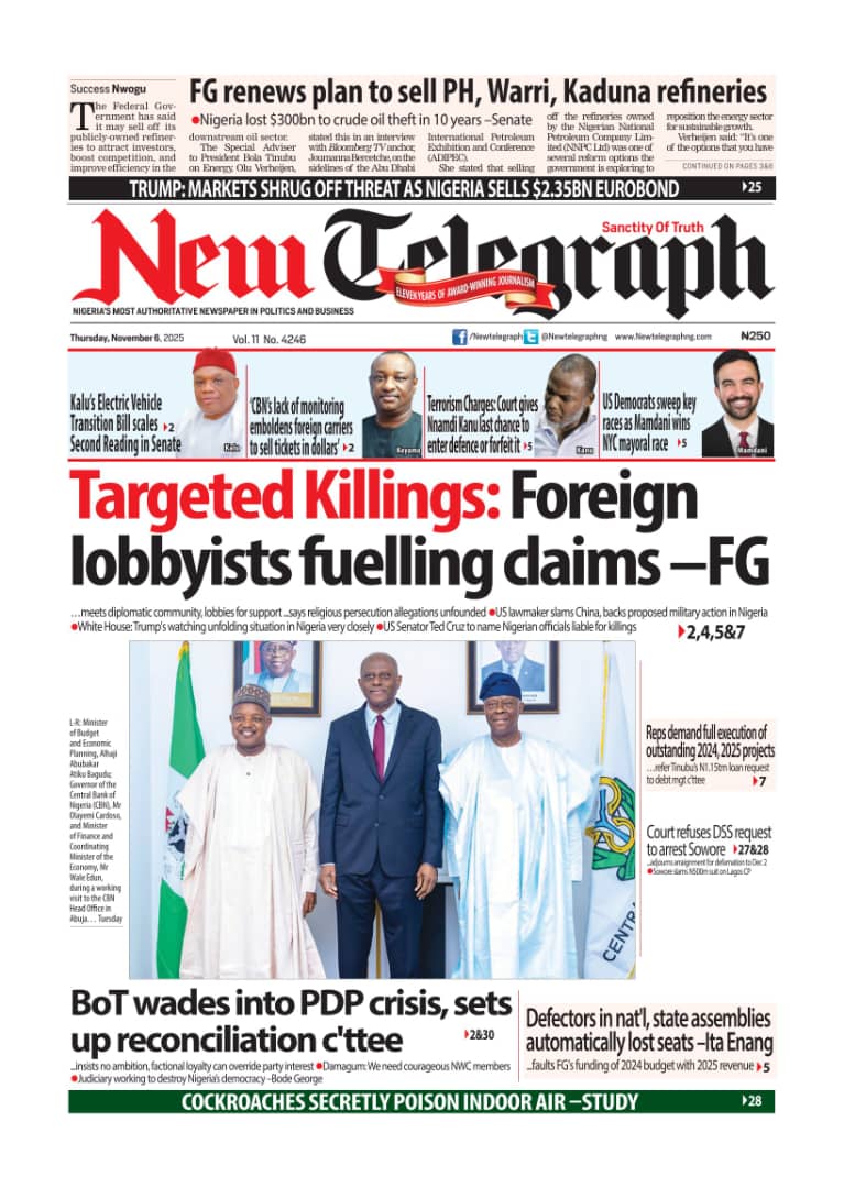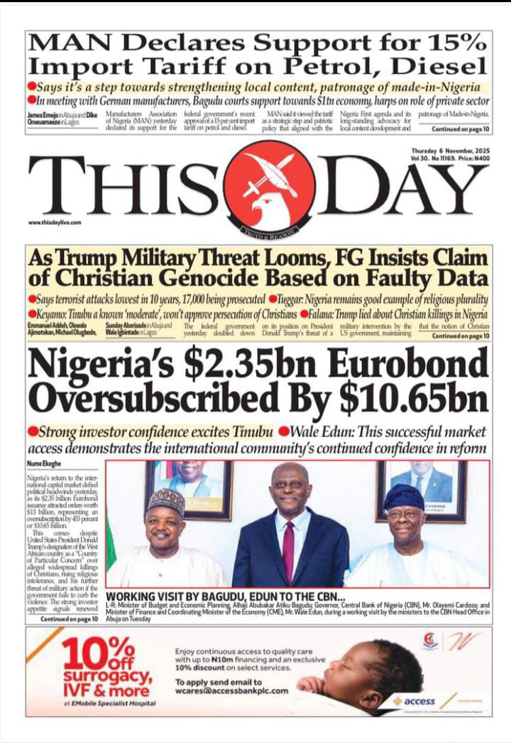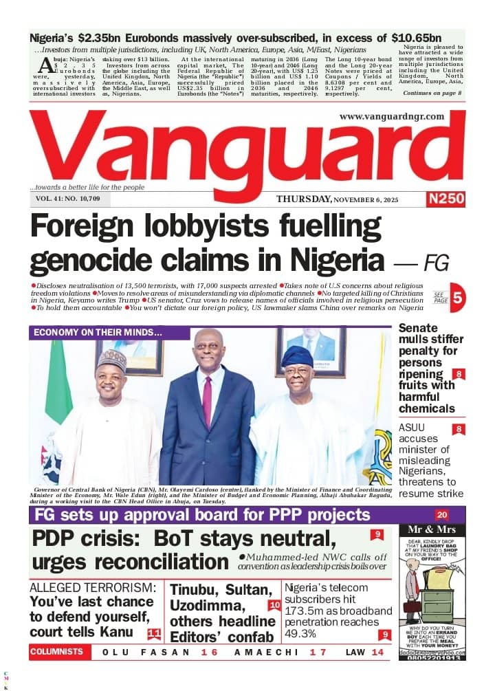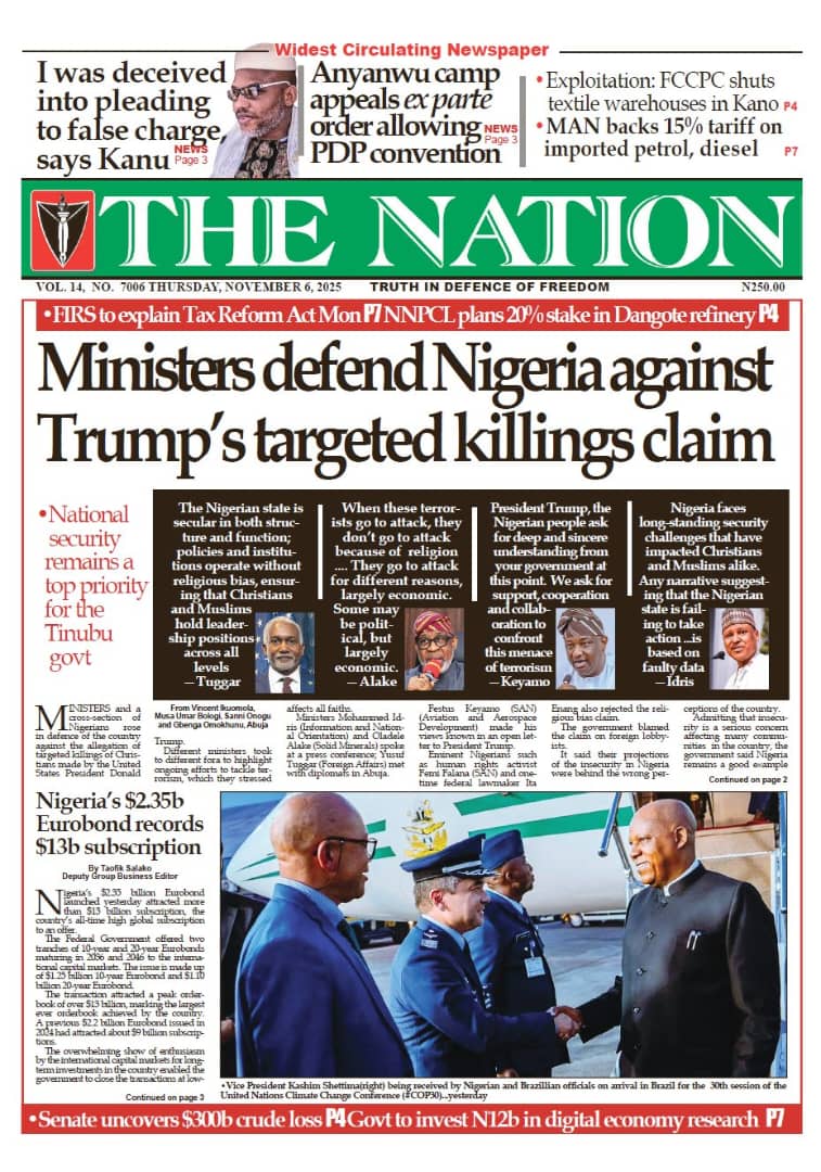 ThisDay reports that the Manufacturers Association of Nigeria (MAN) says counterfeiting and the influx of cheap imports are some of the factors stifling competitiveness in the textile and leather industry. The paper says Nigeria’s return to the international capital market defied political headwinds, as its $2.35 billion Eurobond issuance attracted orders worth $13 billion — representing an oversubscription of 453 percent, or $10.65 billion.Blueprint newspaper reports that the senate has approved the sexual harassment of students (Prevention and Prohibition) Bill, 2025, which prescribes up to 14 years’ imprisonment for educators convicted of sexually harassing students in tertiary institutions. The paper says the senate has received the interim report of its ad hoc committee investigating crude oil theft and related sabotage in the Niger Delta.Daily Trust reports that Abdullahi Mohammed, former chief of staff to Presidents Olusegun Obasanjo and Umaru Yar’Adua, is dead. The newspaper reports that the Adamawa state government has confirmed a cholera outbreak in Mubi LGA, which has claimed 10 lives so far.The Guardian newspaper reports that former Vice President Yemi Osinbajo has cautioned African governments against celebrating Gross Domestic Product (GDP) growth figures that do not translate into improved living conditions for citizens. The paper adds that Olu Verheijen, special adviser to President Bola Tinubu on energy, says the federal government is open to selling the refineries of the Nigerian National Petroleum Company (NNPC) Limited.PUNCH reports that the crisis rocking the Peoples Democratic Party (PDP) is far from over as the faction loyal to Nyesom Wike insists that the national convention of the party slated for Ibadan, the Oyo state capital between November 15 and 16, will not hold. The newspaper says about two months before his tenure ends, at least five aspirants have reportedly entered the contest to replace Buba Marwa, chairman of the National Drug Law Enforcement Agency (NDLEA).Vanguard newspaper reports that Mohammed Idris, the minister of information and national orientation, says foreign lobbyists are fuelling the narrative of a “Christian genocide” in Nigeria. The paper says that Tinubu has directed the education ministry to resolve the ongoing Academic Staff Union of Universities (ASUU) strike immediately.Daily Sun reports that the Catholic Diocese of Auchi has confirmed the death of Emmanuel Alabi, one of the three junior seminarians abducted by gunmen earlier this year. The newspaper says Omoyele Sowore, human rights activist, has alleged that the federal government is plotting to sentence Nnamdi Kanu, the detained leader of the Indigenous People of Biafra (IPOB), to death.The Nation reports that Kanu told the court that he was misguided to enter a plea into a charge that does not exist. The newspaper adds that Abdulrahman Mohammed, acting national chairman of the PDP factional NWC, has appealed an Ibadan court order approving Umar Damagum’s planned convention.New Telegraph reports that the board of trustees (BoT) of the PDP has set up a committee to reconcile warring factions within the party. The paper adds that the federal high court in Abuja on Wednesday declined a request by the Department of State Services (DSS) to issue a bench warrant for the arrest of Sowore, activist and publisher, who is facing five counts of criminal defamation.Nigerian Tribune reports that Femi Falana, a senior advocate of Nigeria(SAN), has accused the United States President Donald Trump of lying to the world regarding his claim of targeted killing of Christians in Nigeria. The newspaper says Yusuf Tuggar, minister of foreign affairs, says it is “impossible” for the Nigerian government to persecute any citizen on the basis of religion.