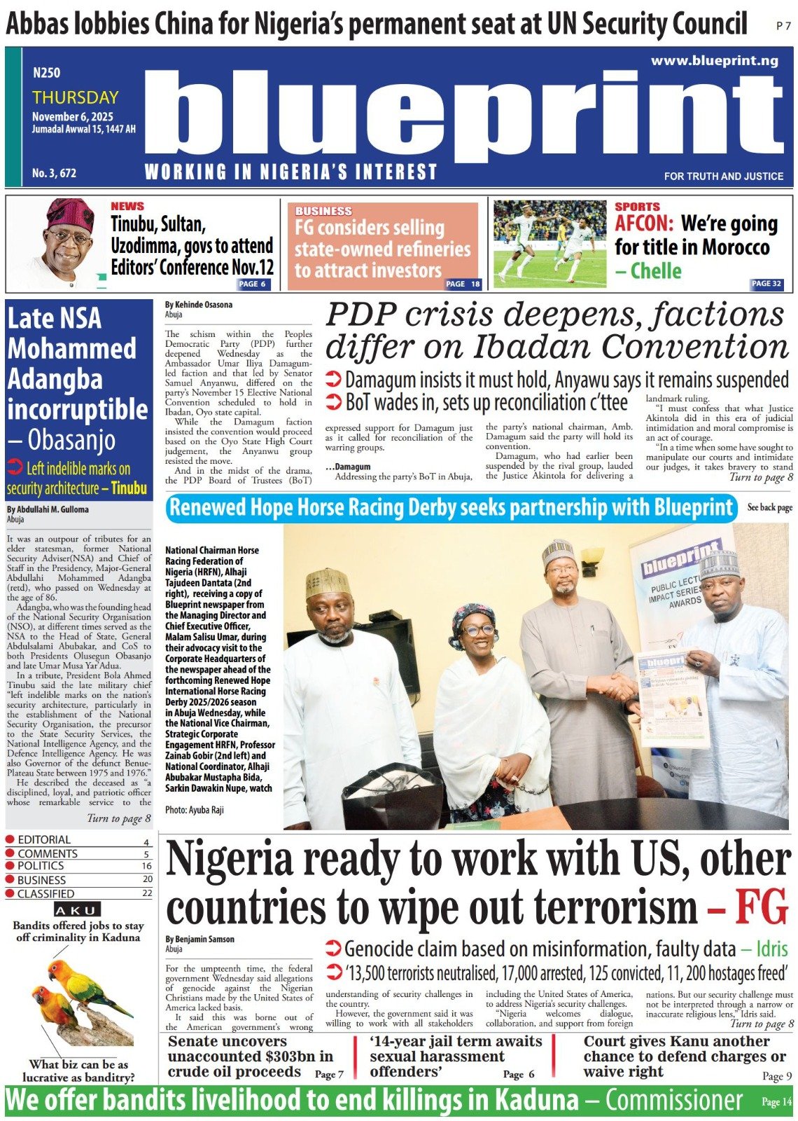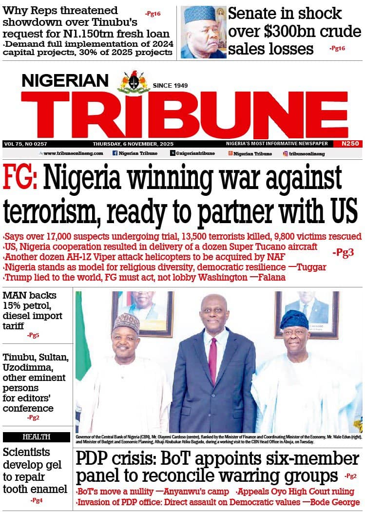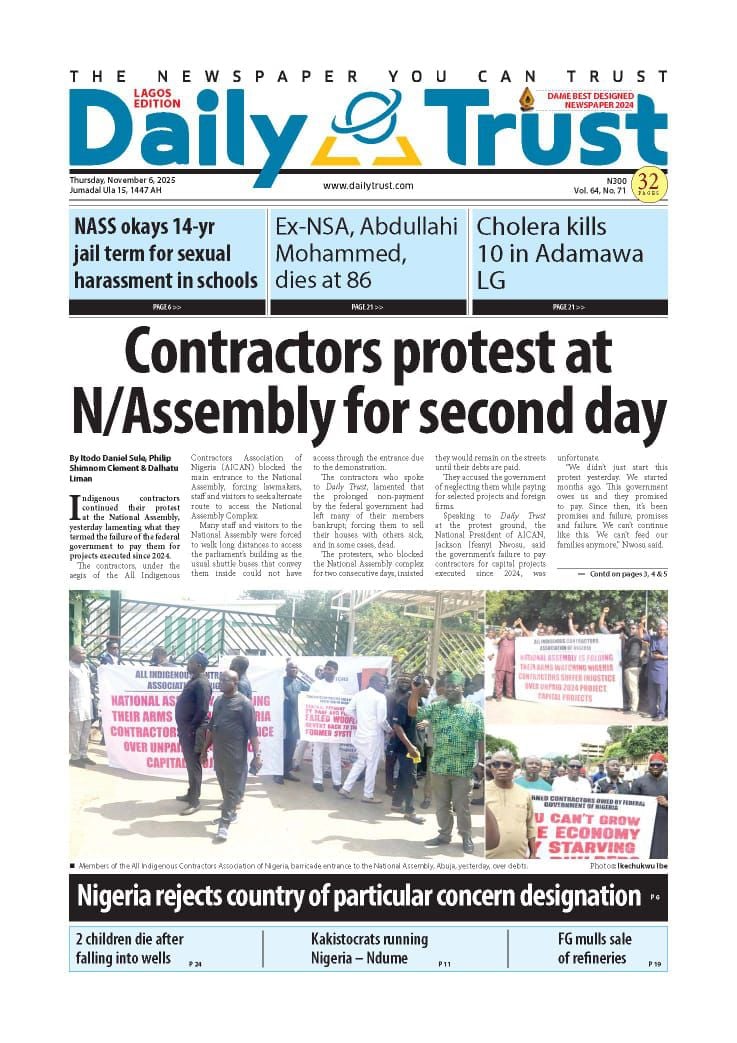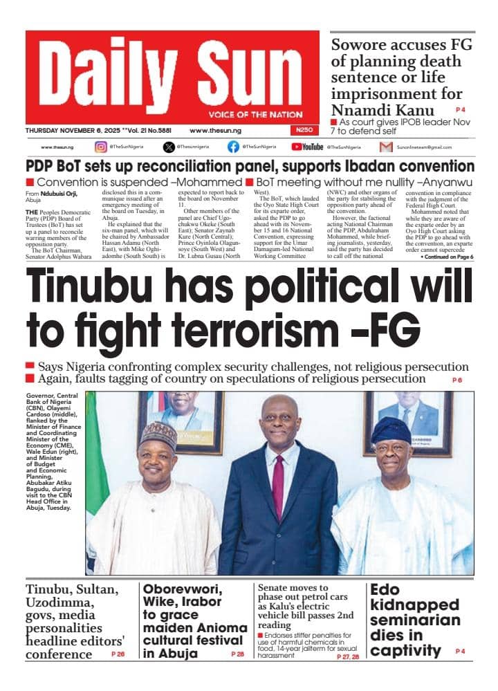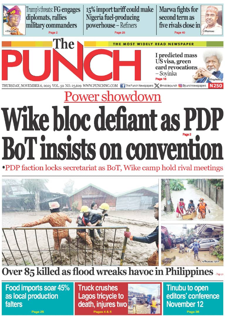 ThisDay reports that the Manufacturers Association of Nigeria (MAN) says counterfeiting and the influx of cheap imports are some of the factors stifling competitiveness in the textile and leather industry. The paper says Nigeria’s return to the international capital market defied political headwinds, as its $2.35 billion Eurobond issuance attracted orders worth $13 billion — representing an oversubscription of 453 percent, or $10.65 billion.Blueprint newspaper reports that the senate has approved the sexual harassment of students (Prevention and Prohibition) Bill, 2025, which prescribes up to 14 years’ imprisonment for educators convicted of sexually harassing students in tertiary institutions. The paper says the senate has received the interim report of its ad hoc committee investigating crude oil theft and related sabotage in the Niger Delta.Daily Trust reports that Abdullahi Mohammed, former chief of staff to Presidents Olusegun Obasanjo and Umaru Yar’Adua, is dead. The newspaper reports that the Adamawa state government has confirmed a cholera outbreak in Mubi LGA, which has claimed 10 lives so far.The Guardian newspaper reports that former Vice President Yemi Osinbajo has cautioned African governments against celebrating Gross Domestic Product (GDP) growth figures that do not translate into improved living conditions for citizens. The paper adds that Olu Verheijen, special adviser to President Bola Tinubu on energy, says the federal government is open to selling the refineries of the Nigerian National Petroleum Company (NNPC) Limited.PUNCH reports that the crisis rocking the Peoples Democratic Party (PDP) is far from over as the faction loyal to Nyesom Wike insists that the national convention of the party slated for Ibadan, the Oyo state capital between November 15 and 16, will not hold. The newspaper says about two months before his tenure ends, at least five aspirants have reportedly entered the contest to replace Buba Marwa, chairman of the National Drug Law Enforcement Agency (NDLEA).Vanguard newspaper reports that Mohammed Idris, the minister of information and national orientation, says foreign lobbyists are fuelling the narrative of a “Christian genocide” in Nigeria. The paper says that Tinubu has directed the education ministry to resolve the ongoing Academic Staff Union of Universities (ASUU) strike immediately.Daily Sun reports that the Catholic Diocese of Auchi has confirmed the death of Emmanuel Alabi, one of the three junior seminarians abducted by gunmen earlier this year. The newspaper says Omoyele Sowore, human rights activist, has alleged that the federal government is plotting to sentence Nnamdi Kanu, the detained leader of the Indigenous People of Biafra (IPOB), to death.The Nation reports that Kanu told the court that he was misguided to enter a plea into a charge that does not exist. The newspaper adds that Abdulrahman Mohammed, acting national chairman of the PDP factional NWC, has appealed an Ibadan court order approving Umar Damagum’s planned convention.New Telegraph reports that the board of trustees (BoT) of the PDP has set up a committee to reconcile warring factions within the party. The paper adds that the federal high court in Abuja on Wednesday declined a request by the Department of State Services (DSS) to issue a bench warrant for the arrest of Sowore, activist and publisher, who is facing five counts of criminal defamation.Nigerian Tribune reports that Femi Falana, a senior advocate of Nigeria(SAN), has accused the United States President Donald Trump of lying to the world regarding his claim of targeted killing of Christians in Nigeria. The newspaper says Yusuf Tuggar, minister of foreign affairs, says it is “impossible” for the Nigerian government to persecute any citizen on the basis of religion.