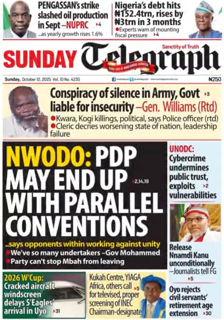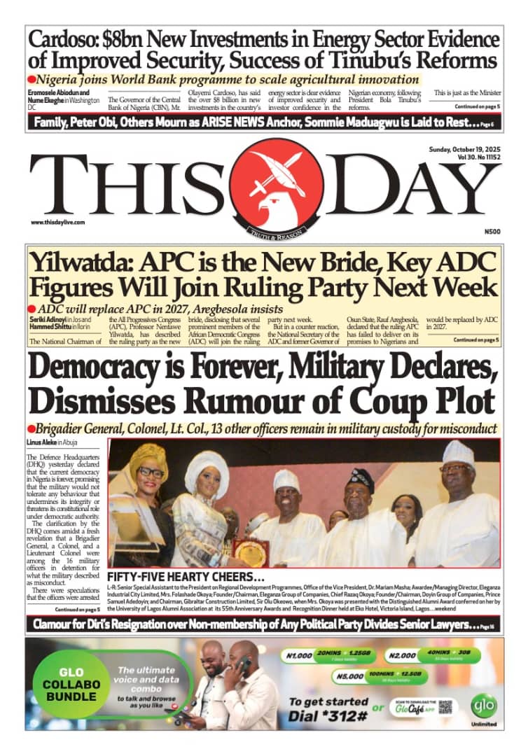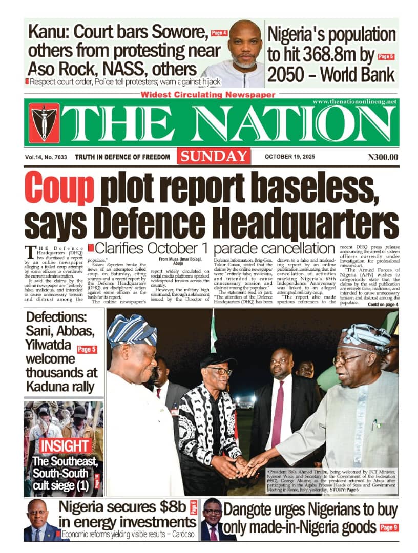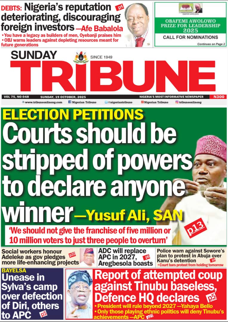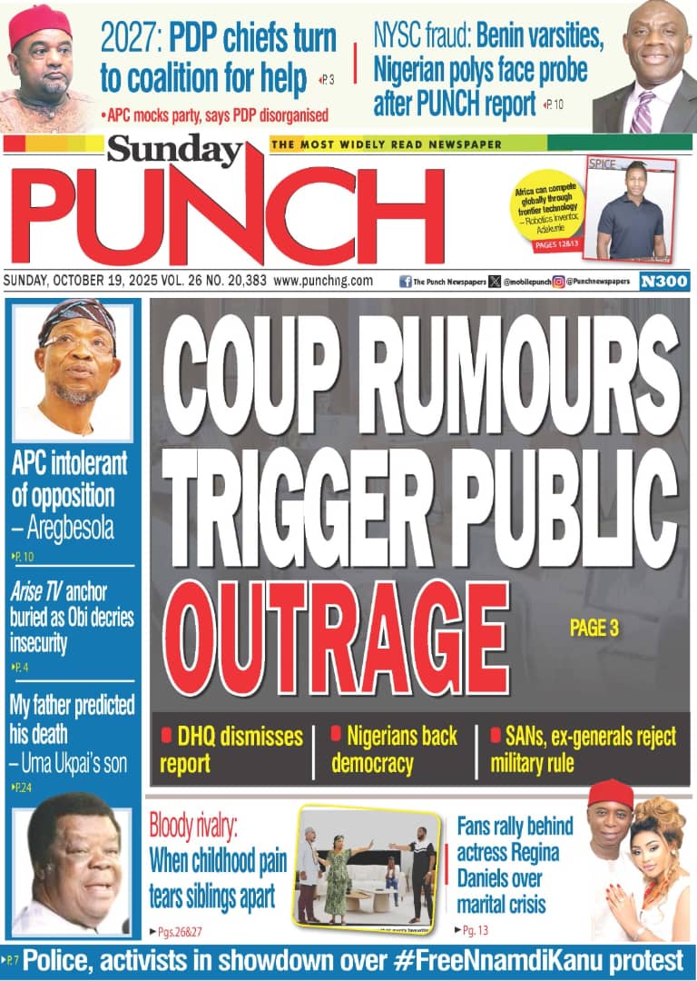 Punch says reports of an alleged plot by some military personnel to overthrow the President Bola Tinubu administration have triggered outrage among Nigerians. The newspaper reports that Rauf Aregbesola, former governor of Osun, has accused the ruling All Progressives Congress (APC) of being intolerant of opposition voices and using state power to silence dissent.Tribune reports that elder statesman Afe Babalola has expressed deep concern over Nigeria’s growing debt burden, warning that the country’s economic reputation is discouraging foreign investments. The newspaper says Yusuf Sani, senior advocate of Nigeria (SAN), has said courts should be stripped of powers to declare anyone winner of an election.The Nation says a federal high court in Abuja has barred Omoyele Sowore, publisher of Sahara Reporters, from protesting for the release of Nnamdi Kanu near Aso Rock villa and the national assembly. The newspaper reports that Monday Okpebholo, governor of Edo, has expressed reservations over the seven days warning strike action declared by the Edo state council of the Medical and Health Workers Union of Nigeria (MHWUN).THISDAY reports that the Defence Headquarters (DHQ) has said Nigeria’s democracy is forever, promising not to tolerate any behaviour that threatens its constitutional role under democratic authority. The newspaper says Olayemi Cardoso, governor of the Central Bank of Nigeria (CBN), has said the over $8 billion in new investments in the country’s energy sector is clear evidence of improved security.New Telegraph says the Independent National Electoral Commission (INEC) will begin distribution of Permanent Voter Cards (PVC) for the Anambra governorship election from October 22. The newspaper reports that Devakumar Edwin, vice-president of Dangote Industries Limited, has said there is no reason for scarcity of petrol and increase in pump price by marketers.