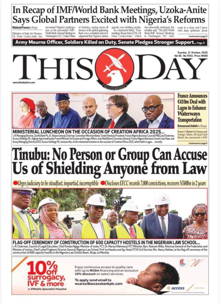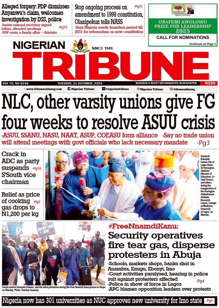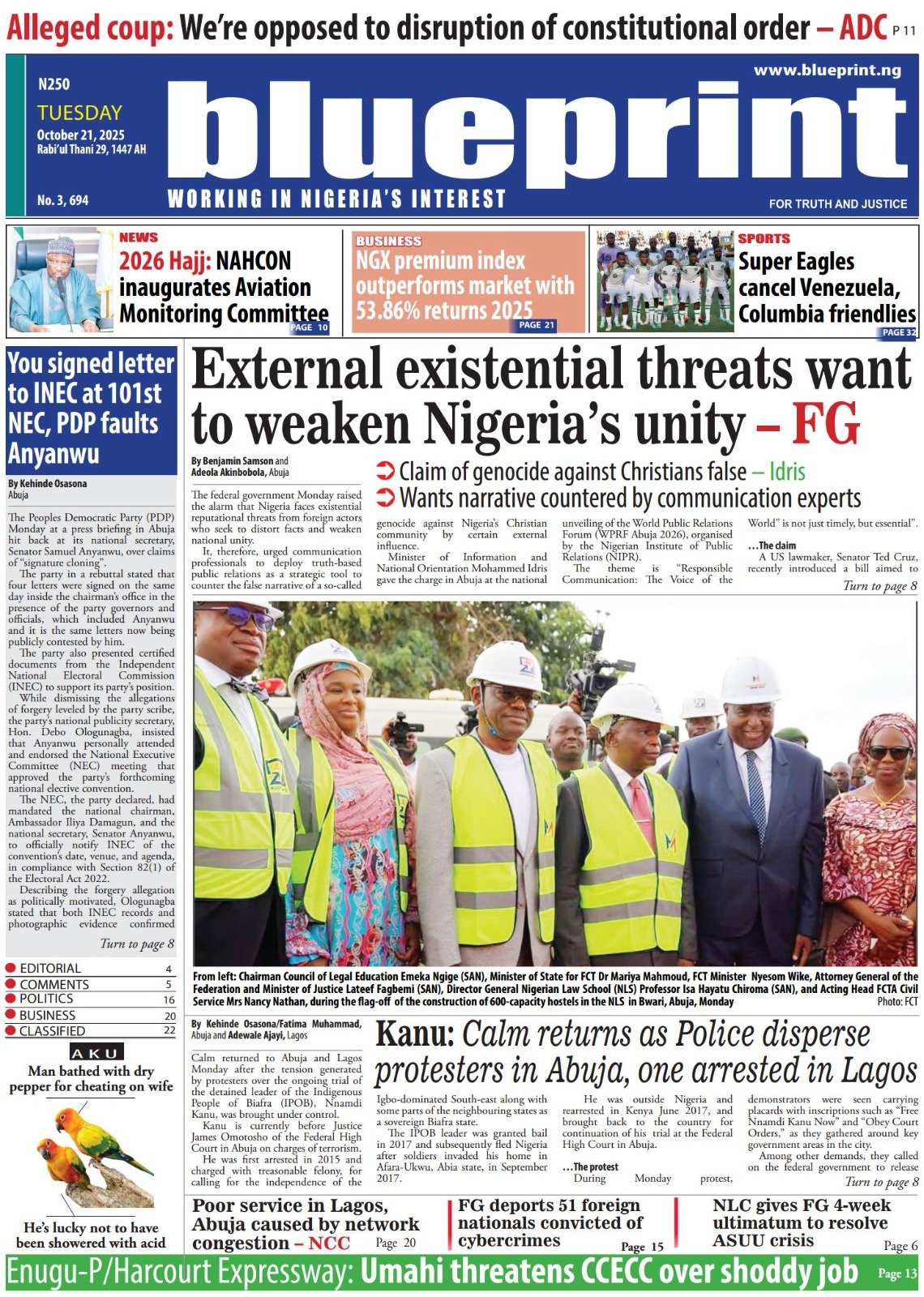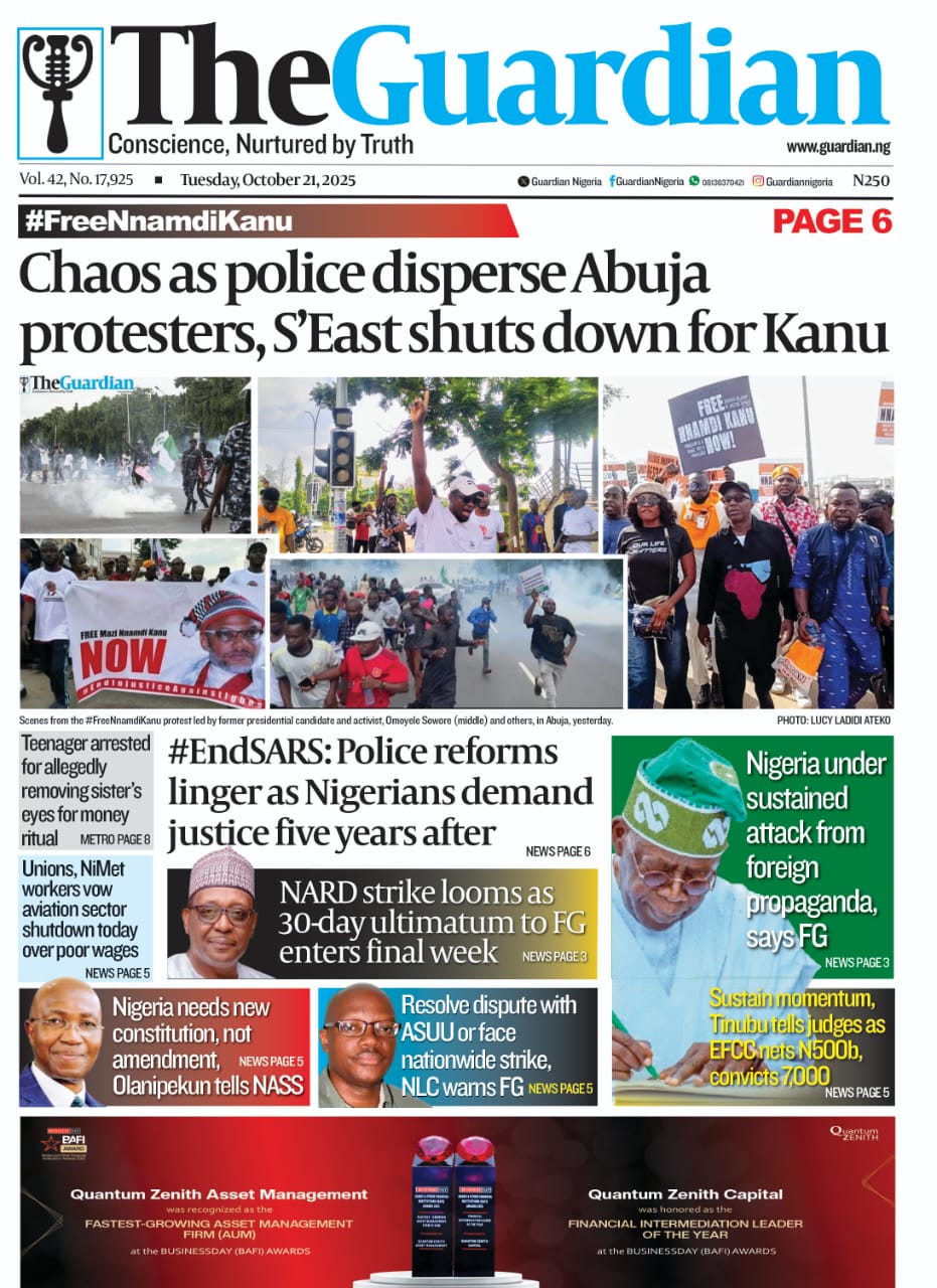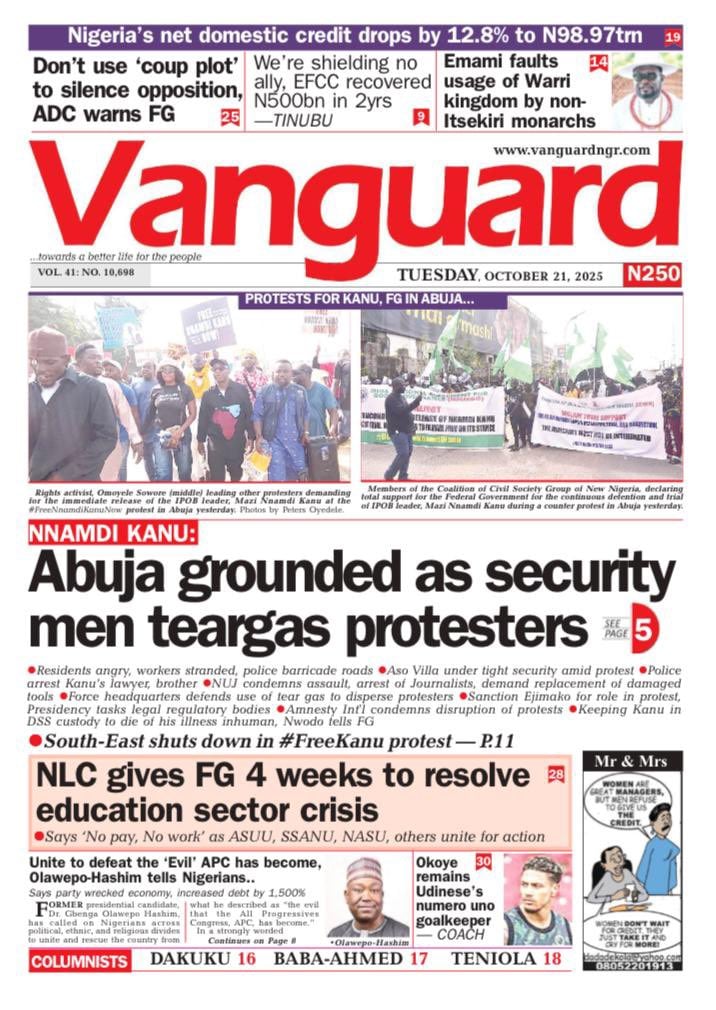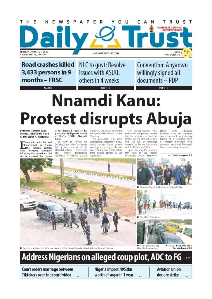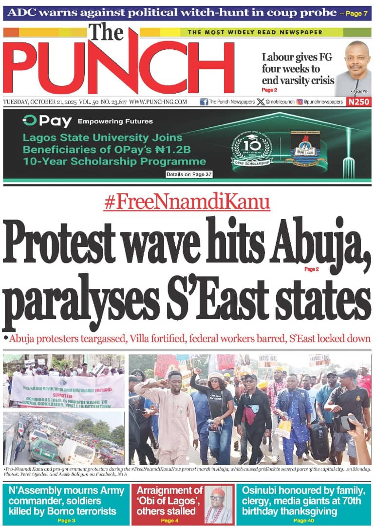 Reports on the disruption of economic activities and movement in Abuja, as protesters demand the release of Nnamdi Kanu, feature prominently on the frontpages.