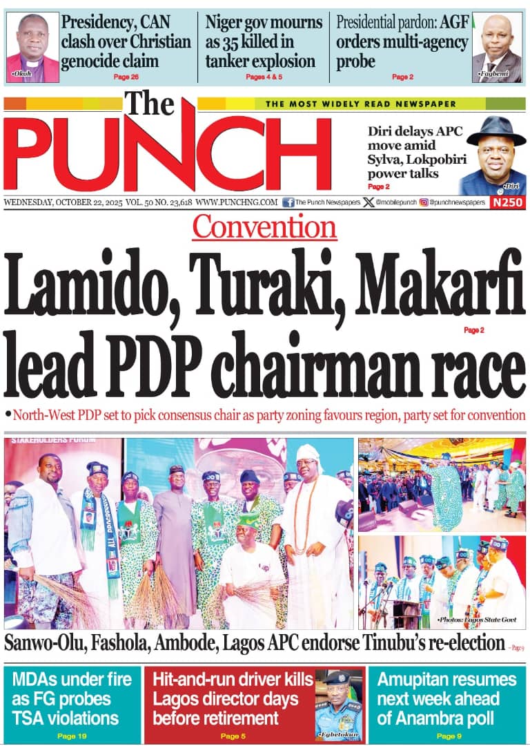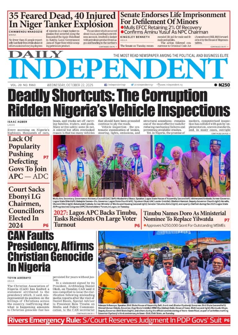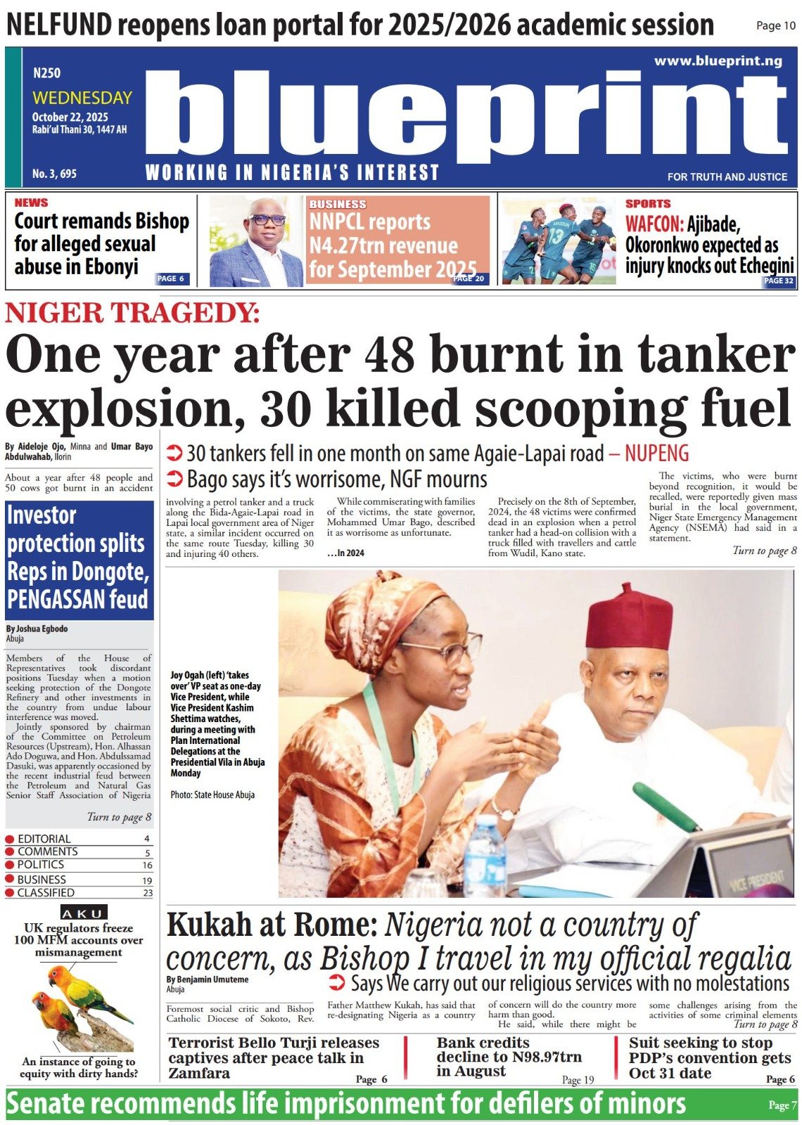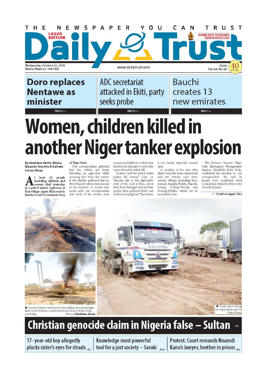 Reports on a petrol tanker explosion in Niger state that claimed many lives, and developments in the upper legislative chamber, dominate the cover pages.