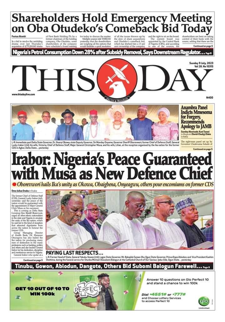 The Punch reports that Godswill Akpabio, senate president, has met with President Bola Tinubu to seek his input on the selection of heads of committees in the upper chamber. The newspaper says Abdulaziz Yari, former governor of Zamfara, has been grilled by operatives of the Department of State Services (DSS).The Nation says many state governors sworn in on May 29 are still battling with pressure from political influencers over cabinet composition. The newspaper reports that unknown gunmen killed 23 people in Akpuna community of Benue state.Daily Trust reports that the federal government can build critical infrastructure from the N400 billion it has so far saved in one month following the removal of petrol subsidy. The newspaper says Ahmad Gumi, a prominent Islamic cleric, said the military must move away from politics in order to restore their professionalism.Vanguard reports that members of the national assembly may end up appointing 2,563 legislative aides at a time Nigerians are demanding reduction in the cost of governance. The newspaper says 40 days after the inauguration of President Bola Tinubu, concerns are growing over the composition of the federal cabinet.THISDAY says data from Nigerian Midstream and Downstream Petroleum Regulatory Authority (NMDPRA) shows that average daily petrol consumption fell by 28 percent since the removal of petrol subsidy. The newspaper says the panel of inquiry set up by Anambra state government has indicted Mmesoma Ejikeme over the forgery of her UTME result.