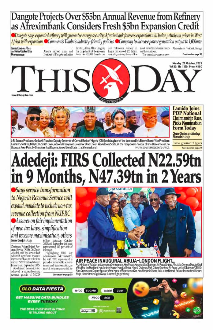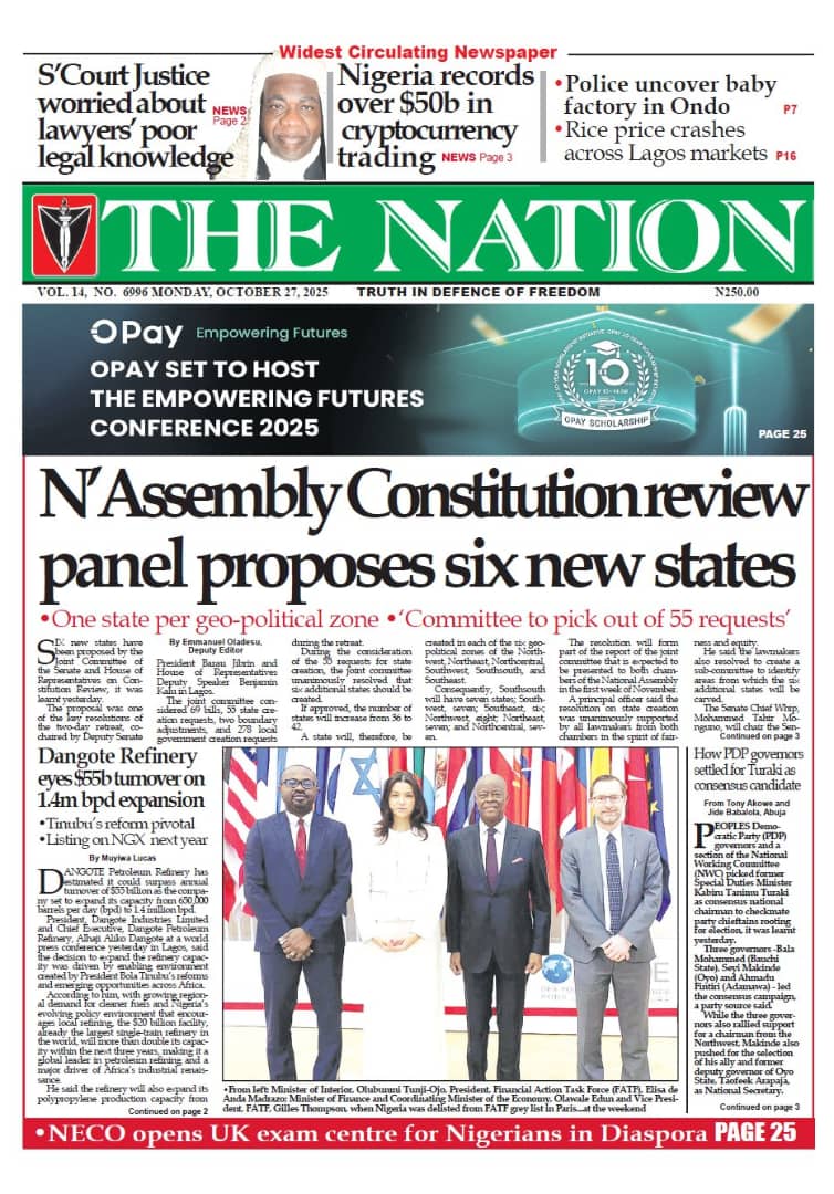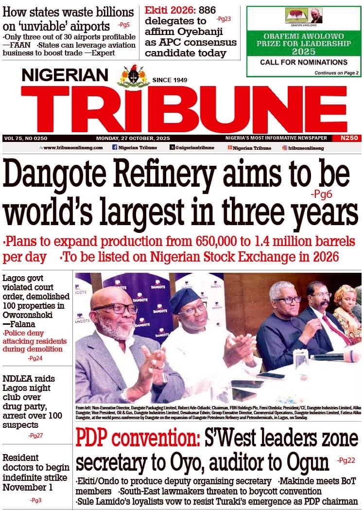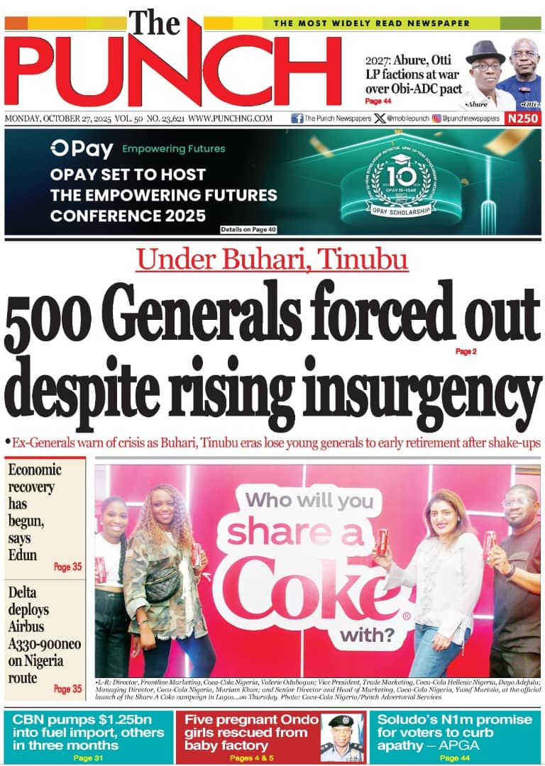 PUNCH reports that about 500 senior military officers were prematurely retired following leadership changes under the administrations of late Muhammadu Buhari and President Bola Tinubu despite rising insecurity. The newspaper says Wale Edun, minister of finance and coordinating minister of the economy, has assured Nigerians that the country’s economy has turned the corner.The Nation reports that six new states have been proposed by the joint committee of the senate and house of representatives on constitution review. The paper adds that the Ondo police command says it has uncovered a suspected baby factory and human trafficking syndicate operating within Ore, Odigbo LGA of the state.The Guardian reports that members of the Organised Private Sector and 25 employers’ federations have rejected the proposed Nigeria Social Insurance Trust Fund (NSITF) amendment, citing risks to transparency and governance. The newspaper adds that the National Association of Resident Doctors (NARD) says it will begin an indefinite nationwide strike on November 1.Vanguard newspaper reports that Access Holdings Plc has reported that its net interest income increased by 91.8 percent year-on-year to N984.6 billion in the first half (H1) of 2025, compared to the N513.4 billion posted in the same period in 2024. The newspaper says Monday Okpebholo, Edo governor, has declared that no contractor in the state has paid any bribe to secure government projects since he assumed office last year.New Telegraph reports that the National Examinations Council (NECO) says it has established a new examination centre in London as part of its global expansion drive to provide credible assessment opportunities for Nigerians in the diaspora. The paper adds that the wealth of Aliko Dangote, the president of the Dangote Industries Limited (DIL), has reached a new milestone, as the billionaire’s net worth hit the $30 billion mark on Friday.THISDAY reports Dangote as saying that his 650,000bpd Lagos refinery could generate over $55 billion annually, ranking among Africa’s top industrial assets. The paper reports that Zacch Adedeji, chairman of the Federal Inland Revenue Service, says tax collections hit N22.59 trillion between January and September 2025.Nigerian Tribune reports that Femi Falana, human rights lawyer and senior advocate of Nigeria (SAN), has accused the Lagos government of demolishing over 100 Oworonshoki properties despite a court order. The newspaper reports that the National Drug Law Enforcement Agency (NDLEA) says it has uncovered a UK-bound cocaine consignment concealed in body cream containers at the Lagos International Airport.Daily Trust reports that Pietro Parolin, Vatican secretary of state, has downplayed the widely posited religious angle in Nigeria’s insecurity challenge, saying the attacks stem from social causes. The newspaper says five teenagers have died in a boat mishap on the Nafada River in Nafada LGA of Gombe state.