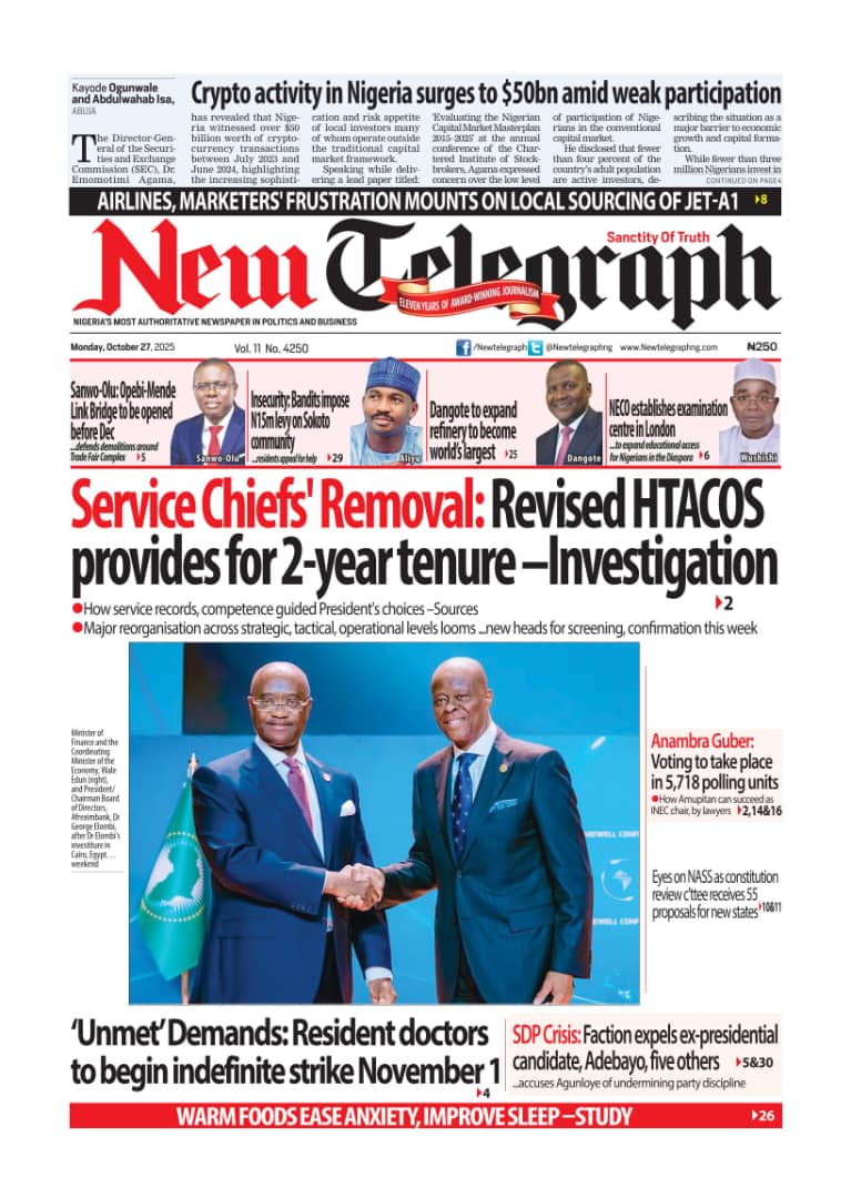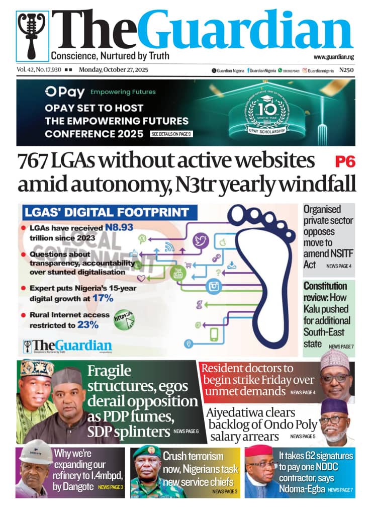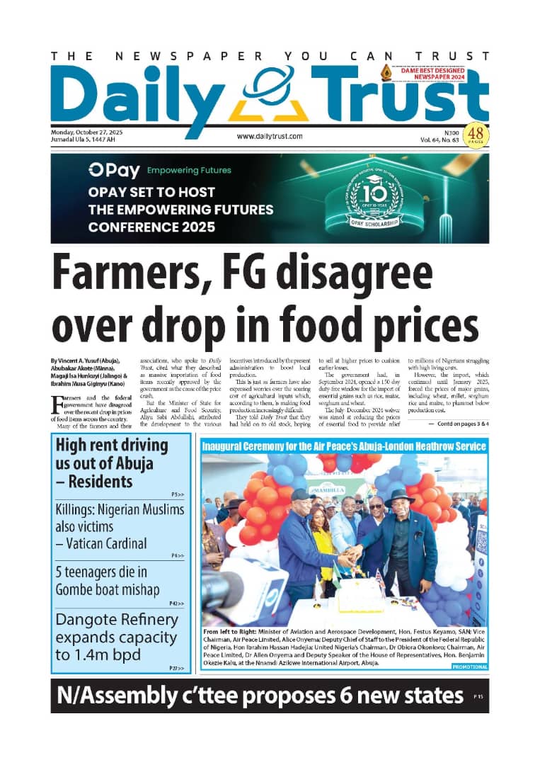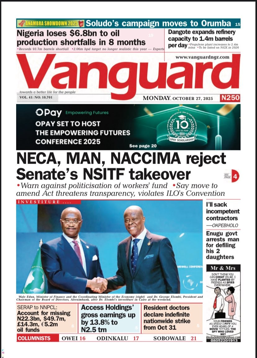 PUNCH reports that about 500 senior military officers were prematurely retired following leadership changes under the administrations of late Muhammadu Buhari and President Bola Tinubu despite rising insecurity. The newspaper says Wale Edun, minister of finance and coordinating minister of the economy, has assured Nigerians that the country’s economy has turned the corner.The Nation reports that six new states have been proposed by the joint committee of the senate and house of representatives on constitution review. The paper adds that the Ondo police command says it has uncovered a suspected baby factory and human trafficking syndicate operating within Ore, Odigbo LGA of the state.The Guardian reports that members of the Organised Private Sector and 25 employers’ federations have rejected the proposed Nigeria Social Insurance Trust Fund (NSITF) amendment, citing risks to transparency and governance. The newspaper adds that the National Association of Resident Doctors (NARD) says it will begin an indefinite nationwide strike on November 1.Vanguard newspaper reports that Access Holdings Plc has reported that its net interest income increased by 91.8 percent year-on-year to N984.6 billion in the first half (H1) of 2025, compared to the N513.4 billion posted in the same period in 2024. The newspaper says Monday Okpebholo, Edo governor, has declared that no contractor in the state has paid any bribe to secure government projects since he assumed office last year.New Telegraph reports that the National Examinations Council (NECO) says it has established a new examination centre in London as part of its global expansion drive to provide credible assessment opportunities for Nigerians in the diaspora. The paper adds that the wealth of Aliko Dangote, the president of the Dangote Industries Limited (DIL), has reached a new milestone, as the billionaire’s net worth hit the $30 billion mark on Friday.THISDAY reports Dangote as saying that his 650,000bpd Lagos refinery could generate over $55 billion annually, ranking among Africa’s top industrial assets. The paper reports that Zacch Adedeji, chairman of the Federal Inland Revenue Service, says tax collections hit N22.59 trillion between January and September 2025.Nigerian Tribune reports that Femi Falana, human rights lawyer and senior advocate of Nigeria (SAN), has accused the Lagos government of demolishing over 100 Oworonshoki properties despite a court order. The newspaper reports that the National Drug Law Enforcement Agency (NDLEA) says it has uncovered a UK-bound cocaine consignment concealed in body cream containers at the Lagos International Airport.Daily Trust reports that Pietro Parolin, Vatican secretary of state, has downplayed the widely posited religious angle in Nigeria’s insecurity challenge, saying the attacks stem from social causes. The newspaper says five teenagers have died in a boat mishap on the Nafada River in Nafada LGA of Gombe state.