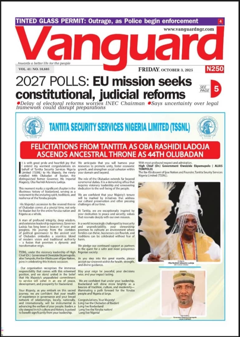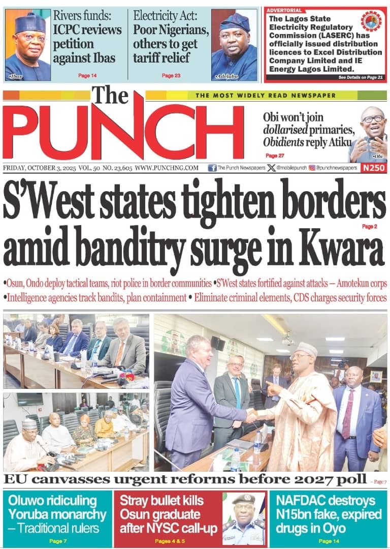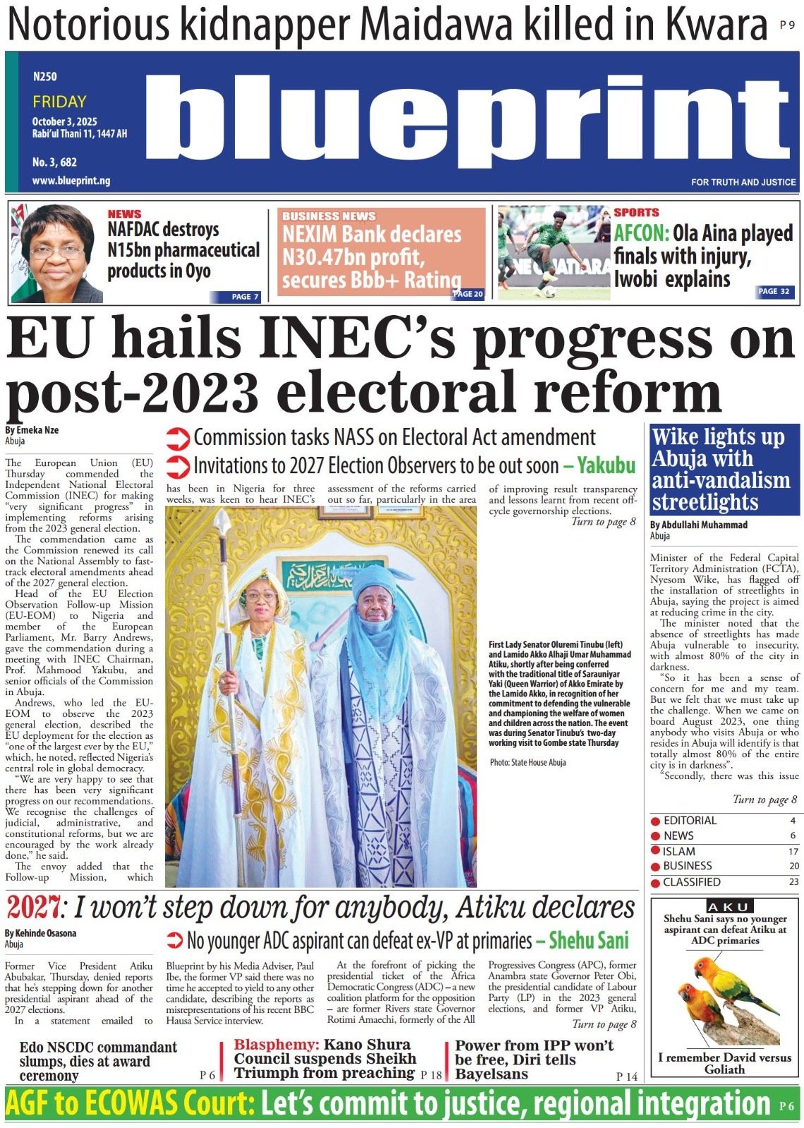 The European Union Election Observation Mission’s (EU EOM) appeal for judicial and constitutional reforms in Nigeria, ahead of the 2027 poll, permeates the cover pages.