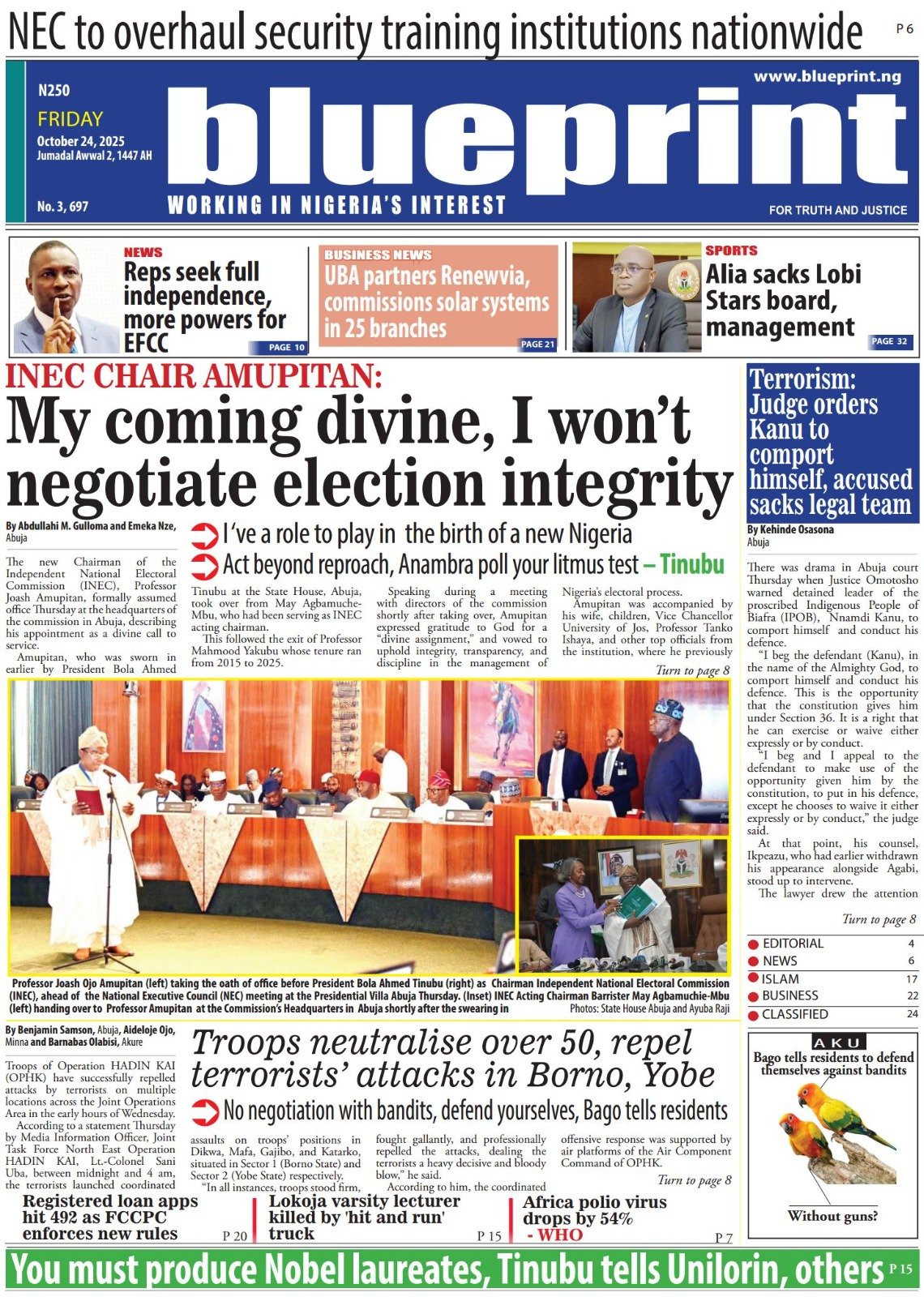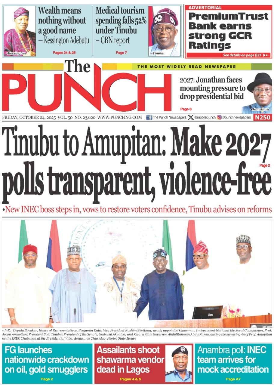 Reports on President Bola Tinubu’s call for credible elections under Joash Amupitan, the newly sworn-in INEC chairman, dominate the headlines.