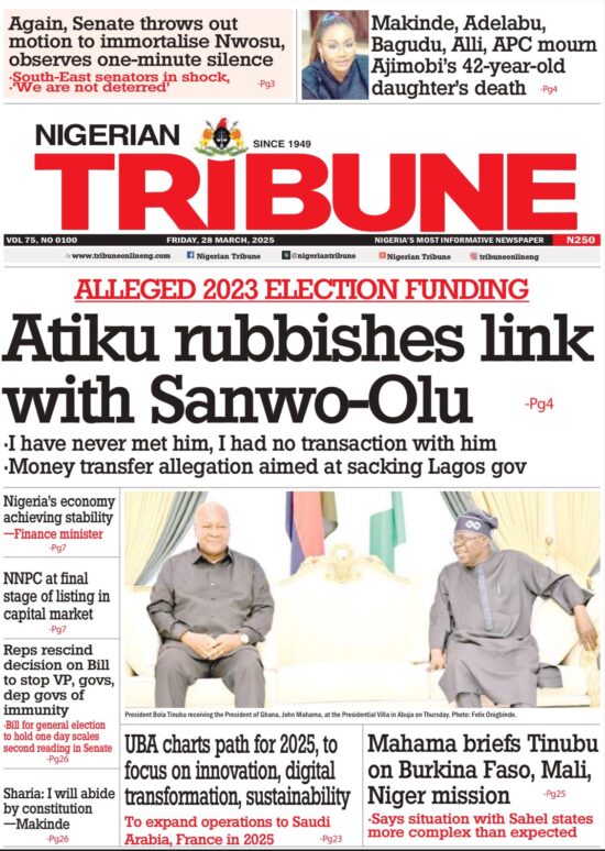 The Punch reports that the Nigeria Centre for Disease Control (NCDC) says at least 74 meningitis deaths have been recorded from 807 cases across 22 states. The newspaper says the Ijaw National Congress and the Rivers Elders and Leaders Council have slammed Ibok-Ete Ibas, the sole administrator of the state, for suspending all political appointees.The Nation says the presidency has described former president Olusegun Obasanjo’s stance on Rivers’ emergency rule as hypocritical. The newspaper reports that Wale Edun, minister for finance, says the personal income tax of wealthy Nigerians will soon go up from 18.6 to 25 percent.Daily Trust reports that the Nigerian National Petroleum Company (NNPC) Limited says it is at the final stage of getting listed in the capital market. The newspaper says Godswill Akpabio, president of the senate, has assured Tinubu that his re-election in 2027 is secured.Nigerian Tribune says that Abisola Kola-Daisi, the eldest daughter of Abiola Ajimobi, the late former governor of Oyo, has died from breast cancer at 44. The newspaper reports that the senate once again rejected a motion to honour Humphrey Nwosu, former chairman of the National Electoral Commission (NEC).