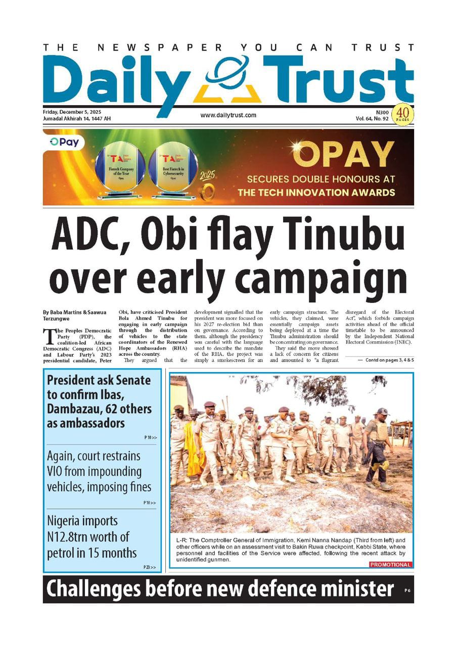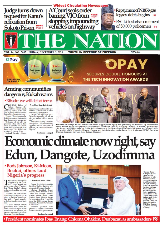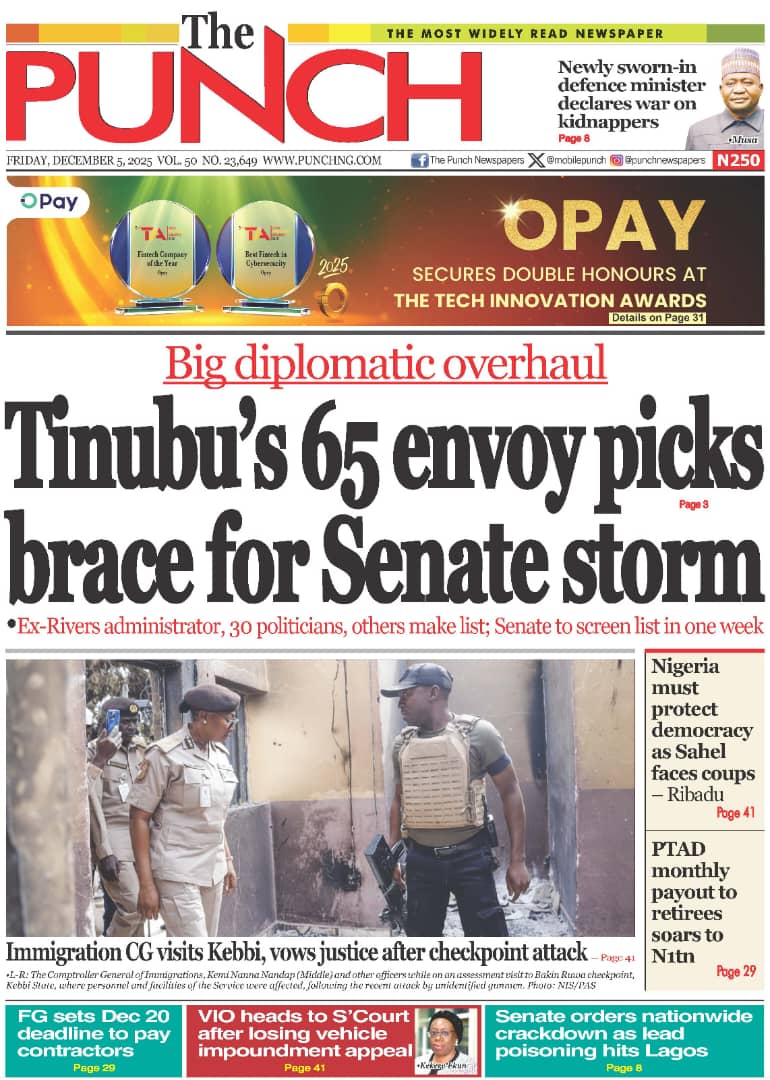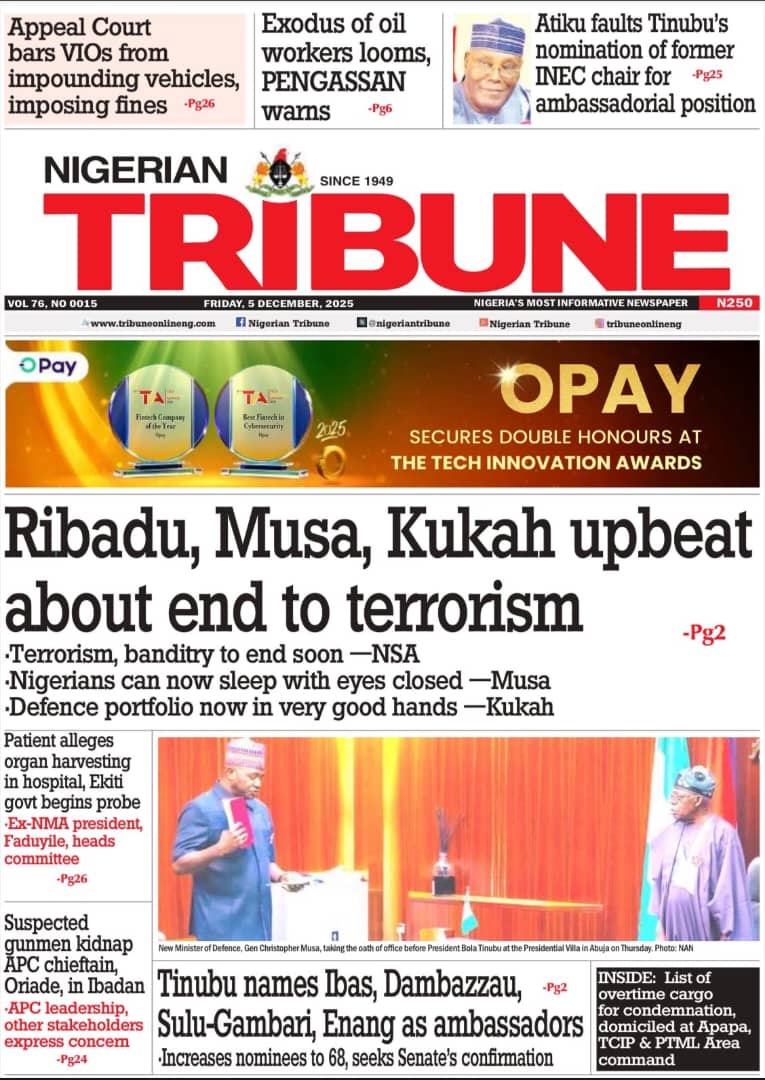 PUNCH reports that Nuhu Ribadu, the national security adviser (NSA), has urged Nigerians to safeguard democracy, warning that the country now stands as the Sahel’s only surviving democratic system amid recurring coups. The newspaper adds that the Pension Transitional Arrangement Directorate (PTAD) says it has paid more than N1 trillion in monthly pensions to over 200,000 retirees, under the federal government’s Defined Benefit Scheme, since 2015.The Nation reports that the federal high court in Abuja has fixed December 8 for the hearing of a motion ex parte filed by Nnamdi Kanu, leader of the proscribed Indigenous People of Biafra (IPOB), seeking to be transferred from the Sokoto correctional facility. The paper says the court of appeal in Abuja on Thursday upheld a federal high court judgment barring the directorate of road traffic services (DRTS), also known as the Vehicle Inspection Office (VIO), from stopping motorists, impounding vehicles, or imposing fines on road users.Nigerian Tribune reports that Wale Oriade, an All Progressives Congress (APC) chieftain in Oyo, has been abducted by armed men in Ibadan, prompting heightened security concerns in the state. The newspaper says former vice-president Atiku Abubakar has criticised Tinubu’s nomination of Mahmood Yakubu, the immediate past chairman of the Independent National Electoral Commission (INEC), for an ambassadorial post.Blueprint newspaper reports that Adams Oshiomhole, senator representing Edo north, says the national assembly must tighten oversight of financial institutions operating outside the traditional banking system. The paper also reports that Tinubu has nominated Ibok-Ete Ekwe Ibas, immediate past sole administrator of Rivers state and former naval chief, as a non-career ambassador.New Telegraph reports that Tinubu has portrayed Imo as a premier destination for global capital, noting that opportunities in the state “command the attention of global investors”. The newspaper adds that William Troost-Ekong, Super Eagles captain, has announced his retirement from international football.Vanguard reports that Christopher Musa, new defence minister, has promised rapid gains against insecurity, saying Nigerians would see results in the shortest possible time as he rebuilds synergy across the security architecture. The newspaper reports that Matthew Kukah, Catholic bishop of Sokoto diocese, says the Tinubu administration appears focused on repositioning national security with the appointment of Christopher Musa as defence minister.Daily Trust reports that Peter Obi, presidential candidate of the Labour Party (LP) in the 2023 elections, says the African Democratic Congress (ADC) coalition is faltering because it has yet to settle questions on zoning and the rotation of key offices. The newspaper says Nigeria imported over N12.8 trillion worth of Premium Motor Spirit (PMS) between August 2024 and October 2025 as local refining capacity remains weak.Guardian reports that the Movement for the Actualisation of the Sovereign State of Biafra (MASSOB) says political appointees under Tinubu have failed to push for Kanu’s release. The paper reports that the ADC has accused Tinubu of insensitivity for allegedly launching a 2027 campaign despite the escalating insecurity pervading the land.