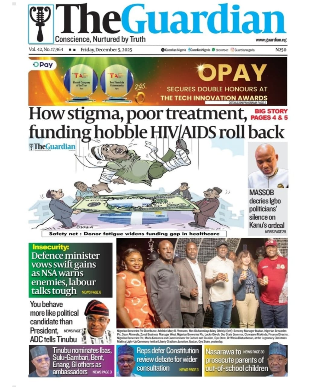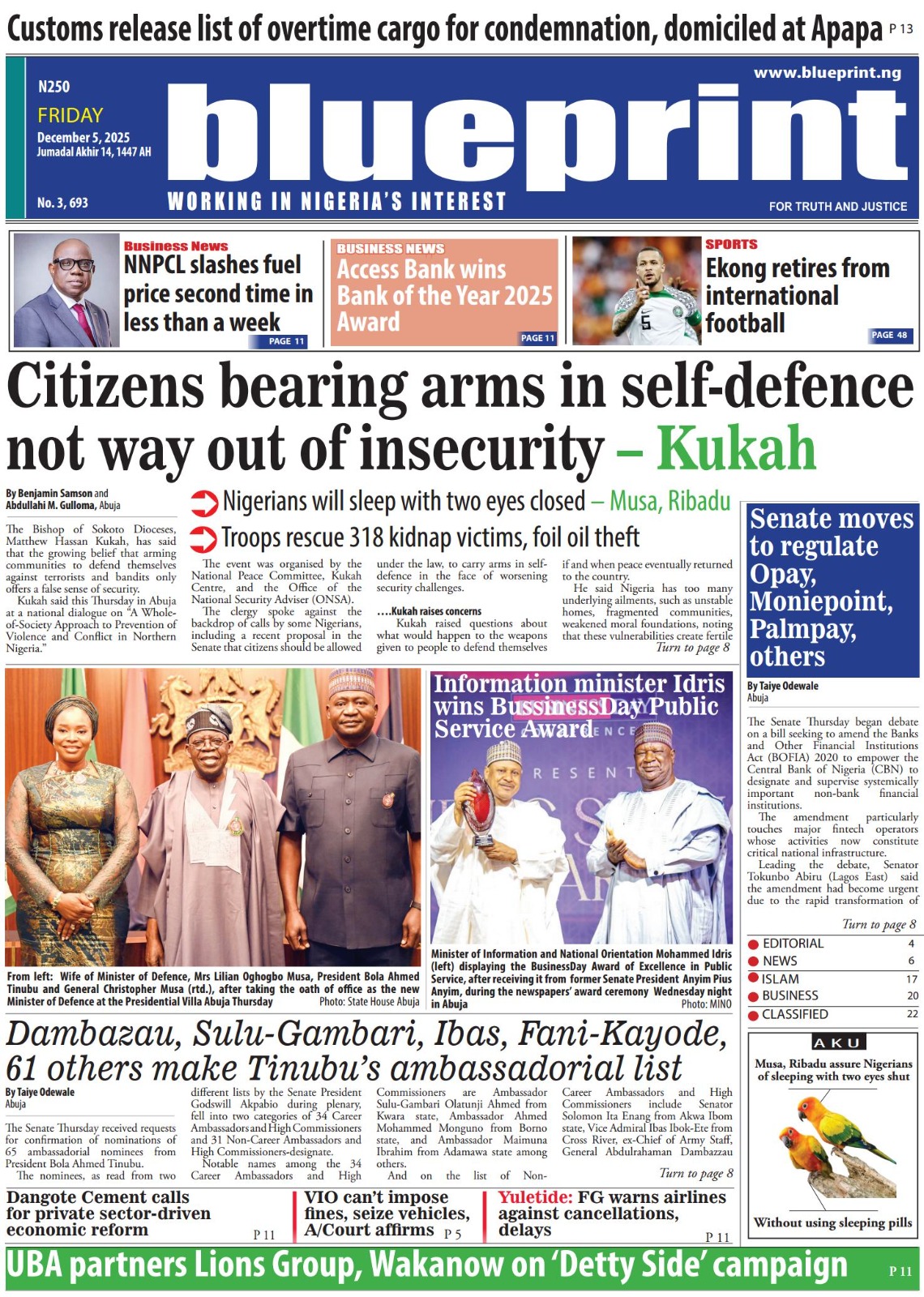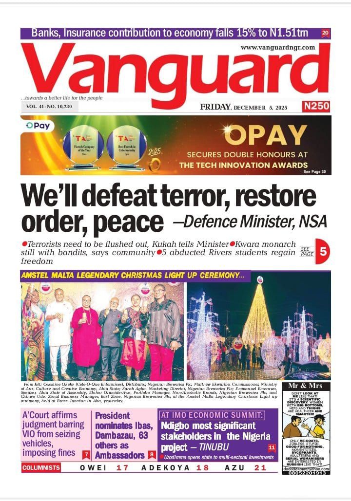 PUNCH reports that Nuhu Ribadu, the national security adviser (NSA), has urged Nigerians to safeguard democracy, warning that the country now stands as the Sahel’s only surviving democratic system amid recurring coups. The newspaper adds that the Pension Transitional Arrangement Directorate (PTAD) says it has paid more than N1 trillion in monthly pensions to over 200,000 retirees, under the federal government’s Defined Benefit Scheme, since 2015.The Nation reports that the federal high court in Abuja has fixed December 8 for the hearing of a motion ex parte filed by Nnamdi Kanu, leader of the proscribed Indigenous People of Biafra (IPOB), seeking to be transferred from the Sokoto correctional facility. The paper says the court of appeal in Abuja on Thursday upheld a federal high court judgment barring the directorate of road traffic services (DRTS), also known as the Vehicle Inspection Office (VIO), from stopping motorists, impounding vehicles, or imposing fines on road users.Nigerian Tribune reports that Wale Oriade, an All Progressives Congress (APC) chieftain in Oyo, has been abducted by armed men in Ibadan, prompting heightened security concerns in the state. The newspaper says former vice-president Atiku Abubakar has criticised Tinubu’s nomination of Mahmood Yakubu, the immediate past chairman of the Independent National Electoral Commission (INEC), for an ambassadorial post.Blueprint newspaper reports that Adams Oshiomhole, senator representing Edo north, says the national assembly must tighten oversight of financial institutions operating outside the traditional banking system. The paper also reports that Tinubu has nominated Ibok-Ete Ekwe Ibas, immediate past sole administrator of Rivers state and former naval chief, as a non-career ambassador.New Telegraph reports that Tinubu has portrayed Imo as a premier destination for global capital, noting that opportunities in the state “command the attention of global investors”. The newspaper adds that William Troost-Ekong, Super Eagles captain, has announced his retirement from international football.Vanguard reports that Christopher Musa, new defence minister, has promised rapid gains against insecurity, saying Nigerians would see results in the shortest possible time as he rebuilds synergy across the security architecture. The newspaper reports that Matthew Kukah, Catholic bishop of Sokoto diocese, says the Tinubu administration appears focused on repositioning national security with the appointment of Christopher Musa as defence minister.Daily Trust reports that Peter Obi, presidential candidate of the Labour Party (LP) in the 2023 elections, says the African Democratic Congress (ADC) coalition is faltering because it has yet to settle questions on zoning and the rotation of key offices. The newspaper says Nigeria imported over N12.8 trillion worth of Premium Motor Spirit (PMS) between August 2024 and October 2025 as local refining capacity remains weak.Guardian reports that the Movement for the Actualisation of the Sovereign State of Biafra (MASSOB) says political appointees under Tinubu have failed to push for Kanu’s release. The paper reports that the ADC has accused Tinubu of insensitivity for allegedly launching a 2027 campaign despite the escalating insecurity pervading the land.