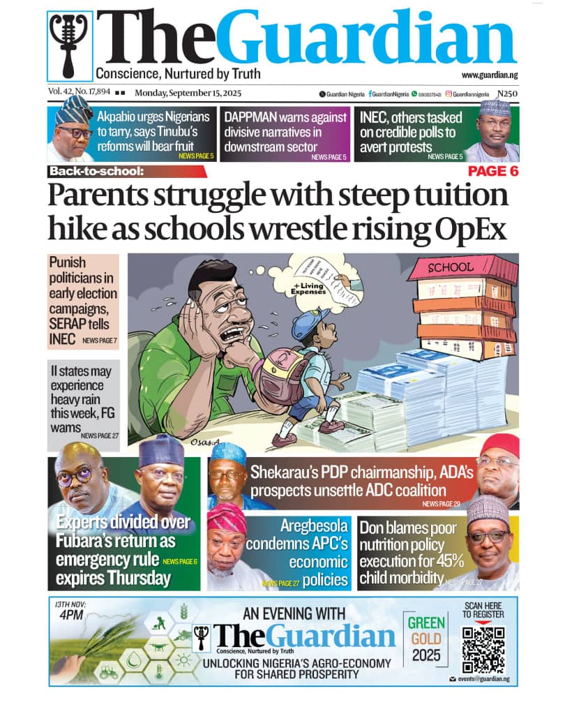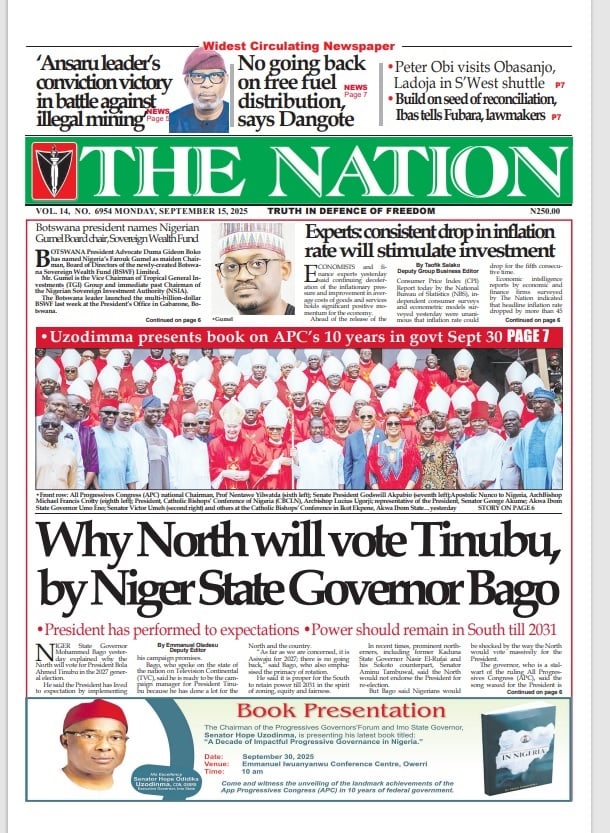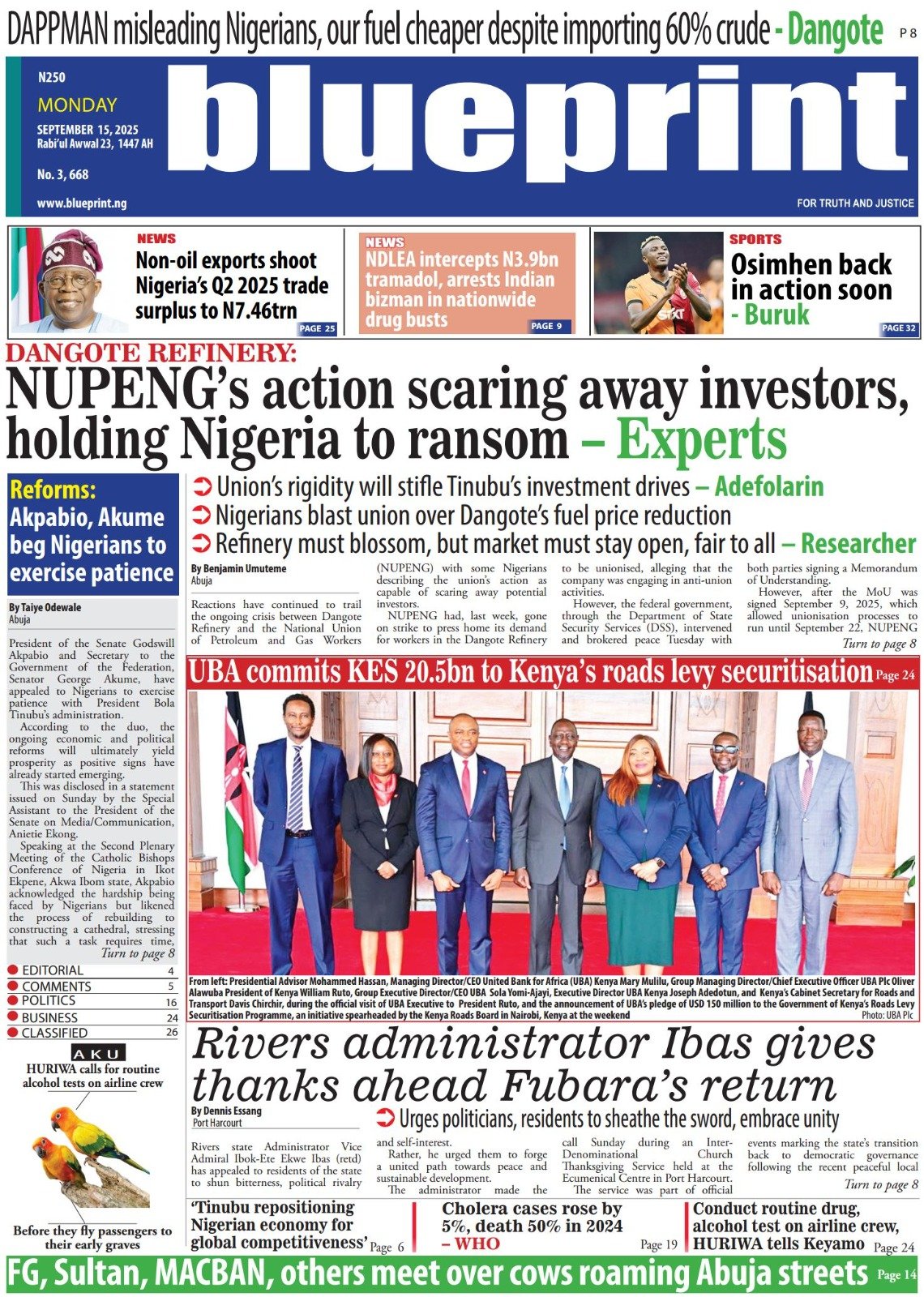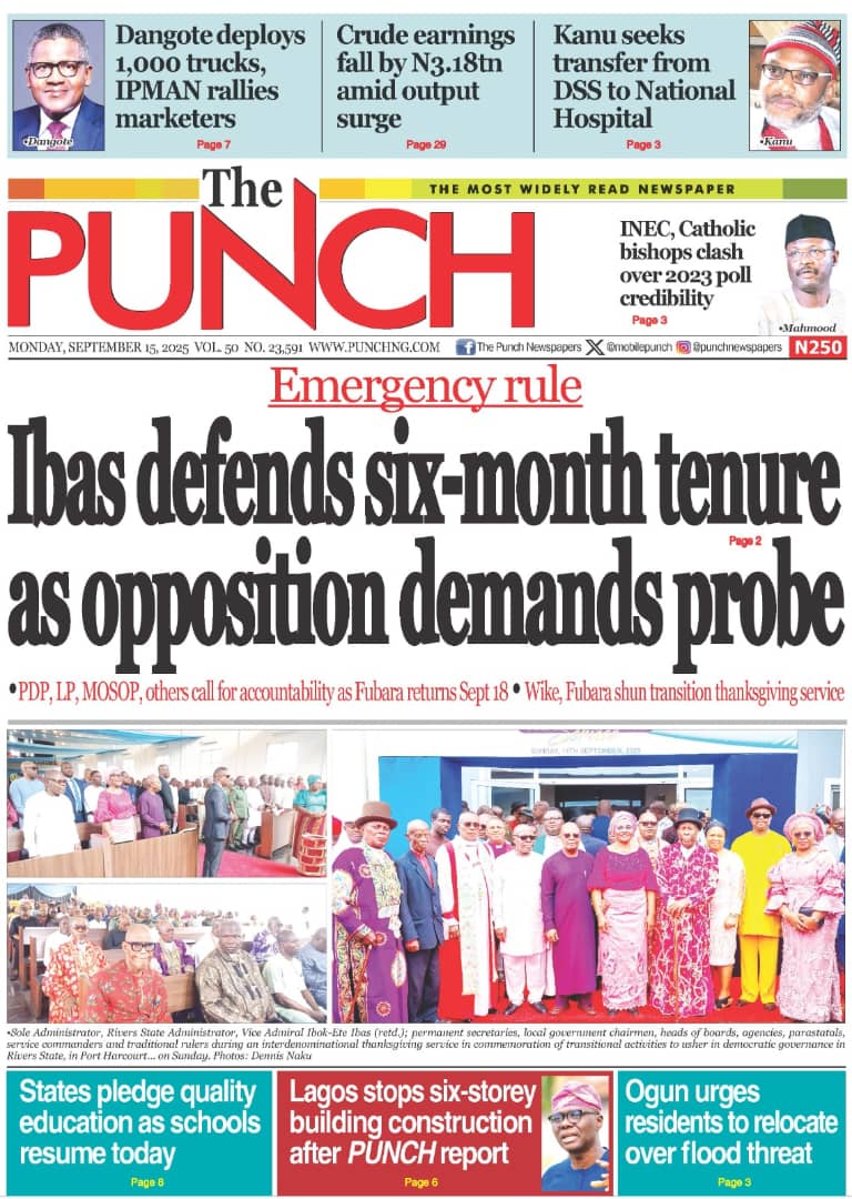 The PUNCH reports that the federal high court in Abuja will hear an application by Nnamdi Kanu, detained leader of the proscribed Indigenous People of Biafra (IPOB), seeking transfer from the Department of State Services (DSS) custody to the National Hospital, Abuja, for urgent medical care. The paper adds that the Catholic Bishops’ Conference of Nigeria and the Independent National Electoral Commission (INEC) have clashed over the conduct of the 2023 election, with the bishops faulting it as eroding public confidence and the commission dismissing their position as “ungodly”.The Guardian reports that plans by the Peoples Democratic Party (PDP) to elect Ibrahim Shekarau, former Kano governor, as national chairman have unsettled the African Democratic Congress (ADC) coalition, with the shortlist of the All Democratic Alliance (ADA) by INEC presenting a fresh credible opposition platform ahead of the 2027 general election. The newspaper says the Socio-Economic Rights and Accountability Project (SERAP) has asked Mahmood Yakubu, INEC chairman, to identify and prosecute politicians and parties violating rules on early campaigns.Blueprint newspaper reports that the National Drug Law Enforcement Agency (NDLEA) has arrested Gupta Ravi Kumar, an Indian businessman, and three Nigerian accomplices, over alleged connection with a consignment of tramadol worth N3.9 billion intercepted at the Lagos airport. The newspaper notes that Dangote Petroleum Refinery has insisted on continuing its free fuel distribution initiative, dismissing industry associations’ criticisms as orchestrated attempts to derail the plan.The Nation reports that Umar Bago, governor of Niger, says Nigerians will be shocked by the way the north would vote massively for President Bola Tinubu. The newspaper adds that Dele Alake, minister of solid minerals development, says the conviction of Mahmud Usman, a commander of Ansaru terrorist group, is a major victory against illegal mining in Nigeria.Nigerian Tribune reports that Senate President Godswill Akpabio and George Akume, secretary general of the federation (SGF), have urged Nigerians to be patient with the Tinubu administration, saying current economic and political reforms will bring prosperity. The paper says leaders of the National Association of Nigerian Students (NANS) and National Association of Osun Students (NAOS) have endorsed Ademola Adeleke, governor of Osun, praising his achievements over the All Progressives Congress (APC) 12-year record.Daily Independent reports that Ibok-Ete Ibas, the sole administrator of Rivers, has appealed to residents to put aside bitterness, rivalry, and self-interest for peace and sustainable development in the state. The newspaper says the federal ministry of environment’s National Flood Early Warning Centre (FEW) has issued a flood alert for 32 locations across 11 states between September 14 and 18.Daily Trust reports that Muhammad Sanusi II, Emir of Kano and former governor of the Central Bank of Nigeria (CBN), says the removal of petrol subsidy saved Nigeria from bankruptcy. The newspaper also reports that a German national was attacked on Saturday morning by hoodlums who snatched his phone and other belongings.New Telegraph reports that Tinubu has asked religious leaders to continue championing interfaith harmony, denouncing violence, and fostering reconciliation in conflict-ridden communities. The newspaper adds that the Nigerian Association of Resident Doctors (NARD) has suspended its warning strike two days after its commencement.