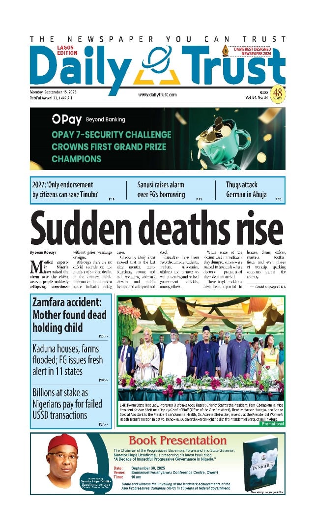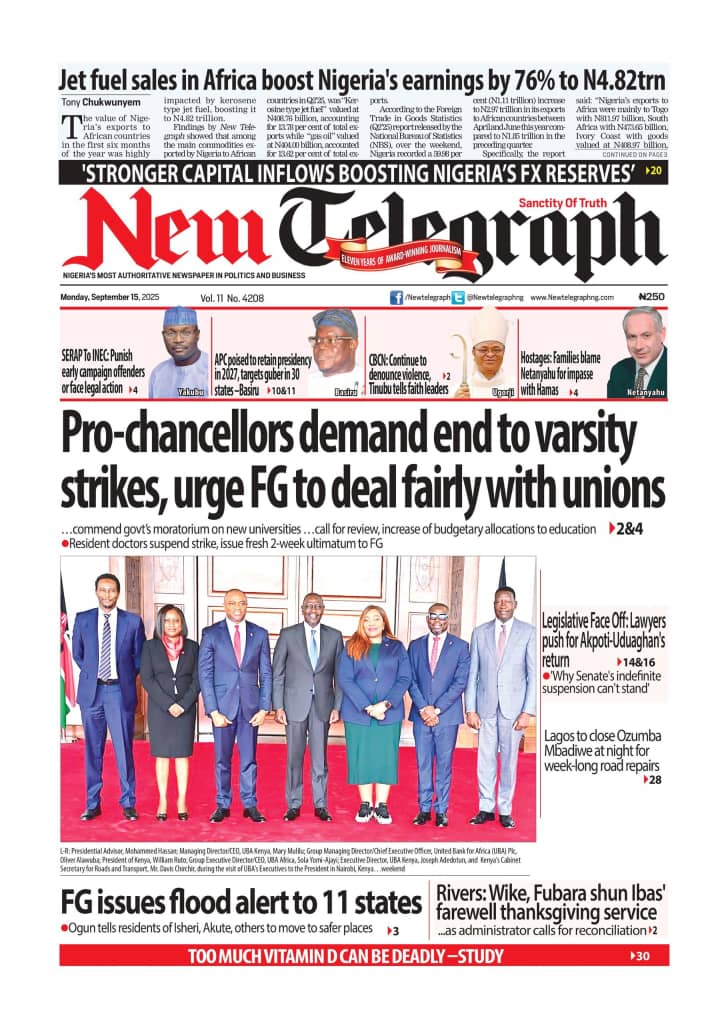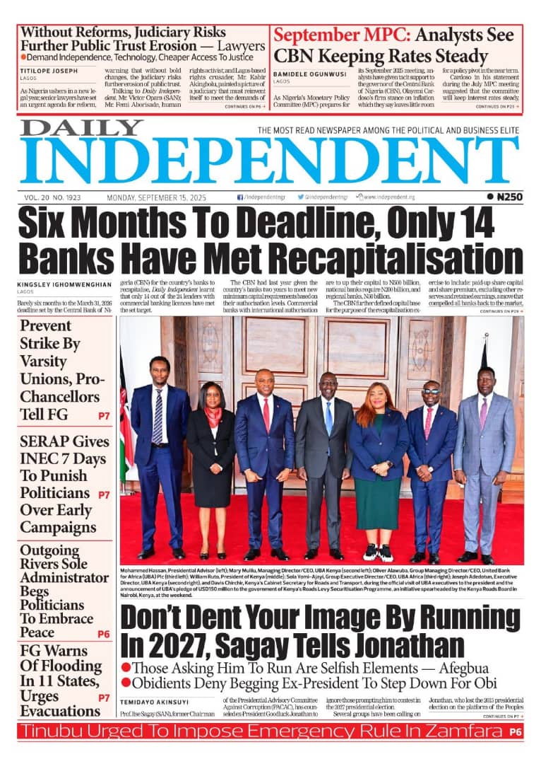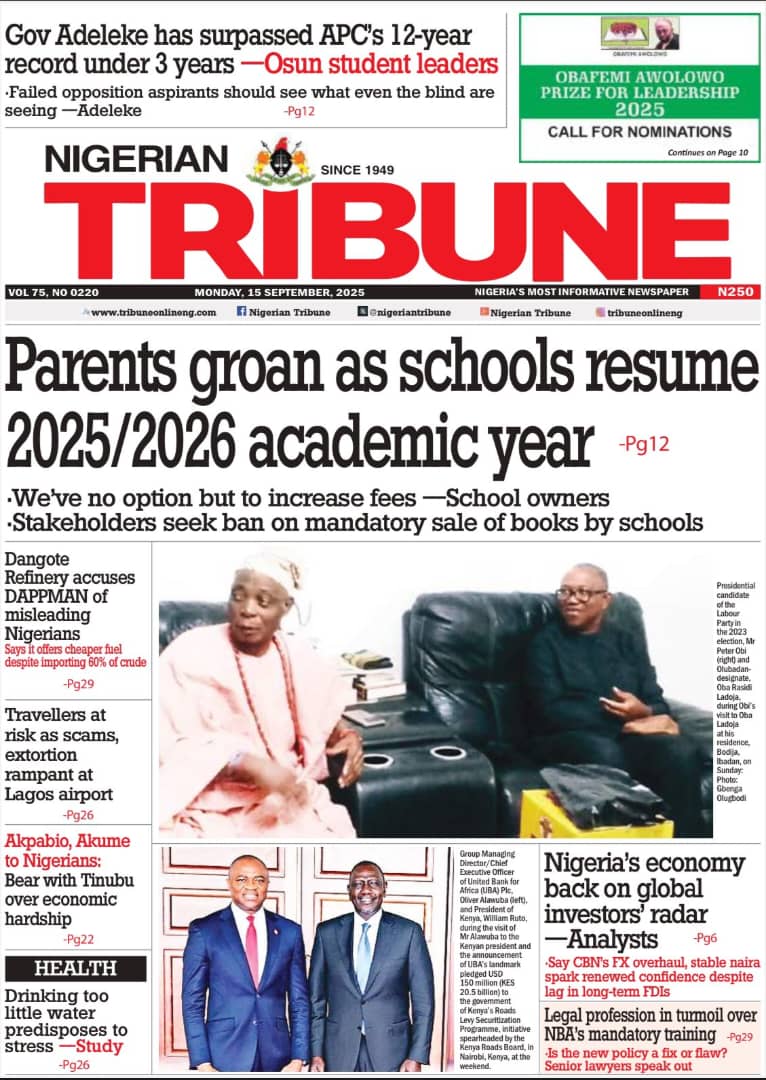 The PUNCH reports that the federal high court in Abuja will hear an application by Nnamdi Kanu, detained leader of the proscribed Indigenous People of Biafra (IPOB), seeking transfer from the Department of State Services (DSS) custody to the National Hospital, Abuja, for urgent medical care. The paper adds that the Catholic Bishops’ Conference of Nigeria and the Independent National Electoral Commission (INEC) have clashed over the conduct of the 2023 election, with the bishops faulting it as eroding public confidence and the commission dismissing their position as “ungodly”.The Guardian reports that plans by the Peoples Democratic Party (PDP) to elect Ibrahim Shekarau, former Kano governor, as national chairman have unsettled the African Democratic Congress (ADC) coalition, with the shortlist of the All Democratic Alliance (ADA) by INEC presenting a fresh credible opposition platform ahead of the 2027 general election. The newspaper says the Socio-Economic Rights and Accountability Project (SERAP) has asked Mahmood Yakubu, INEC chairman, to identify and prosecute politicians and parties violating rules on early campaigns.Blueprint newspaper reports that the National Drug Law Enforcement Agency (NDLEA) has arrested Gupta Ravi Kumar, an Indian businessman, and three Nigerian accomplices, over alleged connection with a consignment of tramadol worth N3.9 billion intercepted at the Lagos airport. The newspaper notes that Dangote Petroleum Refinery has insisted on continuing its free fuel distribution initiative, dismissing industry associations’ criticisms as orchestrated attempts to derail the plan.The Nation reports that Umar Bago, governor of Niger, says Nigerians will be shocked by the way the north would vote massively for President Bola Tinubu. The newspaper adds that Dele Alake, minister of solid minerals development, says the conviction of Mahmud Usman, a commander of Ansaru terrorist group, is a major victory against illegal mining in Nigeria.Nigerian Tribune reports that Senate President Godswill Akpabio and George Akume, secretary general of the federation (SGF), have urged Nigerians to be patient with the Tinubu administration, saying current economic and political reforms will bring prosperity. The paper says leaders of the National Association of Nigerian Students (NANS) and National Association of Osun Students (NAOS) have endorsed Ademola Adeleke, governor of Osun, praising his achievements over the All Progressives Congress (APC) 12-year record.Daily Independent reports that Ibok-Ete Ibas, the sole administrator of Rivers, has appealed to residents to put aside bitterness, rivalry, and self-interest for peace and sustainable development in the state. The newspaper says the federal ministry of environment’s National Flood Early Warning Centre (FEW) has issued a flood alert for 32 locations across 11 states between September 14 and 18.Daily Trust reports that Muhammad Sanusi II, Emir of Kano and former governor of the Central Bank of Nigeria (CBN), says the removal of petrol subsidy saved Nigeria from bankruptcy. The newspaper also reports that a German national was attacked on Saturday morning by hoodlums who snatched his phone and other belongings.New Telegraph reports that Tinubu has asked religious leaders to continue championing interfaith harmony, denouncing violence, and fostering reconciliation in conflict-ridden communities. The newspaper adds that the Nigerian Association of Resident Doctors (NARD) has suspended its warning strike two days after its commencement.