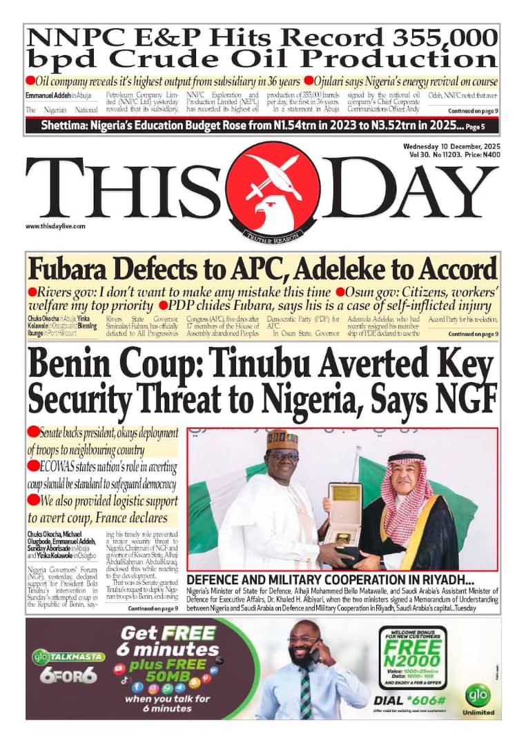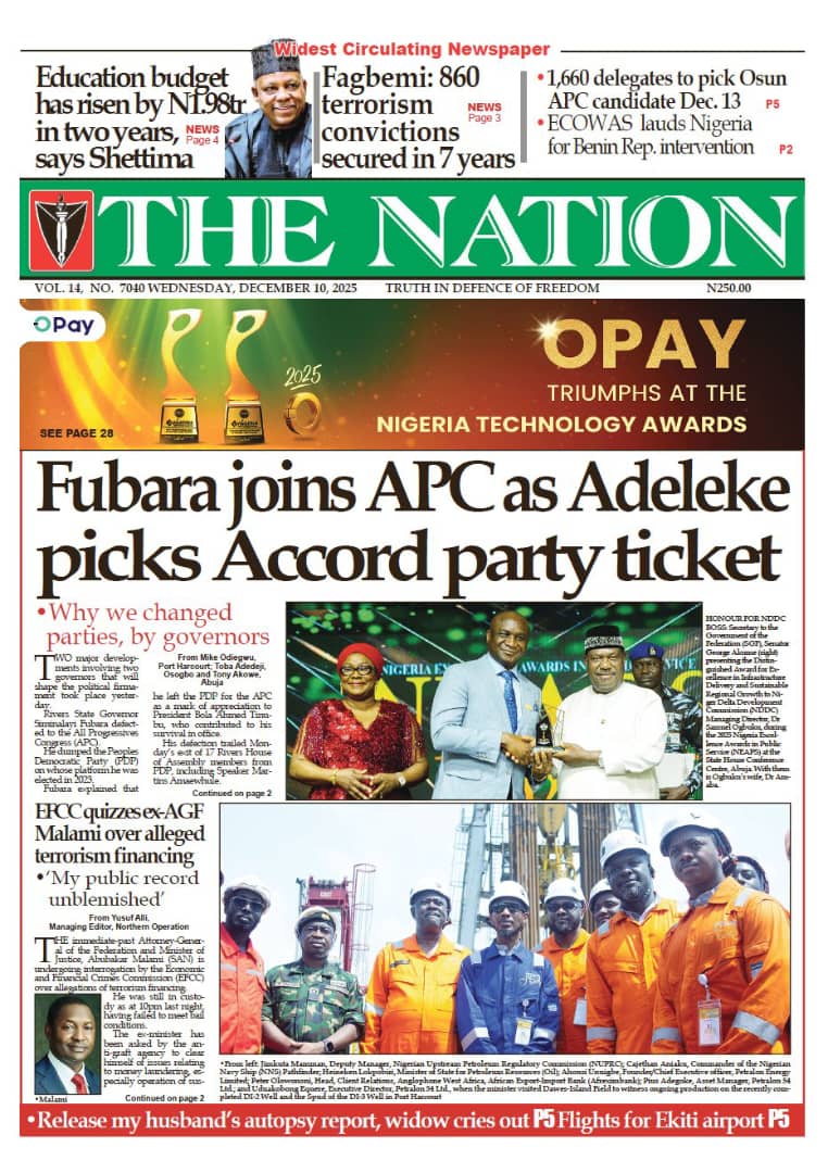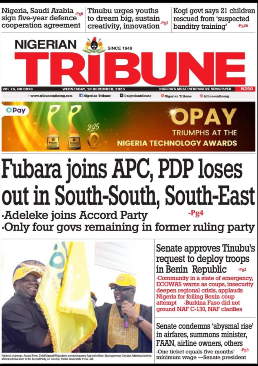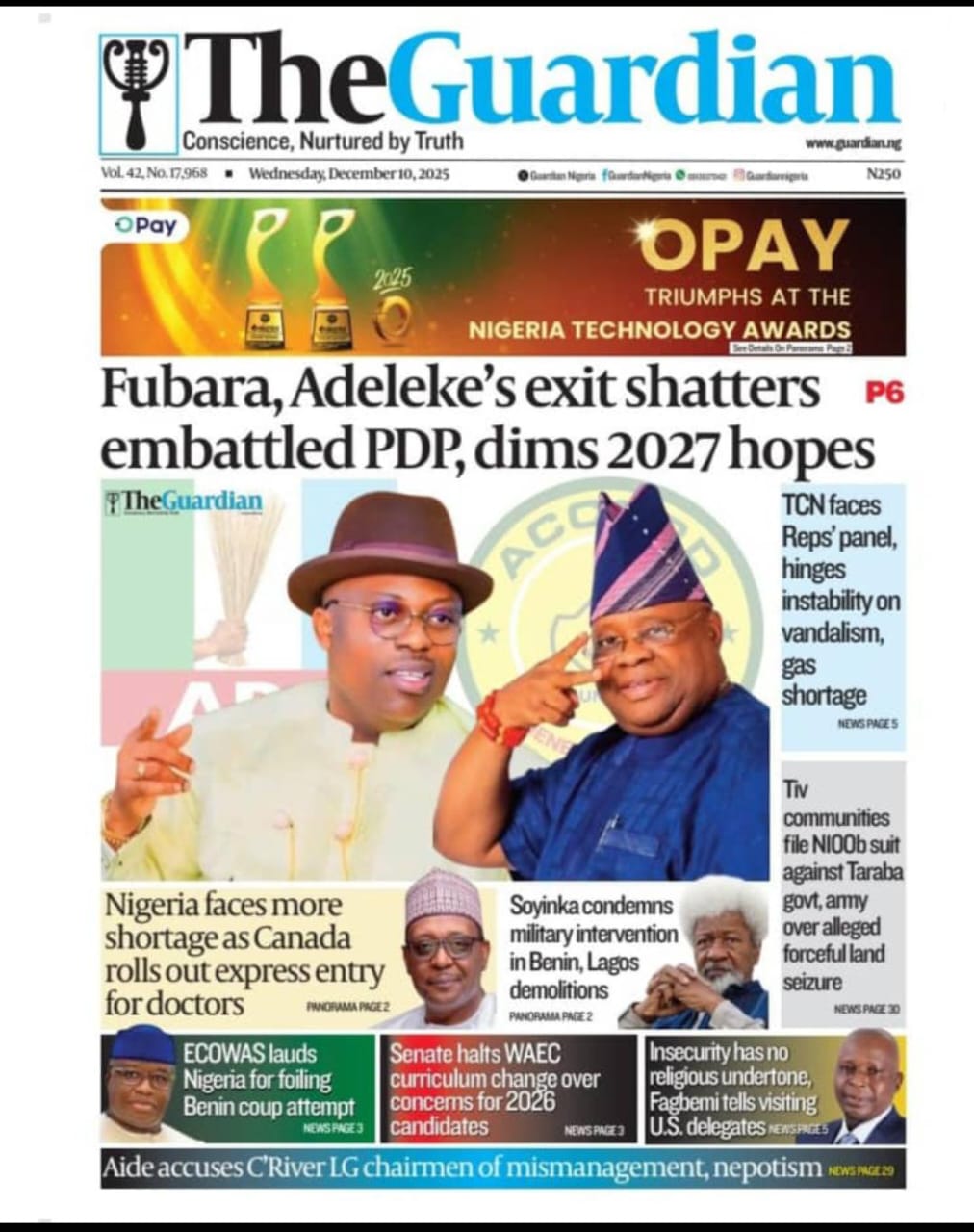 Reports on the exit of Siminalayi Fubara, governor of Rivers, and his Osun counterpart, Ademola Adeleke, from the Peoples Democratic Party (PDP), perfuse the frontpages today.