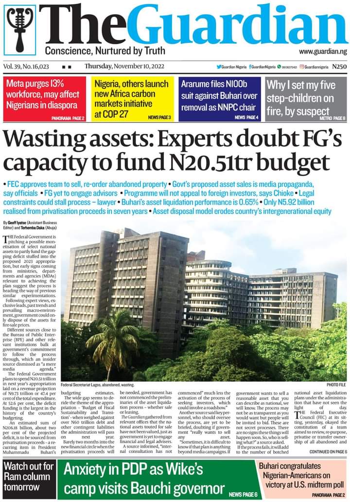 THISDAY reports that Nyesom Wike, governor of Rivers, said aggrieved PDP governors are still open to reconciling with party leaders over the crisis in the PDP. The newspaper says Peter Obi, presidential candidate of the Labour Party, said Benue will return to being Nigeria’s food basket if elected president.The Guardian says experts have raised concerns over the capacity of the federal government to partly fund the deficit in the proposed 2023 budget with sale of some national assets. The newspaper reports that Ifeanyi Ararume, a former senator, has sued President Muhammadu Buhari for allegedly removing him wrongfully as NNPC board chairman.