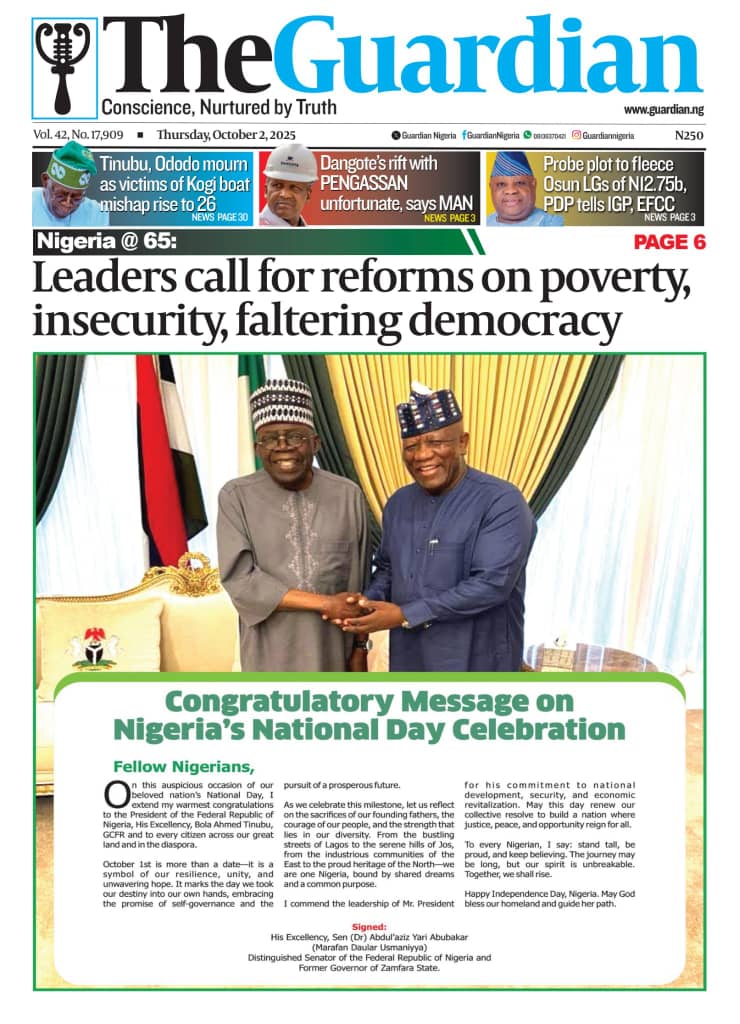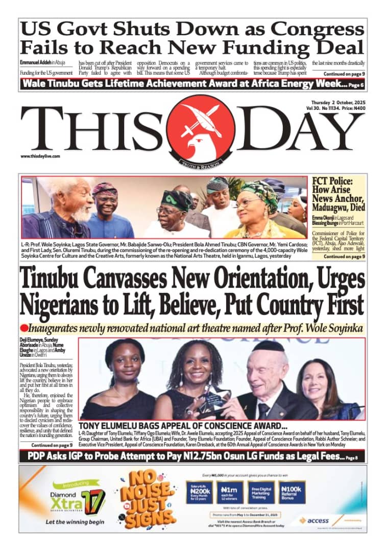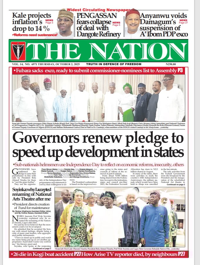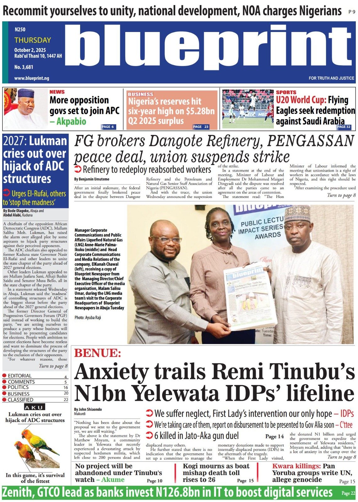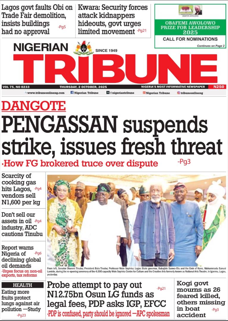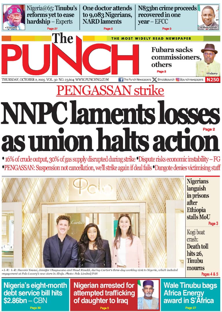 The suspension of industrial action by the Petroleum and Natural Gas Senior Staff Association of Nigeria (PENGASSAN), and calls for investigation into the Osun local government allocation, pervade the dailies.