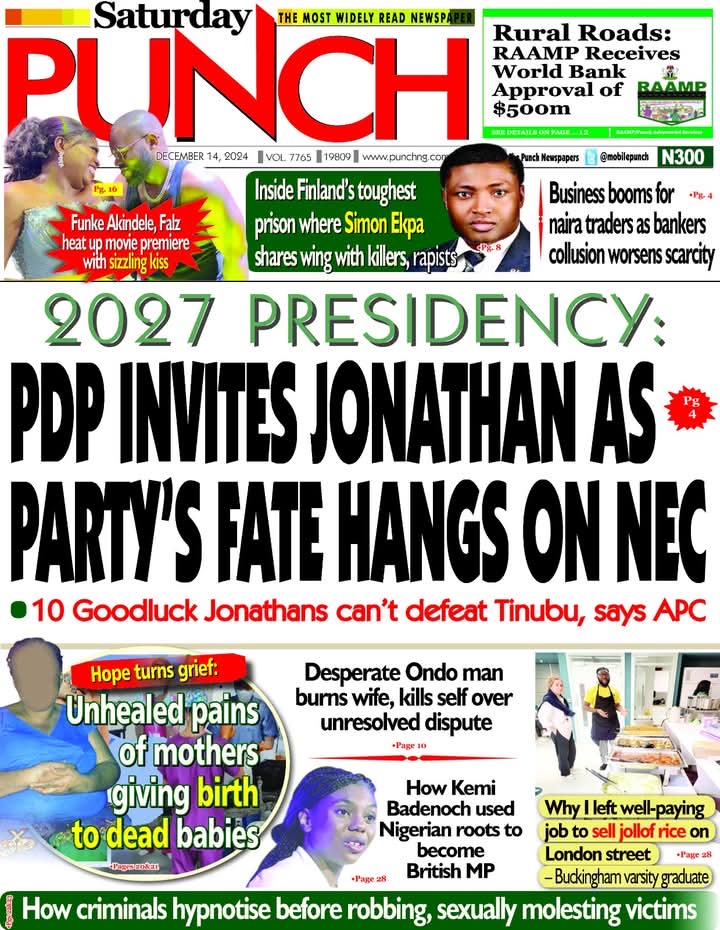 The Punch reports that the Peoples Democratic Party (PDP) has asked former President Goodluck Jonathan to contest the 2027 presidential election on its platform. The newspaper says there is a surge in the hawking of naira notes at exorbitant charges in different parts of the country, despite threats by the Central Bank of Nigeria (CBN) to commercial banks.Daily Trust reports that opposition parties in Nigeria are in disarray following the defection of their top members to the ruling All Progressives Congress (APC). The newspaper says farmers and fishermen in Borno are struggling to restart their trade following the collapse of the Alau dam.The Nation reports that Godswill Akpabio, senate president, has criticised Siminalayi Fubara, governor of Rivers, over his handling of the political crisis in the state. The newspaper says many Nigerians who hail from the south-east geopolitical zone will not be travelling to their different states for the yuletide due to soaring transport fares and insecurity. Nigerian Tribune reports that Peter Obi, presidential candidate of the Labour Party in the 2023 election, said the political class cannot ask Nigerians to fast while they are feasting. The newspaper says the federal government has set a three-year target to migrate paper-based senior school certificate examinations to computer-based.