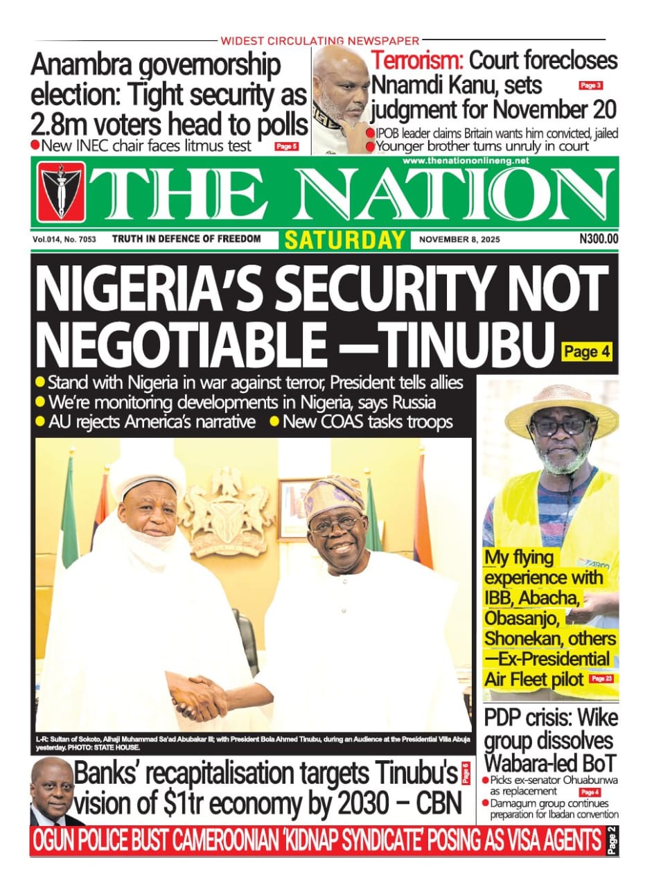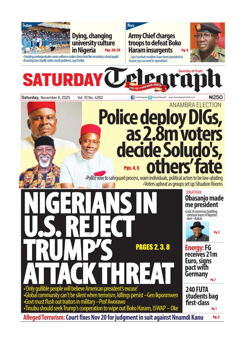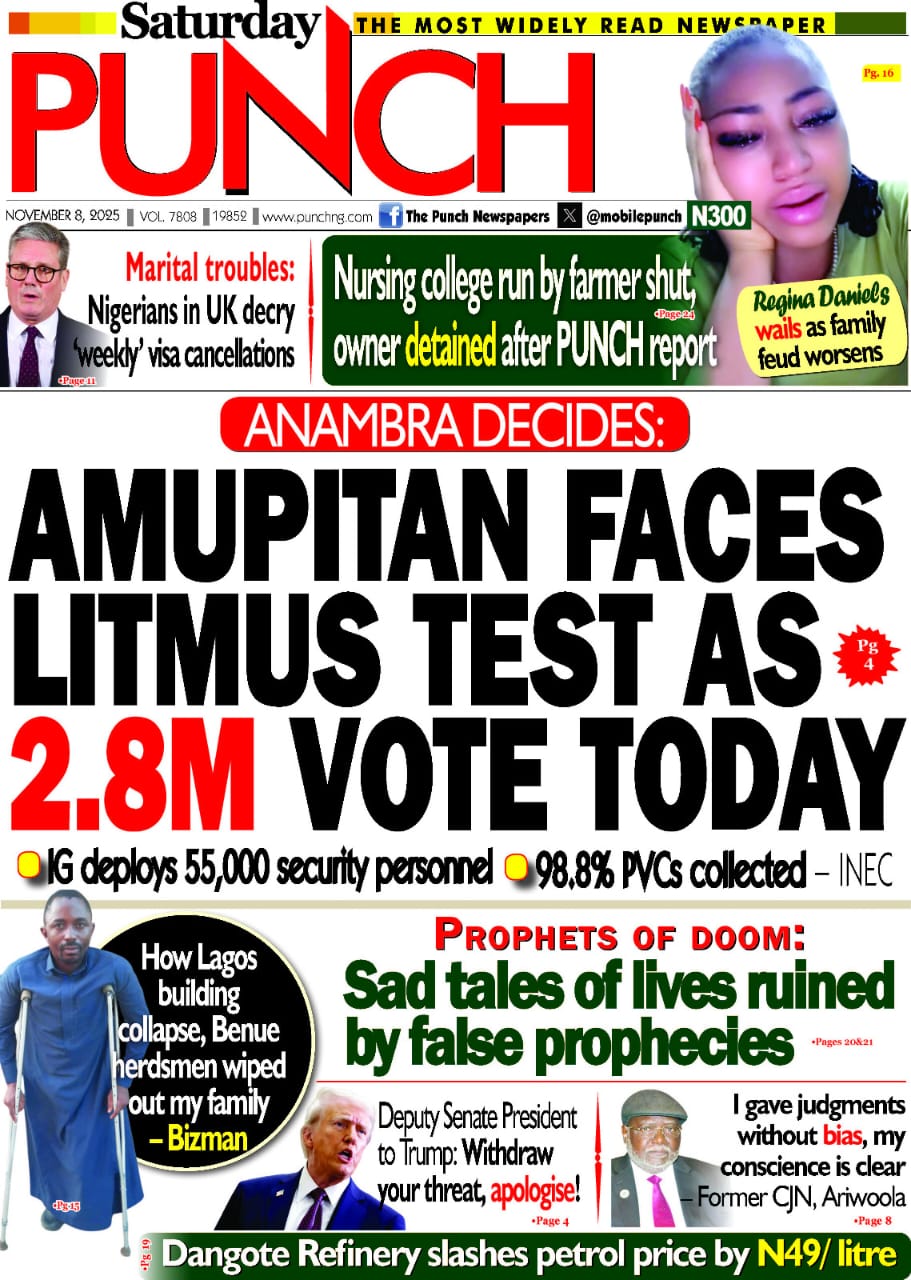 PUNCH reports that Joash Amupitan, chairman of the Independent National Electoral Commission (INEC), faces a major test as 2.8 million voters elect Anambra’s next governor today. The paper adds that Abayomi Shogunle, police commissioner in charge of the Anambra election, says the number of security personnel deployed for the poll has been increased from 45,000 to 55,000.Blueprint newspaper reports that the Independent Media and Policy Initiative (IMPI) has criticised United States President Donald Trump for redesignating Nigeria as a country of particular concern based on misleading data. The paper adds that the Kimpact Development Initiative, a non-governmental organisation (NGO), has asked political actors, security agencies, INEC and the electorate to safeguard Nigeria’s democracy.The Nation reports that the African Union (AU) commission says the US must respect the sovereignty of Nigeria and engage in diplomatic dialogue to address the country’s insecurity challenge. The newspaper says a faction of the Peoples Democratic Party (PDP) led by Abdulrahman Mohammed has inaugurated a new board of trustees (BoT).Daily Trust reports that a federal high court in Abuja has fixed November 20 to deliver judgment in the terrorism trial of Nnamdi Kanu, leader of the Indigenous People of Biafra (IPOB). The paper says residents of border communities in Shanono LGA of Kano have fled their homes following a series of bandit incursions that have left several villages deserted in the past week.New Telegraph reports that no fewer than 240 students of the Federal University of Technology, Akure (FUTA), Ondo, have graduated from the institution with first-class honours across various departments. The newspaper adds that former President Goodluck Jonathan has described his political journey — from obscurity to the office of first citizen of the country — as a miracle.Guardian newspaper reports that Matthew Kukah, bishop of the Catholic diocese of Sokoto, says credible elections are vital, but defecting elected officials should automatically lose their seats. The newspaper reports that five members of an international organised criminal group have been jailed for 21 years over 68.9kg cocaine and tramadol seized at Lagos airport.ThisDay reports that Russia says it is keeping a close watch on developments in Nigeria following statements by Trump suggesting potential American military action in the country. Dele Momodu, a chieftain of the African Democratic Party (ADC), has advised Tinubu to rally Nigerians with international credibility to engage with Trump.