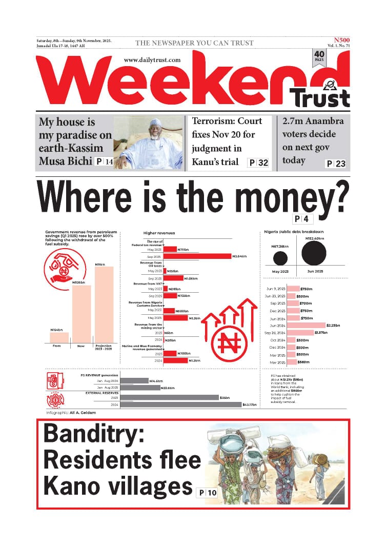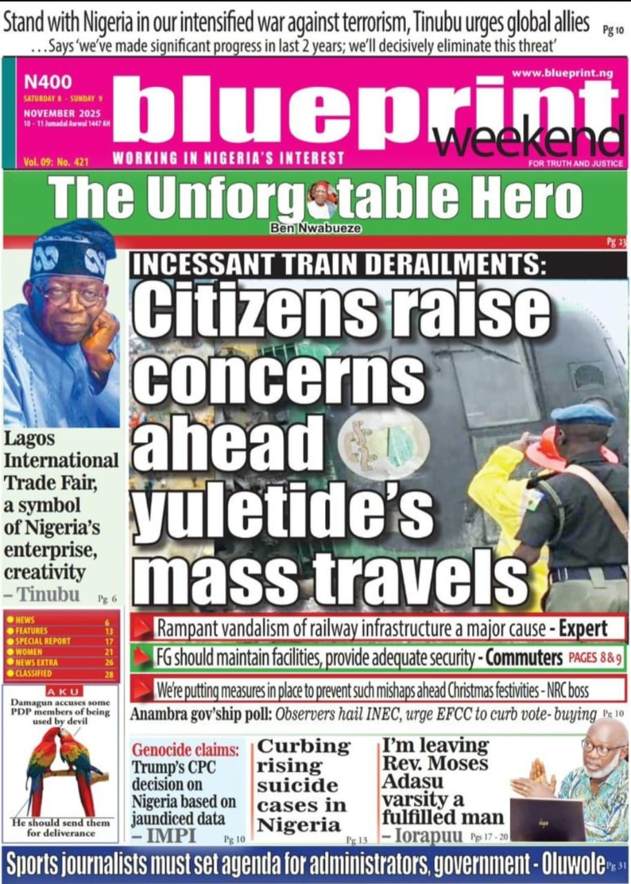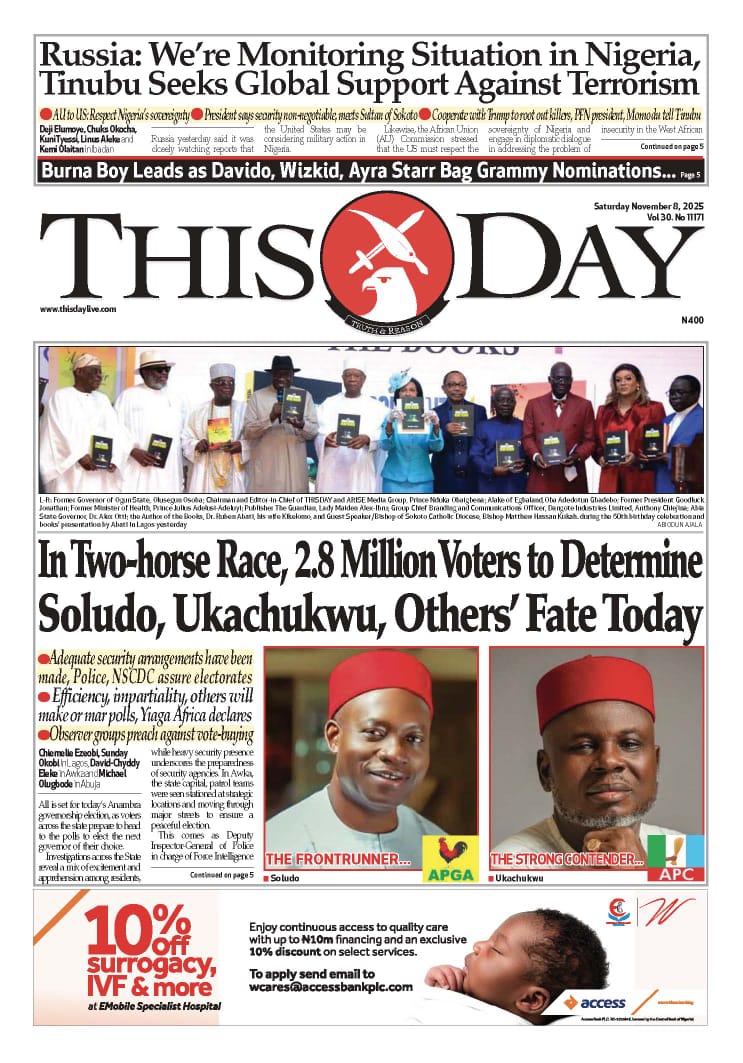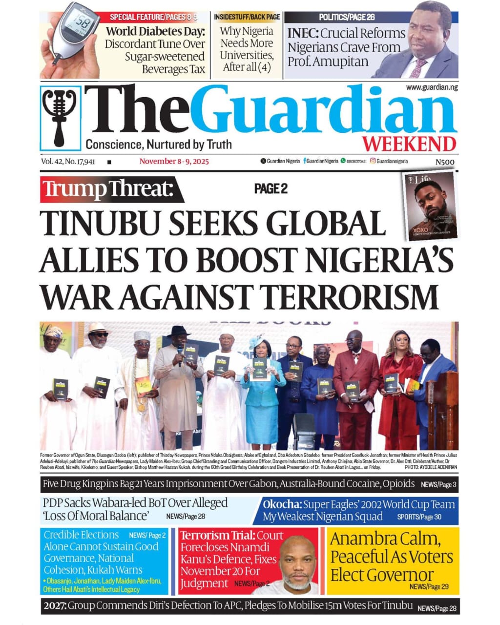 PUNCH reports that Joash Amupitan, chairman of the Independent National Electoral Commission (INEC), faces a major test as 2.8 million voters elect Anambra’s next governor today. The paper adds that Abayomi Shogunle, police commissioner in charge of the Anambra election, says the number of security personnel deployed for the poll has been increased from 45,000 to 55,000.Blueprint newspaper reports that the Independent Media and Policy Initiative (IMPI) has criticised United States President Donald Trump for redesignating Nigeria as a country of particular concern based on misleading data. The paper adds that the Kimpact Development Initiative, a non-governmental organisation (NGO), has asked political actors, security agencies, INEC and the electorate to safeguard Nigeria’s democracy.The Nation reports that the African Union (AU) commission says the US must respect the sovereignty of Nigeria and engage in diplomatic dialogue to address the country’s insecurity challenge. The newspaper says a faction of the Peoples Democratic Party (PDP) led by Abdulrahman Mohammed has inaugurated a new board of trustees (BoT).Daily Trust reports that a federal high court in Abuja has fixed November 20 to deliver judgment in the terrorism trial of Nnamdi Kanu, leader of the Indigenous People of Biafra (IPOB). The paper says residents of border communities in Shanono LGA of Kano have fled their homes following a series of bandit incursions that have left several villages deserted in the past week.New Telegraph reports that no fewer than 240 students of the Federal University of Technology, Akure (FUTA), Ondo, have graduated from the institution with first-class honours across various departments. The newspaper adds that former President Goodluck Jonathan has described his political journey — from obscurity to the office of first citizen of the country — as a miracle.Guardian newspaper reports that Matthew Kukah, bishop of the Catholic diocese of Sokoto, says credible elections are vital, but defecting elected officials should automatically lose their seats. The newspaper reports that five members of an international organised criminal group have been jailed for 21 years over 68.9kg cocaine and tramadol seized at Lagos airport.ThisDay reports that Russia says it is keeping a close watch on developments in Nigeria following statements by Trump suggesting potential American military action in the country. Dele Momodu, a chieftain of the African Democratic Party (ADC), has advised Tinubu to rally Nigerians with international credibility to engage with Trump.