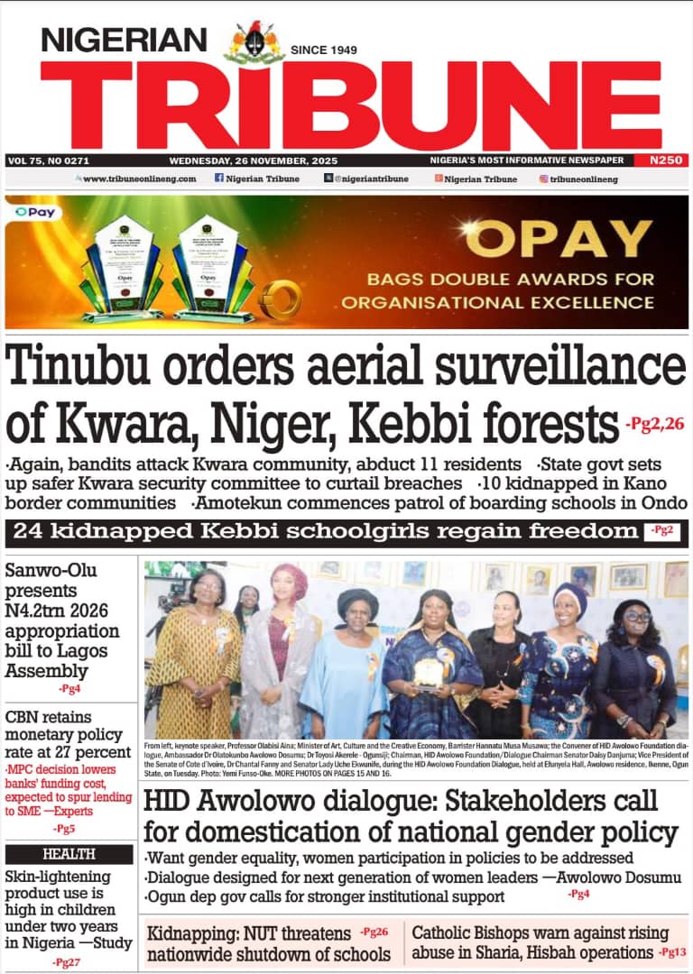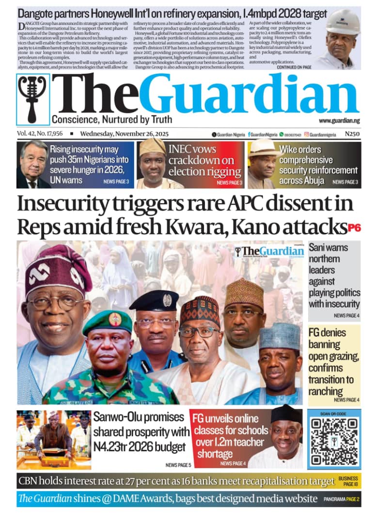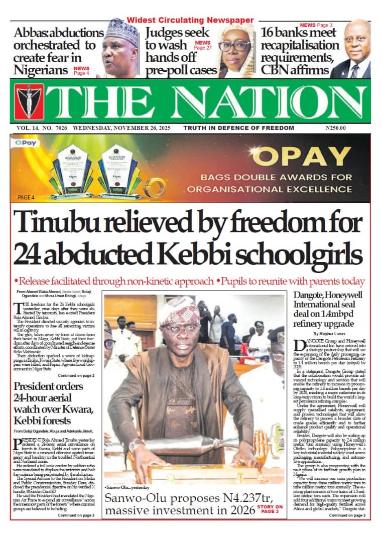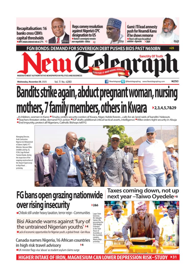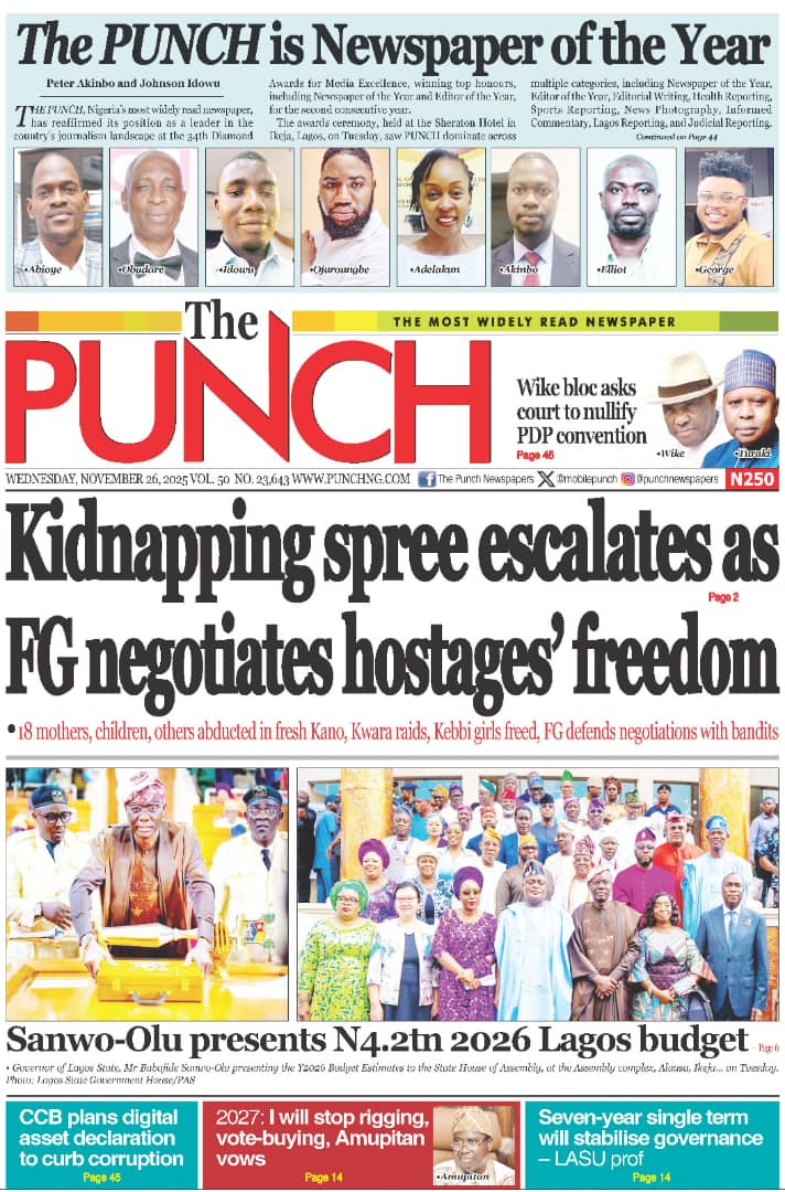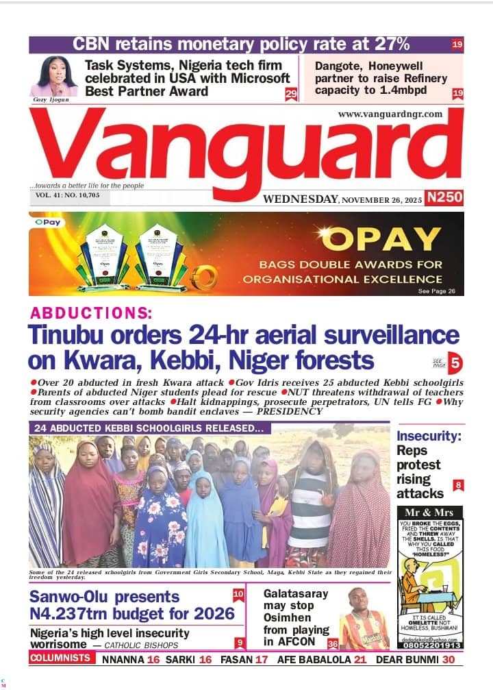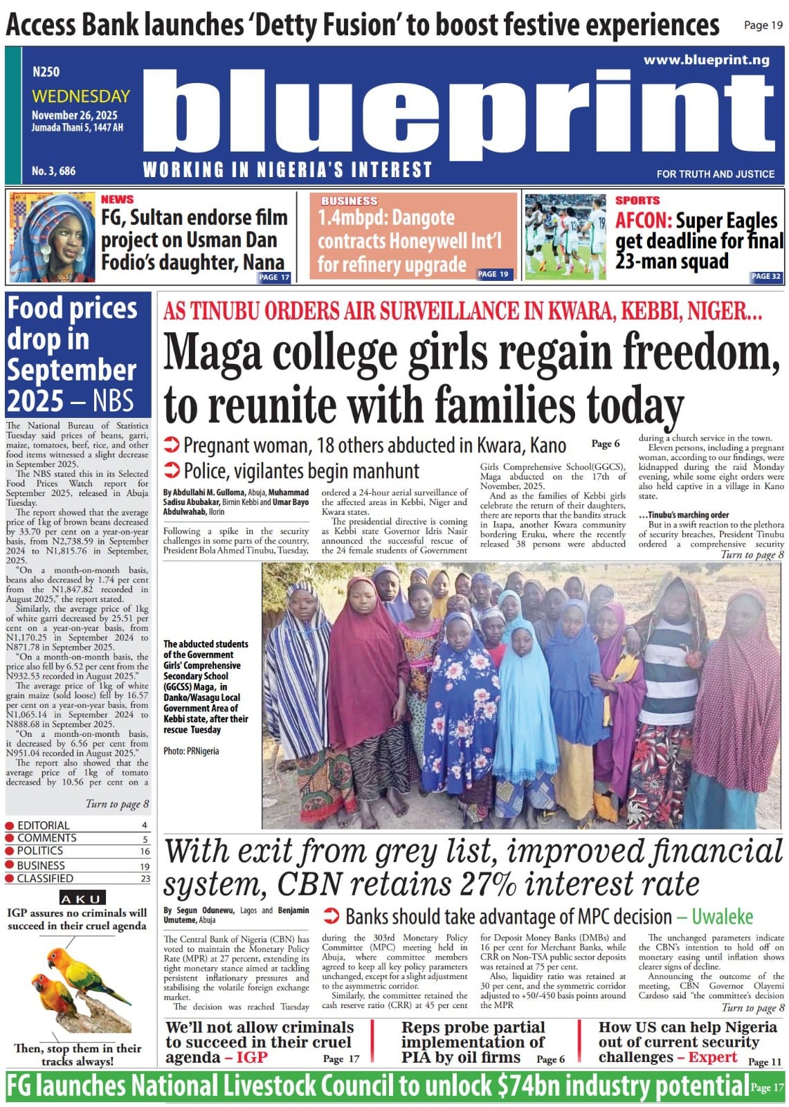 Blueprint reports that the 24 schoolgirls abducted from Government Girls Secondary School, Maga, Kebbi state, have been rescued. The paper adds that at least 10 residents of Isapa community in Ekiti LGA of Kwara state were abducted on Monday by about 20 armed men.The Nation reports that the Central Bank of Nigeria (CBN) says 16 banks have fully met the regulatory capital requirements. The newspaper adds that President Bola Tinubu has welcomed the release of the 24 schoolgirls abducted in Maga, Kebbi state, on November 17.PUNCH reports that Babajide Sanwo-Olu, the Lagos governor, has presented a proposed N4.237 trillion budget for the 2026 fiscal year, to the state house of assembly. The paper reports that Joash Amupitan, chairman of the Independent National Electoral Commission (INEC), has expressed his resolve “to combat all forms of election rigging, including the menace of vote-buying”.Guardian reports that the United Nations World Food Programme (WFP) has warned that growing instability across northern Nigeria, including the surge in attacks, could push nearly 35 million people into severe food insecurity during the 2026 lean season, which is the highest figure ever recorded in the country. The paper says the monetary policy committee (MPC) of the CBN has retained the country’s monetary policy rate (MPR) at 27 percent.Nigerian Tribune reports that the Nigeria Union of Teachers (NUT) has threatened to withdraw all teachers from classrooms nationwide if the federal government fails to immediately bring an end to the rising tide of abductions and killings targeting schools. The newspaper says at least eight people have been abducted during a late-night raid on Biresawa village in the Tsanyawa LGA of Kano state.New Telegraph reports that Tajudeen Abbas, speaker of the house of representatives, says the national assembly has formally conveyed its resolution to the United States government, rejecting Nigeria’s designation as a ‘country of particular concern (CPC)’ under the Religious Freedom Accountability Act of 2025. The paper adds that Ahmad Gumi, the Kaduna-based Islamic cleric, says he is prepared to personally lead a campaign for amnesty for Nnamdi Kanu, the convicted leader of the proscribed Indigenous People of Biafra (IPOB), if the separatist agitator publicly renounces violence.Vanguard reports that the Catholic Bishops’ Conference of Nigeria (CBCN) says it has received “disturbing reports” of delayed or withheld security responses on attacks in several predominantly Christian communities. The paper adds that Bayo Onanuga, special adviser on information and strategy to the president, says non-kinetic approach was deployed in securing the release of the 38 worshippers of a church in Kwara state.