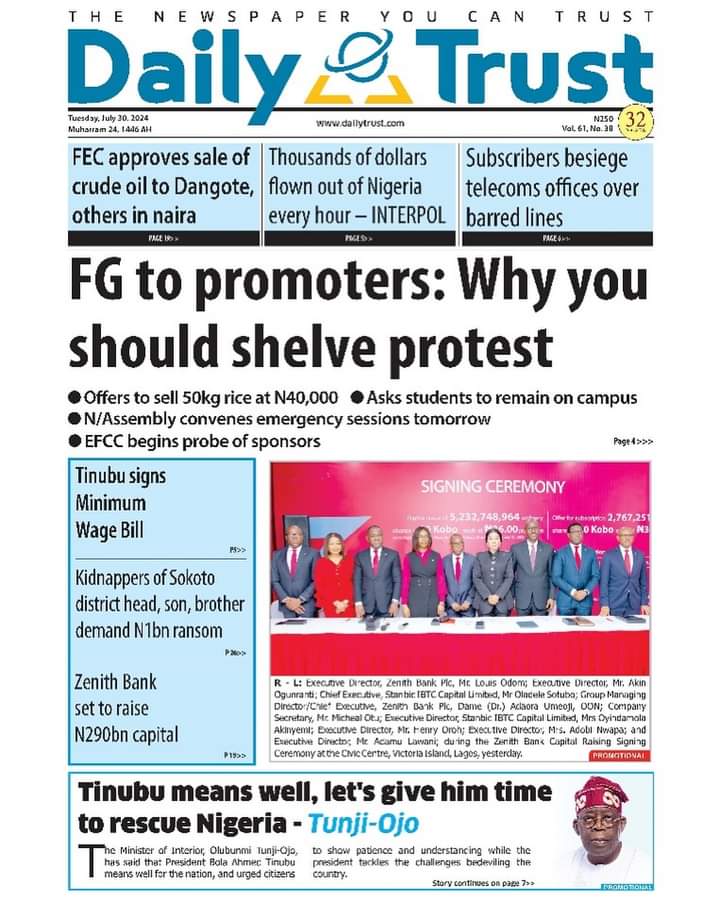 The Punch reports that the military and police have commenced a massive nationwide deployment of soldiers and police officers ahead of the August 1 protest. The newspaper says President Bola Tinubu has signed the minimum wage bill into law.Daily Trust reports that the federal government has urged youths and other aggrieved Nigerians to shelve their planned protest. The newspaper says subscribers besieged MTN offices in some parts of the country on Monday over barred telephone lines.THISDAY reports that President Bola Tinubu has directed the Nigerian National Petroleum Company Limited (NNPCL) to sell crude oil to Dangote Refinery and other local refineries in naira. The newspaper says the Nigerian Communications Commission (NCC) has ordered telecommunication operators to immediately reconnect all phone lines that were blocked as part of the NIN-SIM verification exercise.The Nation reports that the Police Service Commission (PSC) has announced the training of successful candidates of the police constable recruitment exercise to August 10. The newspaper says the supreme court has announced that Olukayode Ariwoola will retire as chief justice of Nigeria (CJN) on August 22.
