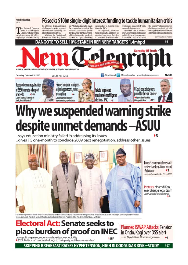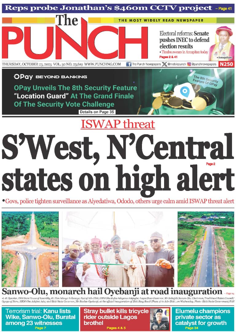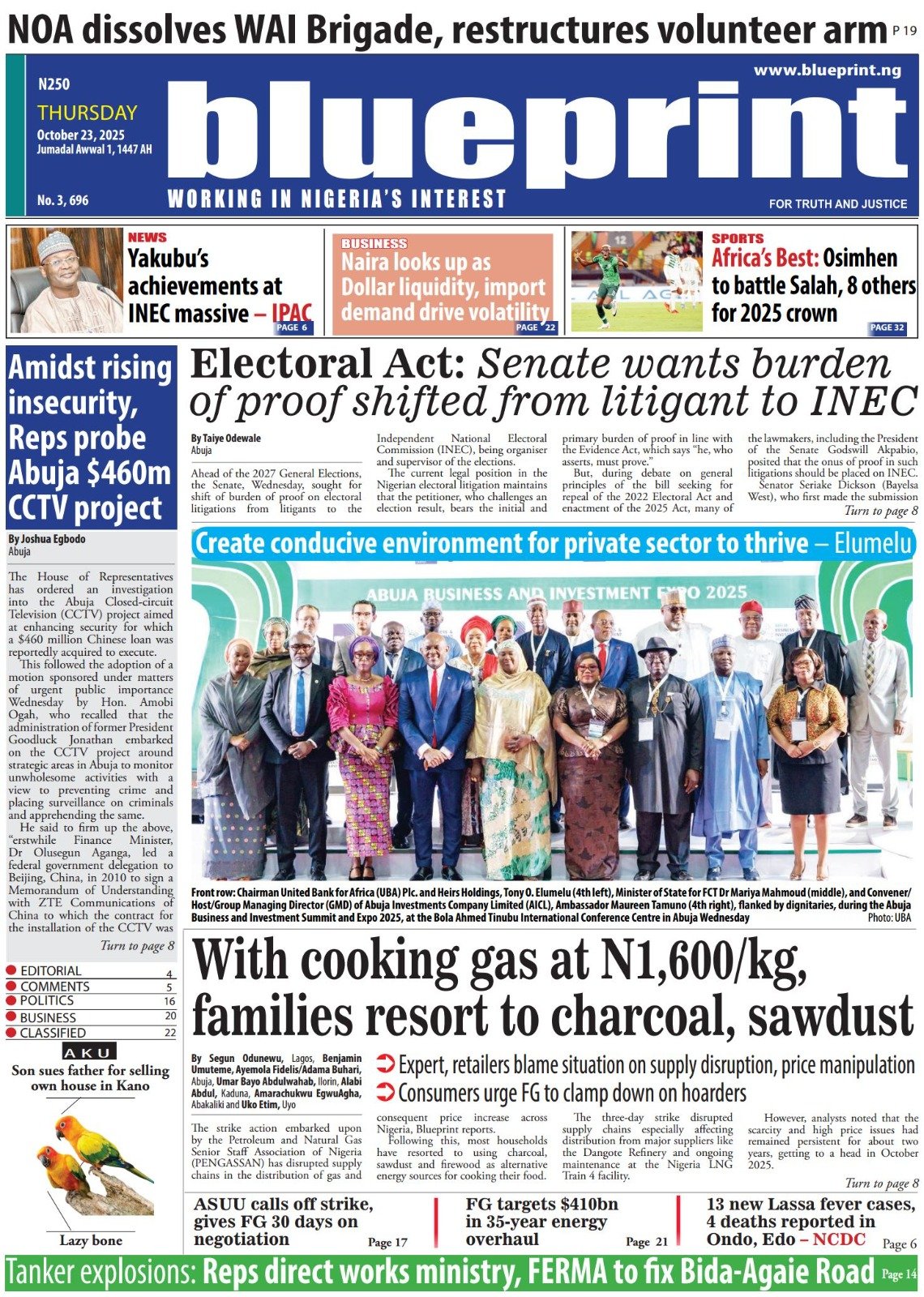 Blueprint newspaper reports that the senate has called for the transfer of the burden of proof in election petitions from aggrieved candidates to the Independent National Electoral Commission (INEC) — the body that conducts and supervises elections. The newspaper says the Inter-Party Advisory Council (IPAC) has commended Mahmood Yakubu, the immediate past chairman of the Independent National Electoral Commission (INEC), for “significantly reforming” Nigeria’s electoral system through the extensive use of technology.Daily Independent reports that the house of representatives has resolved to investigate the “failed” $460 million closed-circuit television (CCTV) project in the federal capital territory (FCT). The newspaper says President Bola Tinubu has approved a two-year tenure extension for Abuduganiyu Adebomehin, surveyor-general of the federation.Daily Trust reports that the northern stakeholders and leaders of the Peoples Democratic Party (PDP) have endorsed Kabiru Turaki, former minister of special duties and intergovernmental affairs, as the consensus candidate for the position of the party’s national chairman. The paper adds that Aliko Dangote says Dangote Petroleum Refinery plans to sell 5 percent to 10 percent of its stake on the Nigerian Exchange (NGX) Limited within the next year.The Nation reports that Nnamdi Kanu, leader of the proscribed Indigenous People of Biafra (IPOB), has indicated readiness to open his defence, listing 23 witnesses including top political and military figures. The paper adds that the Ondo state government says a leaked security memo from the Department of State Services (DSS) warning of a possible terrorist attack in the state is “part of regular intelligence reports”.The Punch reports that following the DSS alert on Tuesday that there was a plot by the Islamic State West Africa Province to attack Ondo and Kogi states, states have activated surveillance and counter-terror measures against the ISWAP plot. The paper says Tony Elumelu, group chairman of United Bank for Africa (UBA) Plc, has called on African policymakers to create a stable business environment that encourages the private sector to flourish.New Telegraph reports that ASUU has suspended its two-week warning strike. The paper says from January 1, 2027, foreign students in the UK will have only 18 months to find employment after graduation, down from the current two years.Vanguard newspaper reports that Chukwuma Soludo, the Anambra governor, has described his second-term re-election bid as “a divine project and a mass movement” which ignites a sense of collective purpose and commitment to continued development in the state. The paper says Umar Bago, governor of Niger, has vowed never to negotiate with bandits or pay ransom for kidnap victims, saying residents must instead be prepared to defend themselves against attacks.
