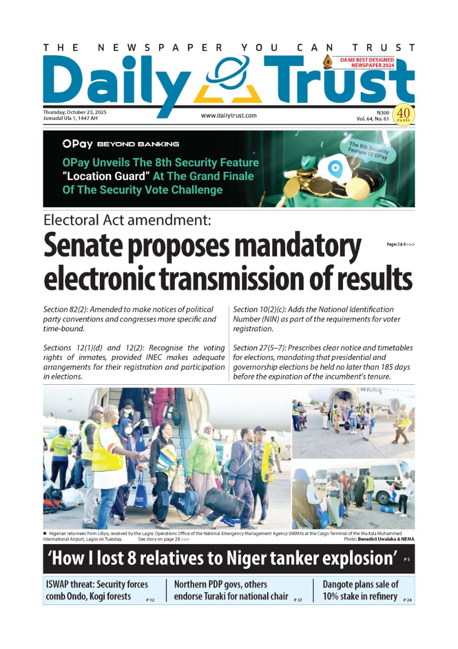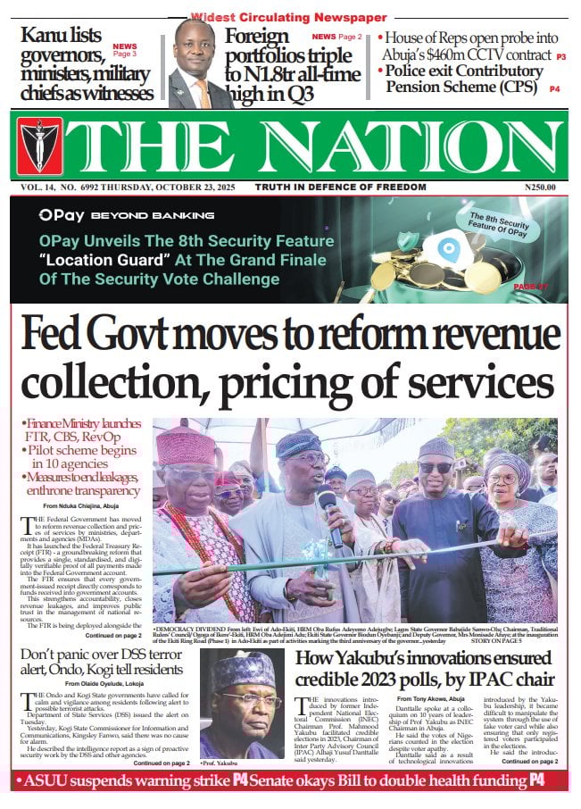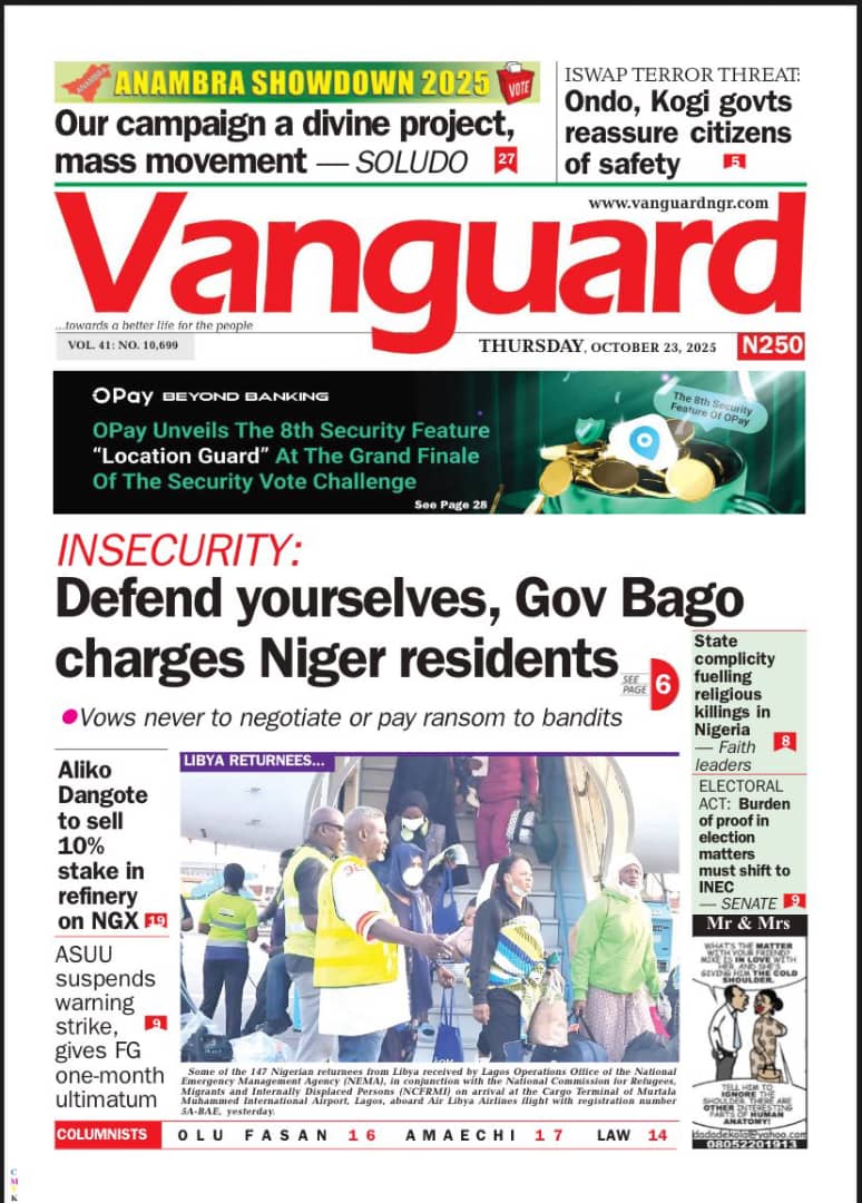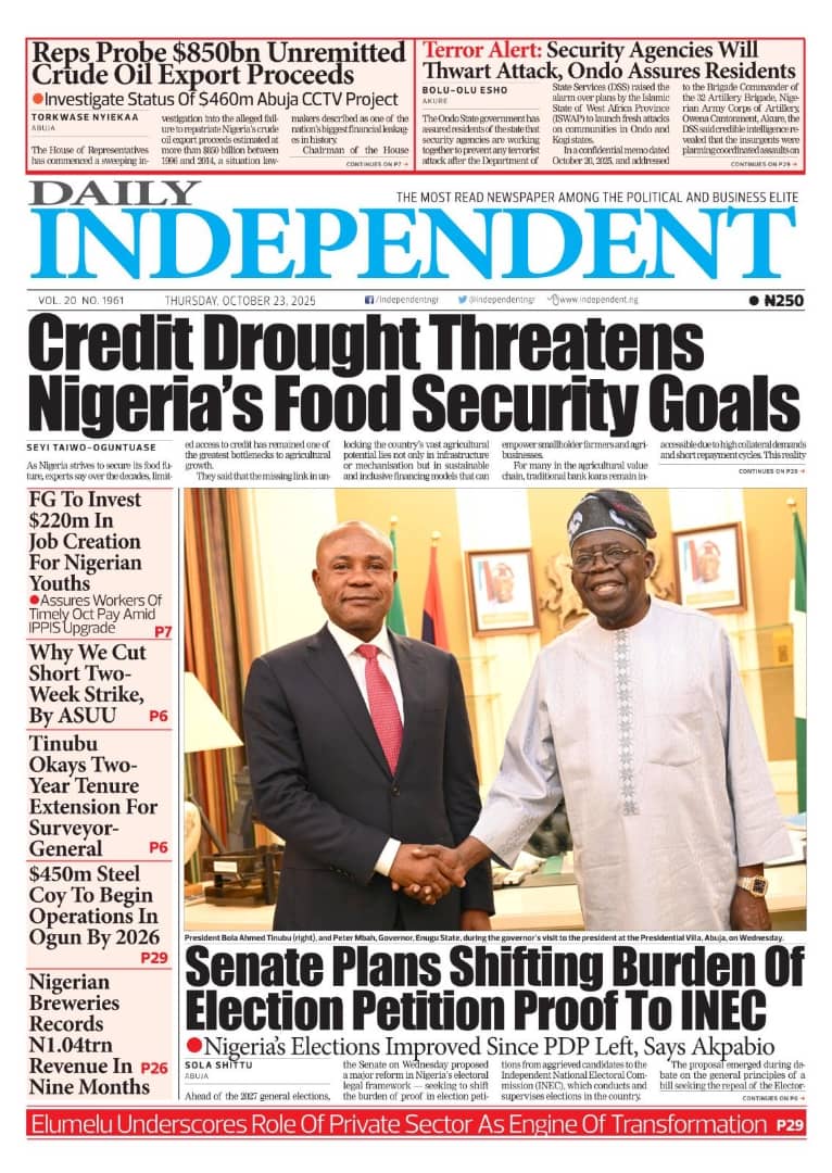 Blueprint newspaper reports that the senate has called for the transfer of the burden of proof in election petitions from aggrieved candidates to the Independent National Electoral Commission (INEC) — the body that conducts and supervises elections. The newspaper says the Inter-Party Advisory Council (IPAC) has commended Mahmood Yakubu, the immediate past chairman of the Independent National Electoral Commission (INEC), for “significantly reforming” Nigeria’s electoral system through the extensive use of technology.Daily Independent reports that the house of representatives has resolved to investigate the “failed” $460 million closed-circuit television (CCTV) project in the federal capital territory (FCT). The newspaper says President Bola Tinubu has approved a two-year tenure extension for Abuduganiyu Adebomehin, surveyor-general of the federation.Daily Trust reports that the northern stakeholders and leaders of the Peoples Democratic Party (PDP) have endorsed Kabiru Turaki, former minister of special duties and intergovernmental affairs, as the consensus candidate for the position of the party’s national chairman. The paper adds that Aliko Dangote says Dangote Petroleum Refinery plans to sell 5 percent to 10 percent of its stake on the Nigerian Exchange (NGX) Limited within the next year.The Nation reports that Nnamdi Kanu, leader of the proscribed Indigenous People of Biafra (IPOB), has indicated readiness to open his defence, listing 23 witnesses including top political and military figures. The paper adds that the Ondo state government says a leaked security memo from the Department of State Services (DSS) warning of a possible terrorist attack in the state is “part of regular intelligence reports”.The Punch reports that following the DSS alert on Tuesday that there was a plot by the Islamic State West Africa Province to attack Ondo and Kogi states, states have activated surveillance and counter-terror measures against the ISWAP plot. The paper says Tony Elumelu, group chairman of United Bank for Africa (UBA) Plc, has called on African policymakers to create a stable business environment that encourages the private sector to flourish.New Telegraph reports that ASUU has suspended its two-week warning strike. The paper says from January 1, 2027, foreign students in the UK will have only 18 months to find employment after graduation, down from the current two years.Vanguard newspaper reports that Chukwuma Soludo, the Anambra governor, has described his second-term re-election bid as “a divine project and a mass movement” which ignites a sense of collective purpose and commitment to continued development in the state. The paper says Umar Bago, governor of Niger, has vowed never to negotiate with bandits or pay ransom for kidnap victims, saying residents must instead be prepared to defend themselves against attacks.