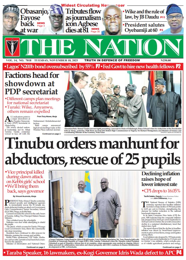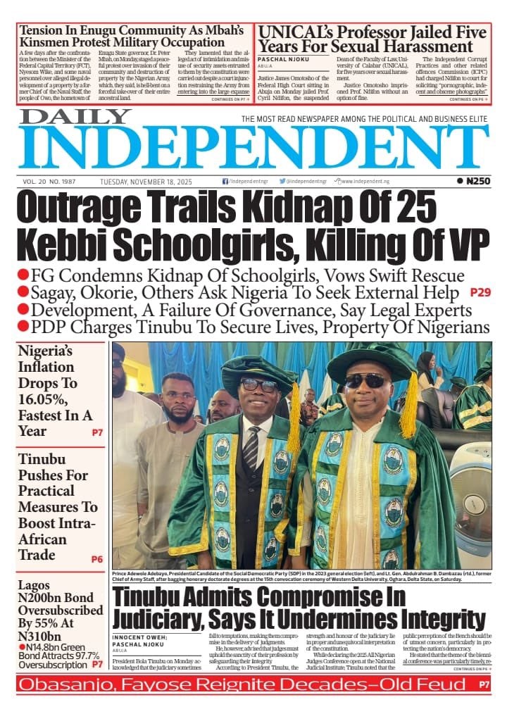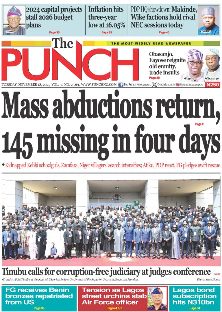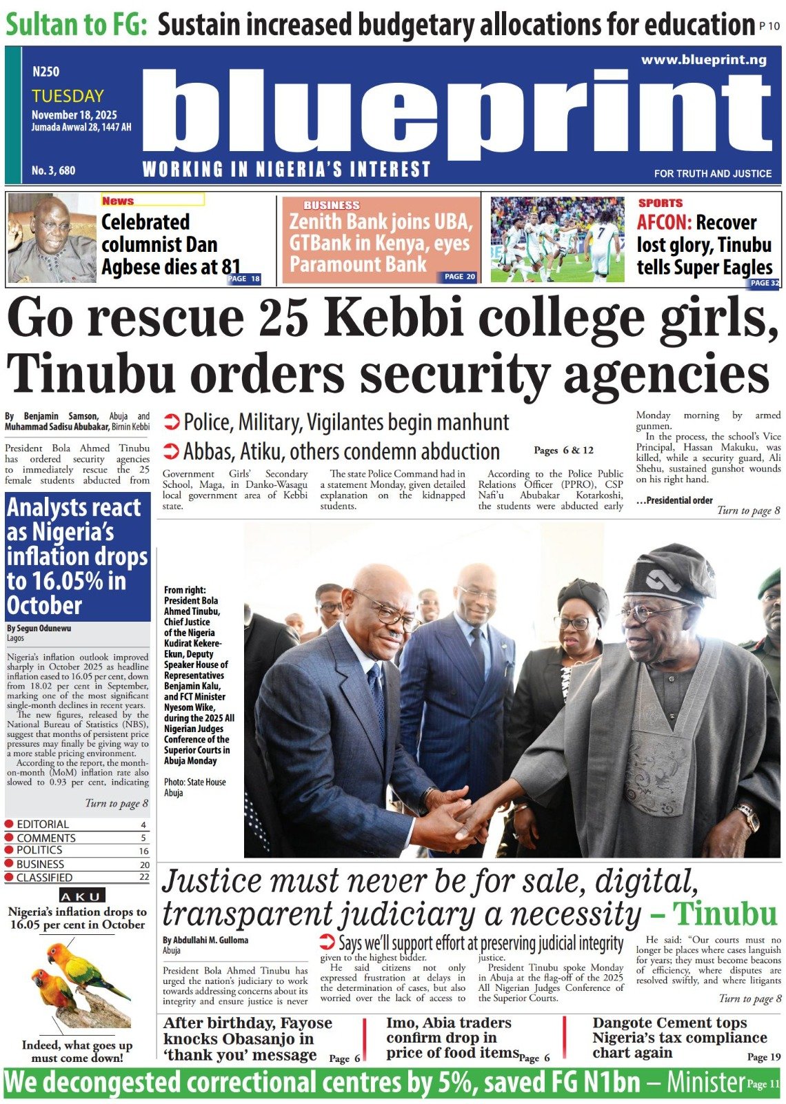 Blueprint reports that Mohammed Idris, minister of information and national orientation, says President Bola Tinubu has ordered the swift rescue of the female students abducted from Government Girls Secondary School in Maga, Kebbi state. The paper adds that Tinubu says no judicial reform can succeed without integrity, warning that corruption within the judiciary poses a grave danger to Nigeria’s democracy.