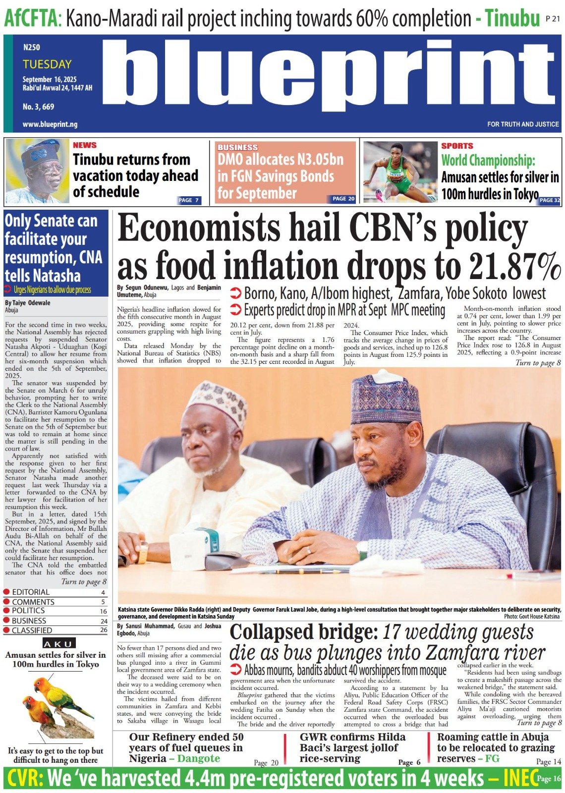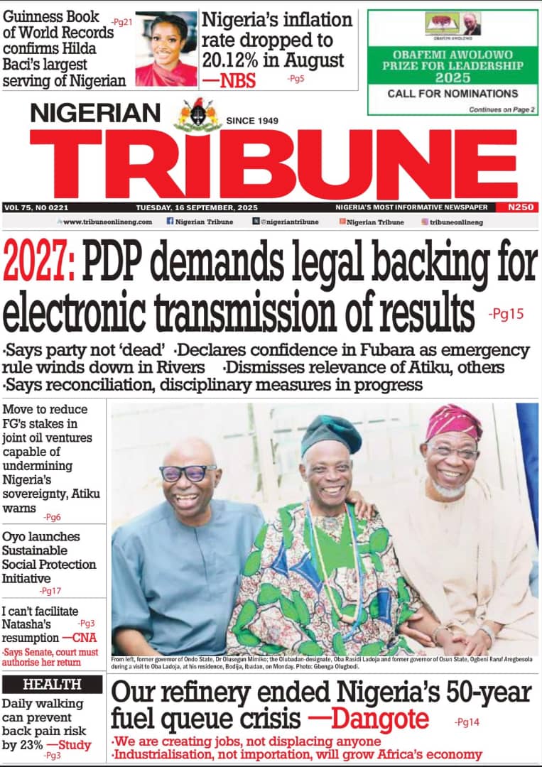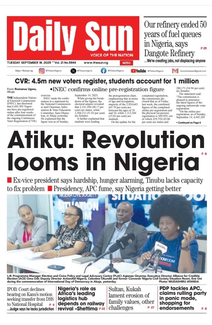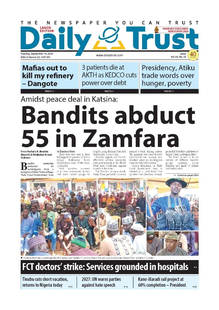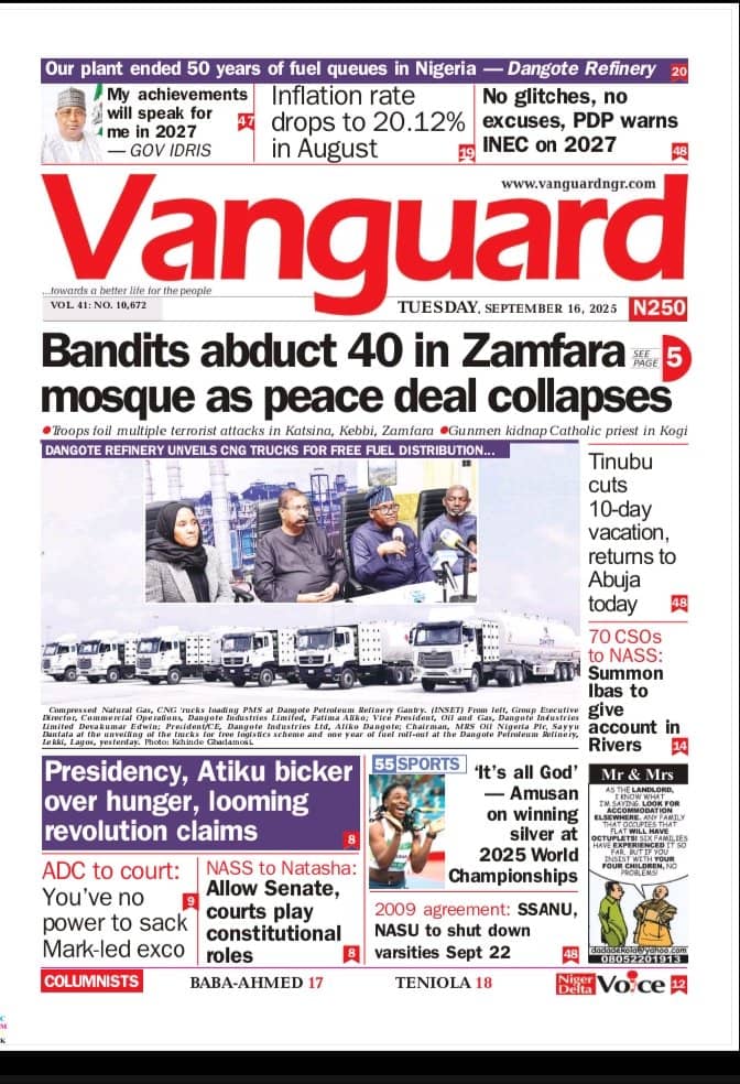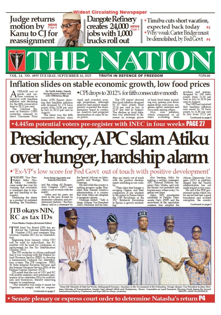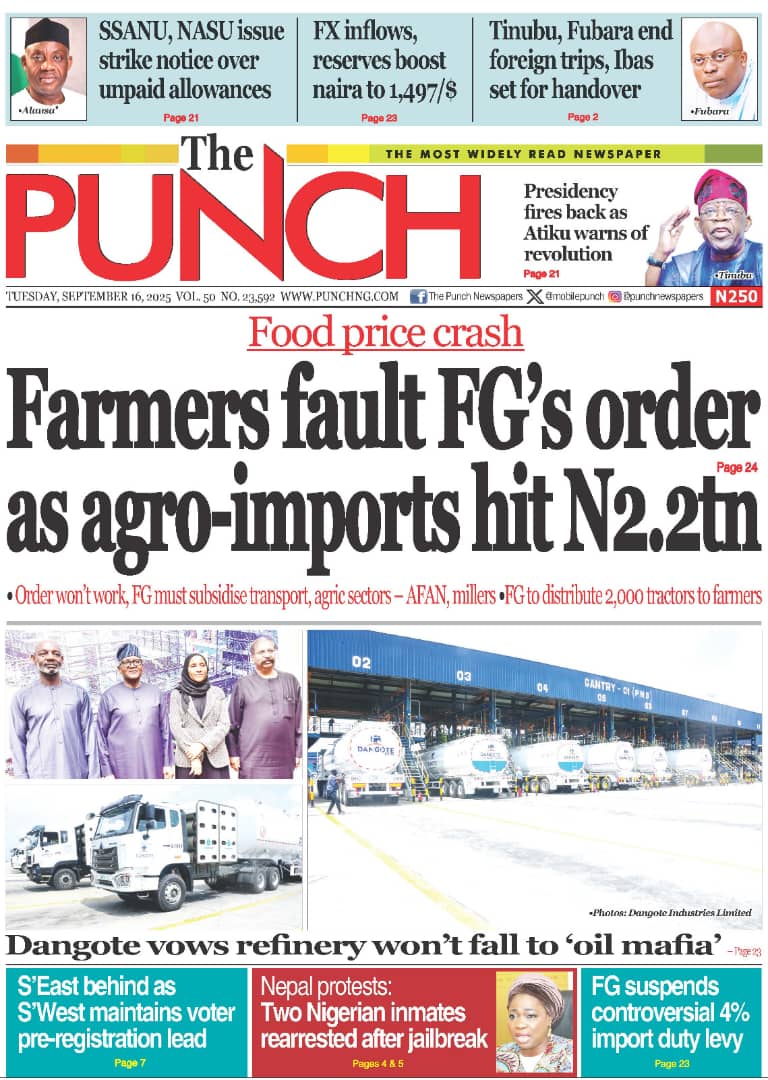 The PUNCH reports that two Nigerians who allegedly escaped from a prison in Nepal during recent anti-government protests have been arrested by operatives of the Sashastra Seema Bal, India’s paramilitary force. The paper adds that the joint action committee (JAC) of the Non-Academic Staff Union (NASU) and the Senior Staff Association of Nigerian Universities (SSANU) has issued a seven-day ultimatum to the federal government, threatening to embark on an indefinite strike.The Nation reports that Musa Liman, a judge of the federal high court in Abuja, has declined to hear an application filed by Nnamdi Kanu, the detained leader of the proscribed Indigenous People of Biafra (IPOB), seeking to be moved from the Department of State Services (DSS) custody to the National Hospital in the federal capital territory (FCT) for medical treatment. The paper notes that Aliko Dangote, president of Dangote Group, says the Dangote Petroleum Refinery has not displaced jobs, instead, it is creating employment opportunities.Nigerian Tribune reports that former Vice-President Atiku Abubakar says poor Nigerians are dying of “pervasive hunger”. The newspaper adds that the National Bureau of Statistics (NBS) says Nigeria’s inflation rate declined to 20.12 percent in August — down from 21.88 percent in July.Blueprint newspaper reports that the office of the clerk to the national assembly says it lacks the power to allow Natasha Akpoti-Uduaghan, the suspended senator representing Kogi central, to resume legislative duties. The paper adds that the Independent National Electoral Commission (INEC) says 509,929 Nigerians have completed their voter registration process.Daily Trust reports that President Bola Tinubu has ended his work vacation and will return to Abuja on Tuesday, September 16. The paper adds that the Association of Resident Doctors in the federal capital territory (ARD-FCT) has declared an indefinite strike, citing unpaid salary arrears, poor welfare conditions, and the collapse of health facilities in Abuja.Vanguard newspaper reports that armed bandits have reportedly abducted more than 50 people in separate attacks in Zamfara state. The newspaper adds that the Peoples Democratic Party (PDP) has called for strict implementation of legal framework mandating the electronic transmission of election results in the 2027 general election.Daily Sun reports that Matthew Kukah, Catholic bishop of the Sokoto diocese, says youths lured into crime are products of poor upbringing. The newspaper adds that Vice-President Kashim Shettima says the only way Nigeria can maintain its lead as the logistics hub of Africa is to revive and revitalise the nation’s railway services.