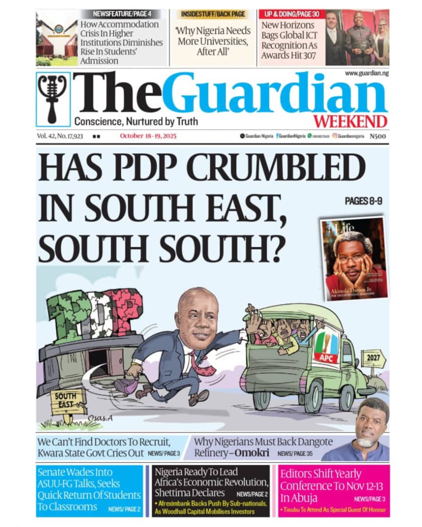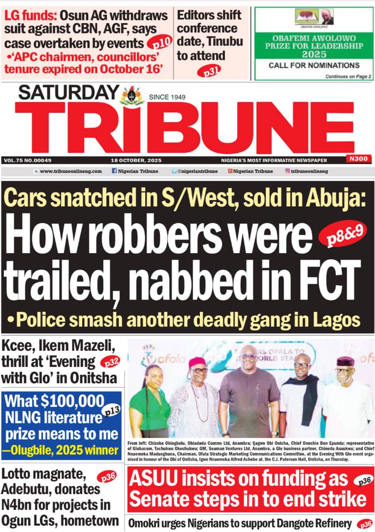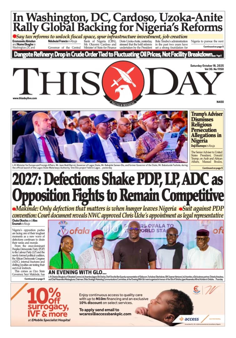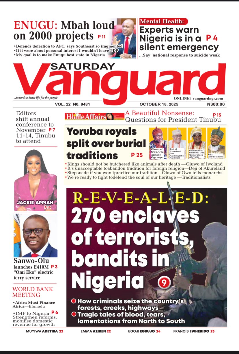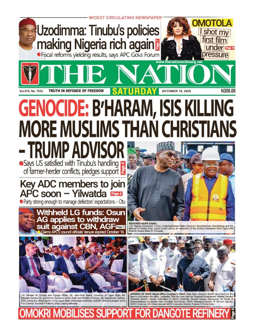Guardian reports that Nyesom Wike, minister of the federal capital territory (FCT), has denied rumours of a 2027 presidential ambition, reaffirming his loyalty to President Bola Tinubu. The newspaper says bandits and illegal miners’ clash over gold claimed 17 lives in Kaduna.Tribune says the attorney-general of Osun has filed a notice of withdrawal of the suit he instituted against the Central Bank of Nigeria (CBN) and the accountant-general of the federation (AGF), seeking to stop the federal government from releasing withheld local government funds.The Nation says Massad Boulos, a senior advisor to US President Donald Trump on Arab and African affairs, has dismissed recent claims of Christian persecution in Nigeria. The newspaper reports that Trinity Usman, a witness of the Economic and Financial Crimes Commission (EFCC), has told the court that he received and transferred $3 million into Aisha Achimugu’s company account.Vanguard reports that there are 270 enclaves of terrorists, bandits in Nigeria. The newspaper highlights the lives of pregnant and homeless women abandoned inside a camp in Plateau.THISDAY reports that Dangote refinery said the drop in crude order is tied to fluctuating oil prices not a breakdown of its facility. The newspaper says the Federation Account Allocation Committee (FAAC) shared a total of N2.103 trillion to the three tiers of government as federation revenue for the month of September 2025.Punch reports that unusual cough and fever have stirred panic in Lagos. The newspaper says Nnaemeka Achebe, Obi of Onitsha, said political attention has shifted to the 2027 general election as hunger, poverty, and insecurity continue to afflict millions of Nigerians.